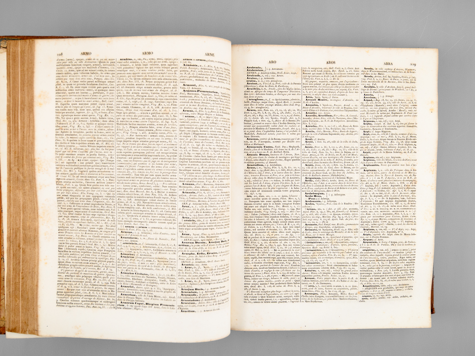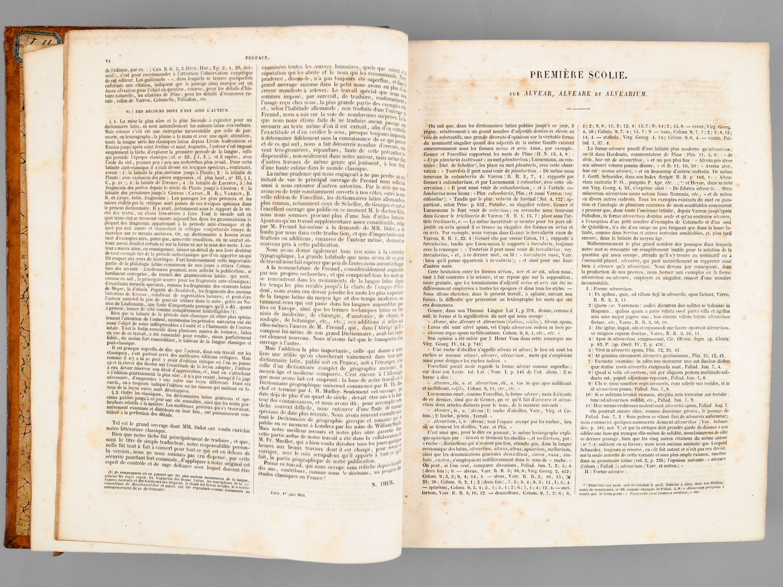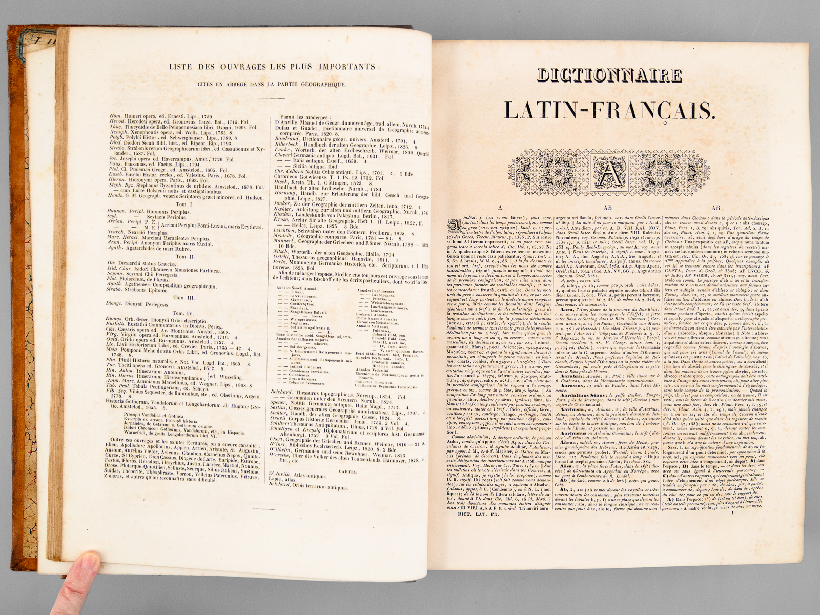 Traduit en français, revue sur les textes et considérablement augmenté, d'après les travaux lexicogaphiques et épigraphiques les plus récents, français et étrangers, 2 vol. in-folio reliure postérieure pleine basane racinée, dos à 4 nerfs dorés, Librairie de Firmin Didot Frères, Paris, 1855, 1862, 1865, 2 ff., XXXV-1160 pp. ; 2 ff., 957 pp., 2 ff., 612 pp. Commentaire : Rare exemplaire bien complet des 3 tomes du 'Grand Dictionnaire de la Langue Latine' du philologue juif prussien Wilhelm Freund (1806-1884), dans l'édition originale de la traduction, très augmentée, établie par le philologue Jean-François-Napoléon Theil, né à Langon en 1808. Etat très satisfaisant (accrocs avec mq. en coiffes, reliure frottées mais bien solides, bon état par ailleurs).