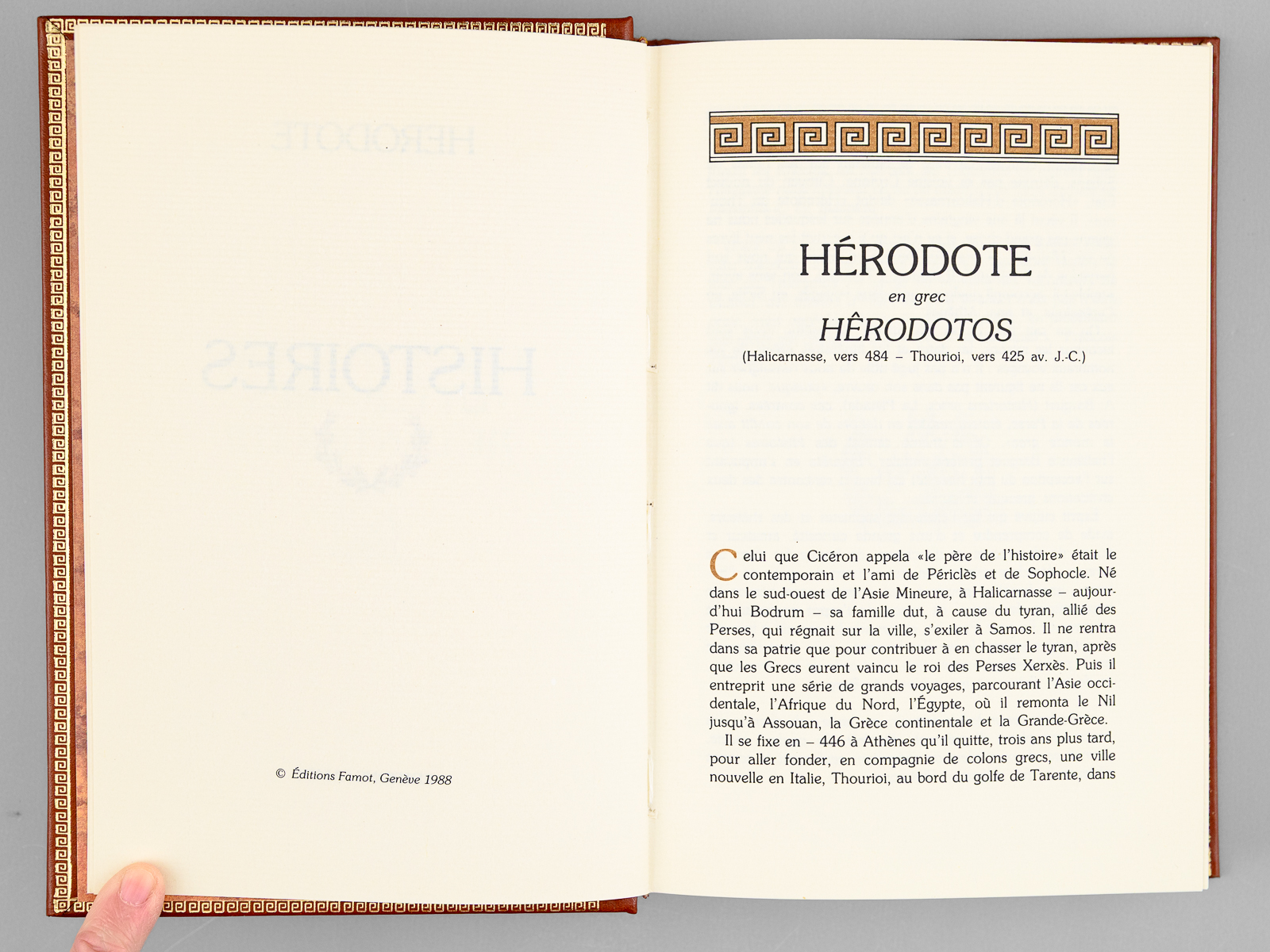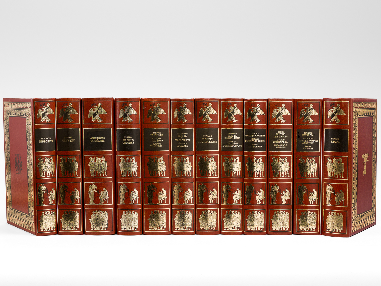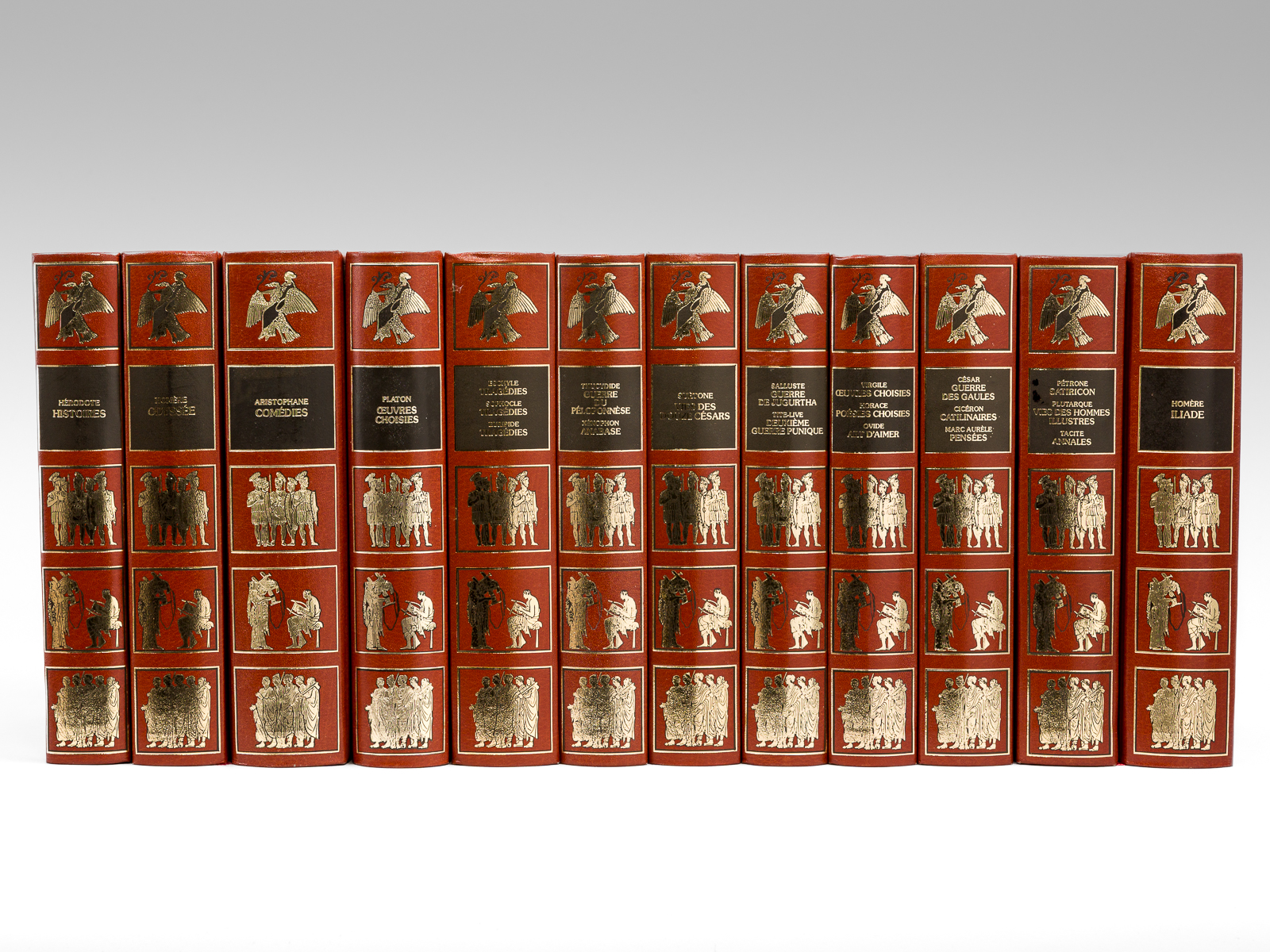 12 vol. in-8 cartonnage éditeur richement orné, Editions Famot, 1988. Liste des titres : Homère : L'Iliade ; Homère : L'Odyssée ; Hérodote : Histoires ; Platon : Oeuvres Choisies ; Eschyle, Sophocle, Euripide : Tragédies ; Thucydide : Guerre du Péloponnèse - Xénophon : Anabase ; Suétone : Vies des Douze Césars ; Salluste : Guerre de Jugurtha - Tite-Live : Deuxième Guerre Punique ; Vigrile : Oeuvres choisies - Horace : Poésies choisies - Ovide : Art d'Aimer ; César : Guerre des Gaules - Cicéron : Catilinaires - Marc-Aurèle : Pensées ; Pétrone : Satiricon - Plutarque : Vies des Hommes illustres - Tacite : Annales