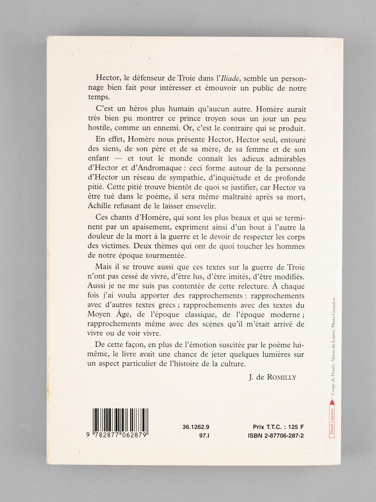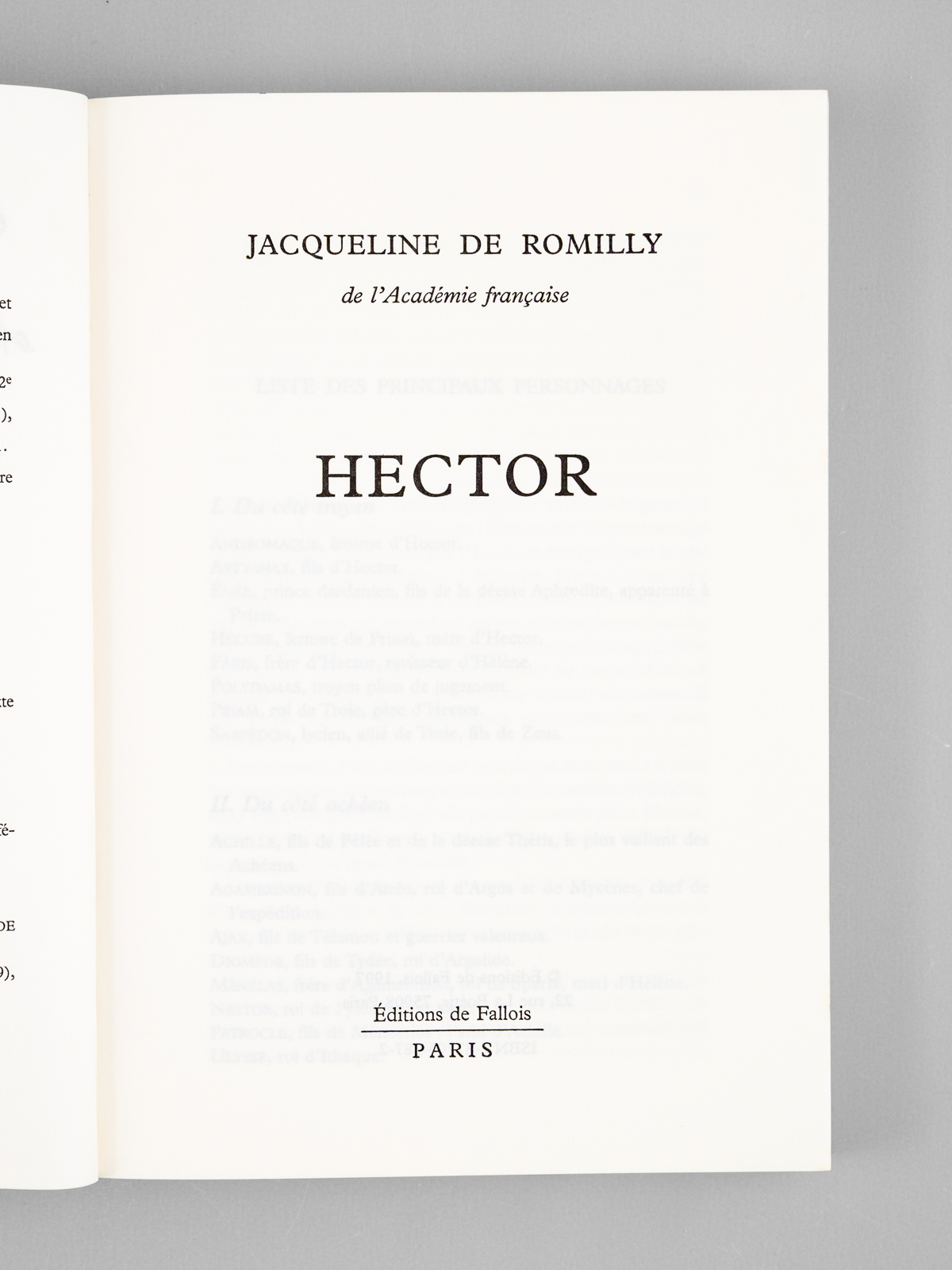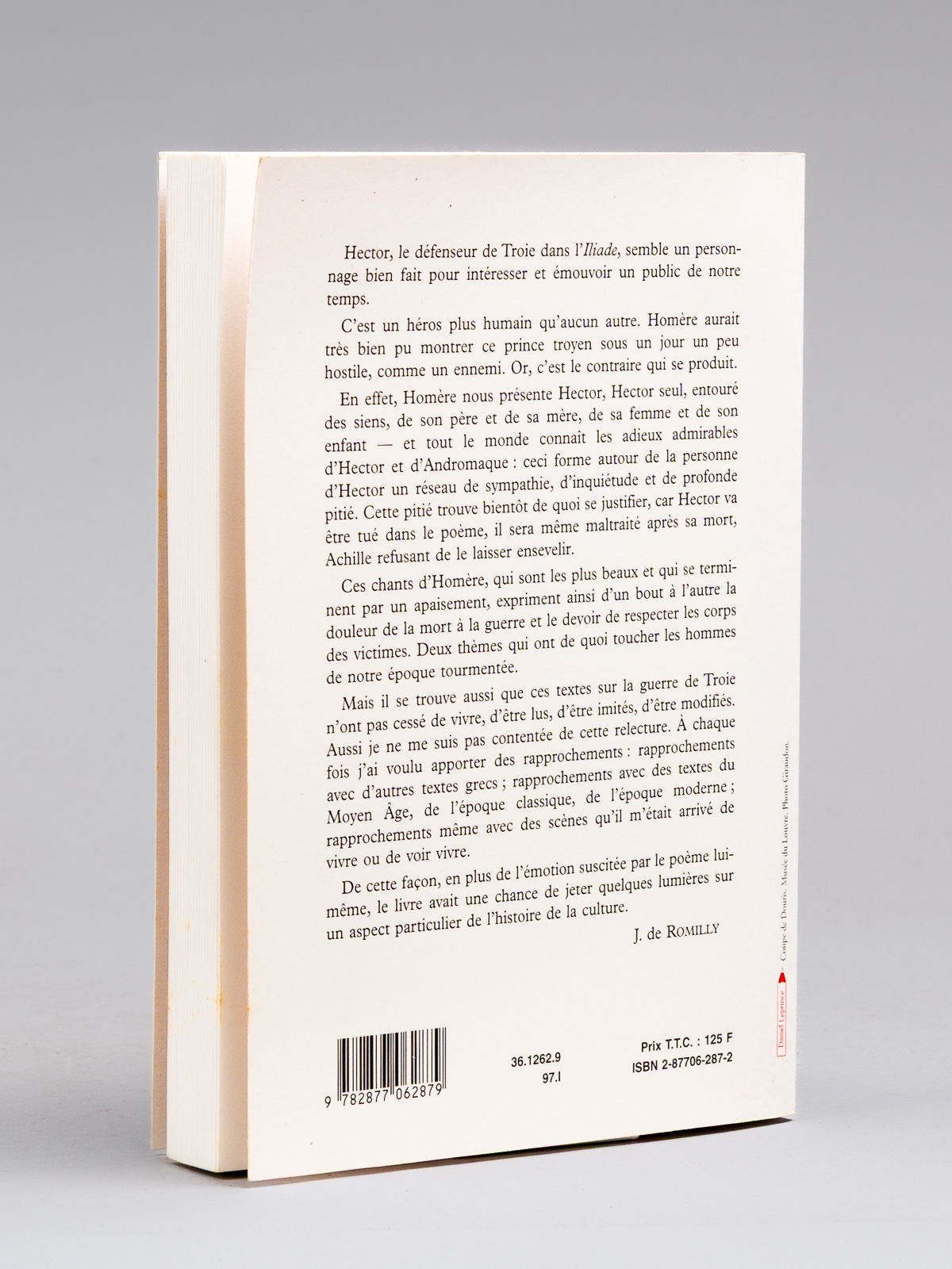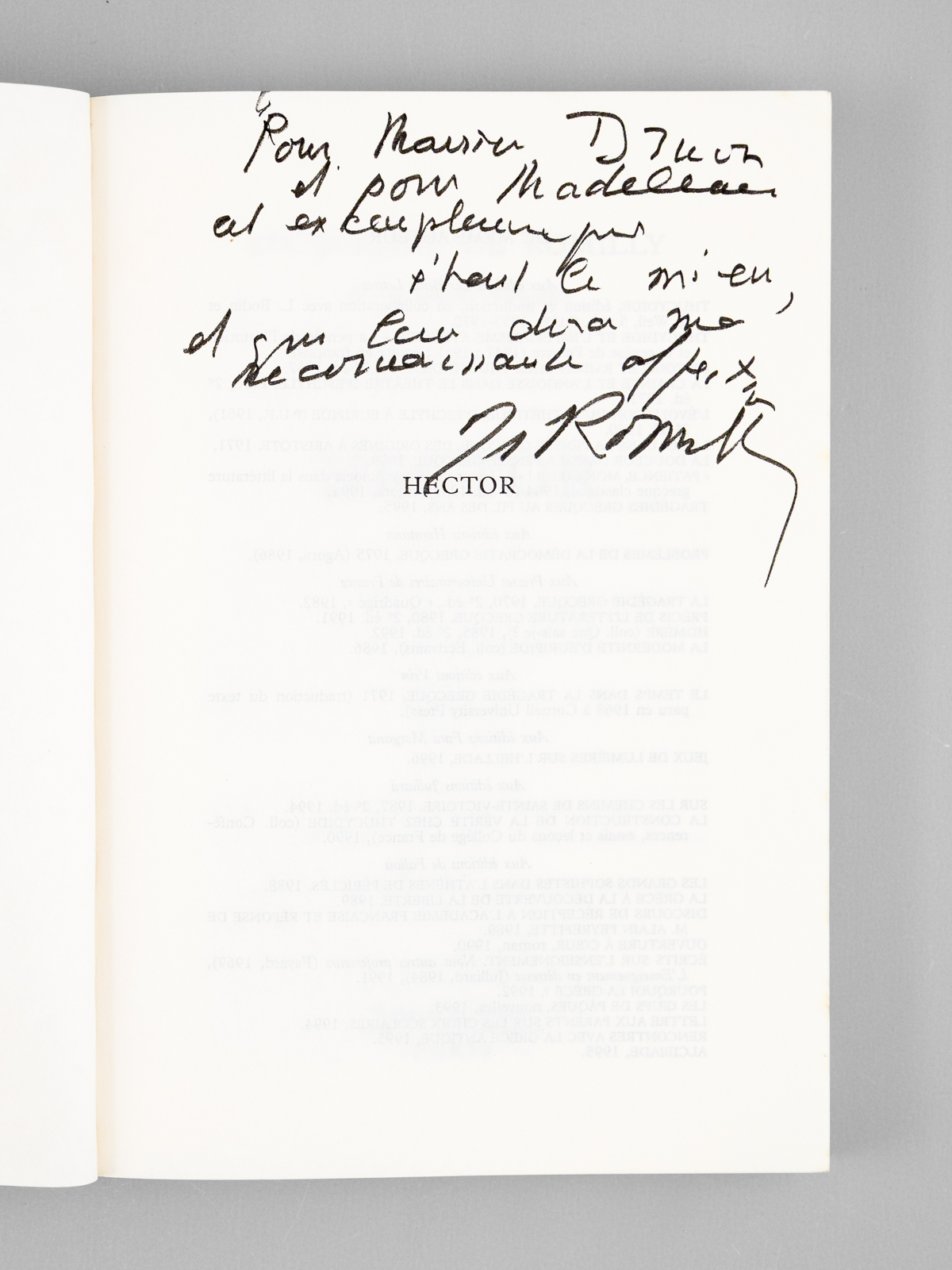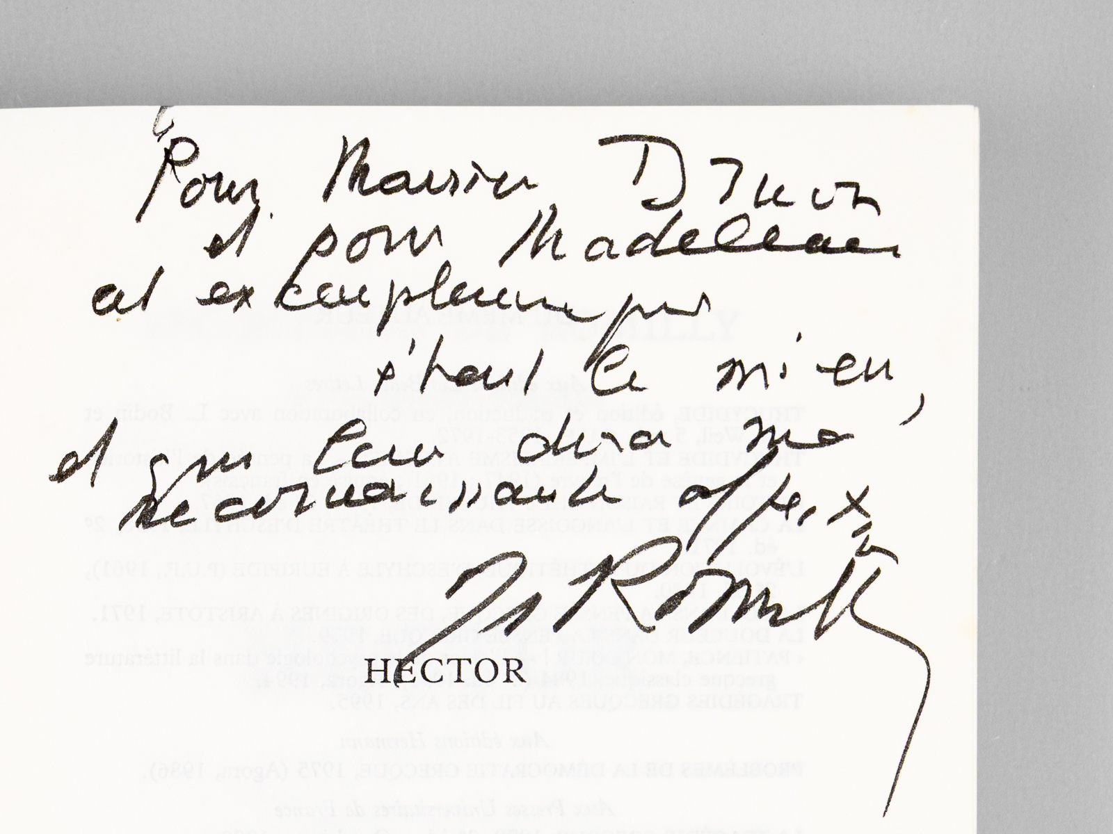 Envoi ms. de l'auteur, 1 vol. in-8 br., Editions de Fallois, Paris, 1991, 277 pp. Commentaire : Bel envoi de l'auteur à l'académicien Maurice Druon et à son épouse : 'Pour Maurice Druon et pour Madeleine, cet exemplaire qui était le mien et qui leur dira ma reconnaissante affection.' Maurice Druon (1918-2009), auteur notamment de la célèbre saga historique des Rois maudits, fut élu à l'Académie Française en 1968. Il en devint le Secrétaire Perpétuel, de 1985 à 1999. Jacqueline de Romilly, quant à elle, fut élue à l'Académie Française en 1988. Etat très satisfaisant (lég. rouss. sur tr. sup., bon état par ailleurs) pour cet exemplaire, d'une origine prestigieuse.