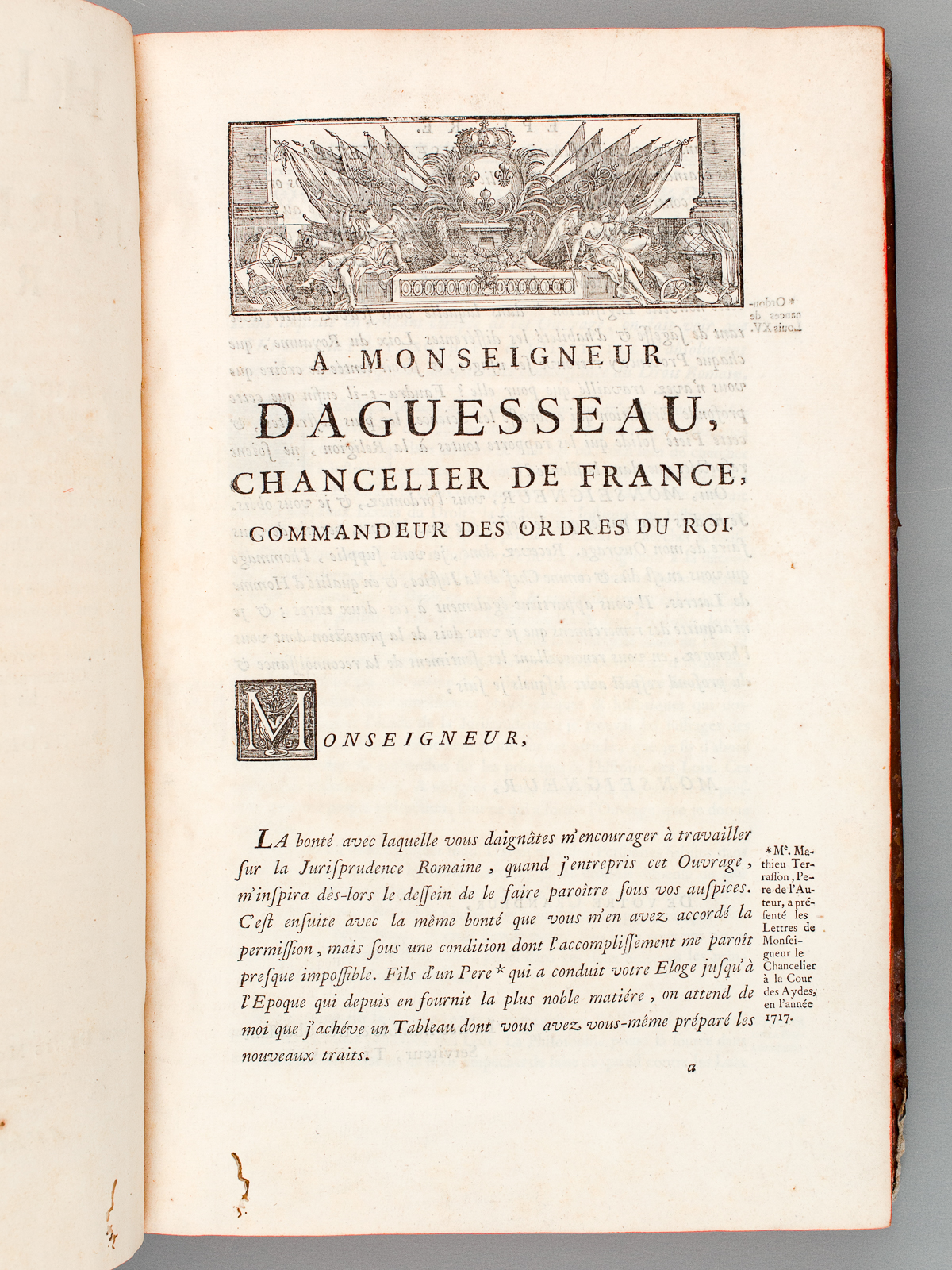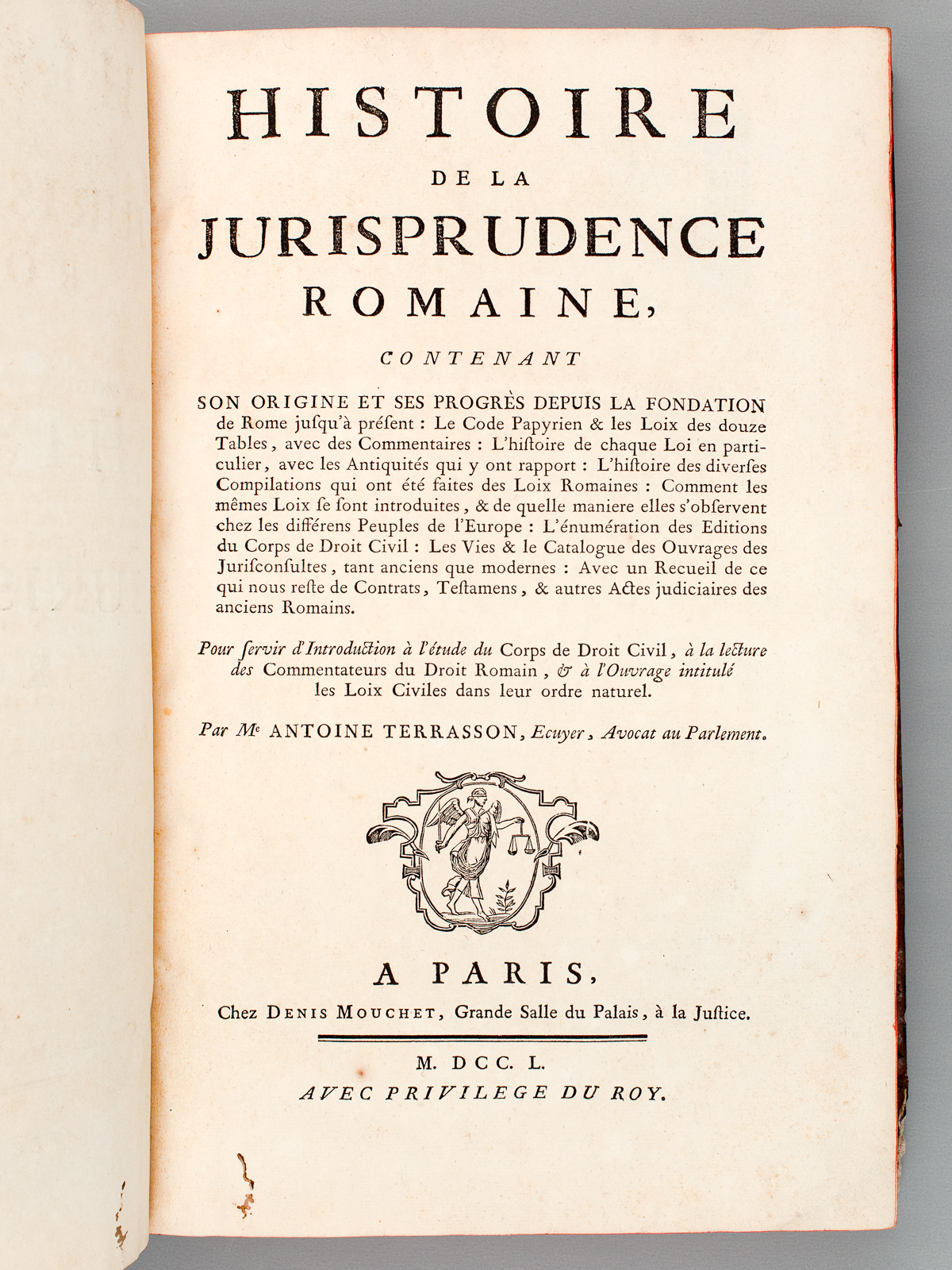 1 vol. in-folio reliure de l'époque plein veau marbré, dos à 6 nerfs orné, Chez Denis Mouchet, Paris, 1750, 2 ff., XXIV-484-152 pp. Rappel du titre complet : Histoire de la Jurisprudence Romaine [ Edition originale ] Contenant son origine et ses progrès depuis la Fondation de Rome jusqu'à présent : le Code Papyrien & les Loix des douze Tables, avec des Commentaires : L'Histoire de chaque Loi en particulier, avec les Antiquités qui y ont rapport : L'Histoire des diverses Compilations qui ont été faites des Loix Romaines : Comment les mêmes Loix se sont introduites, & de quelle manière elles s'observent chez les différens Peuples de l'Europe : L'énumération des Editions du Corps de Droit Civil : Les Vies & le Catalogue des Ouvrages des Jurisconsultes, tant anciens que modernes : Avec un Recueil de ce qui nous reste de Contrats, Testamens, & autres Actes judiciaires des anciens Romains