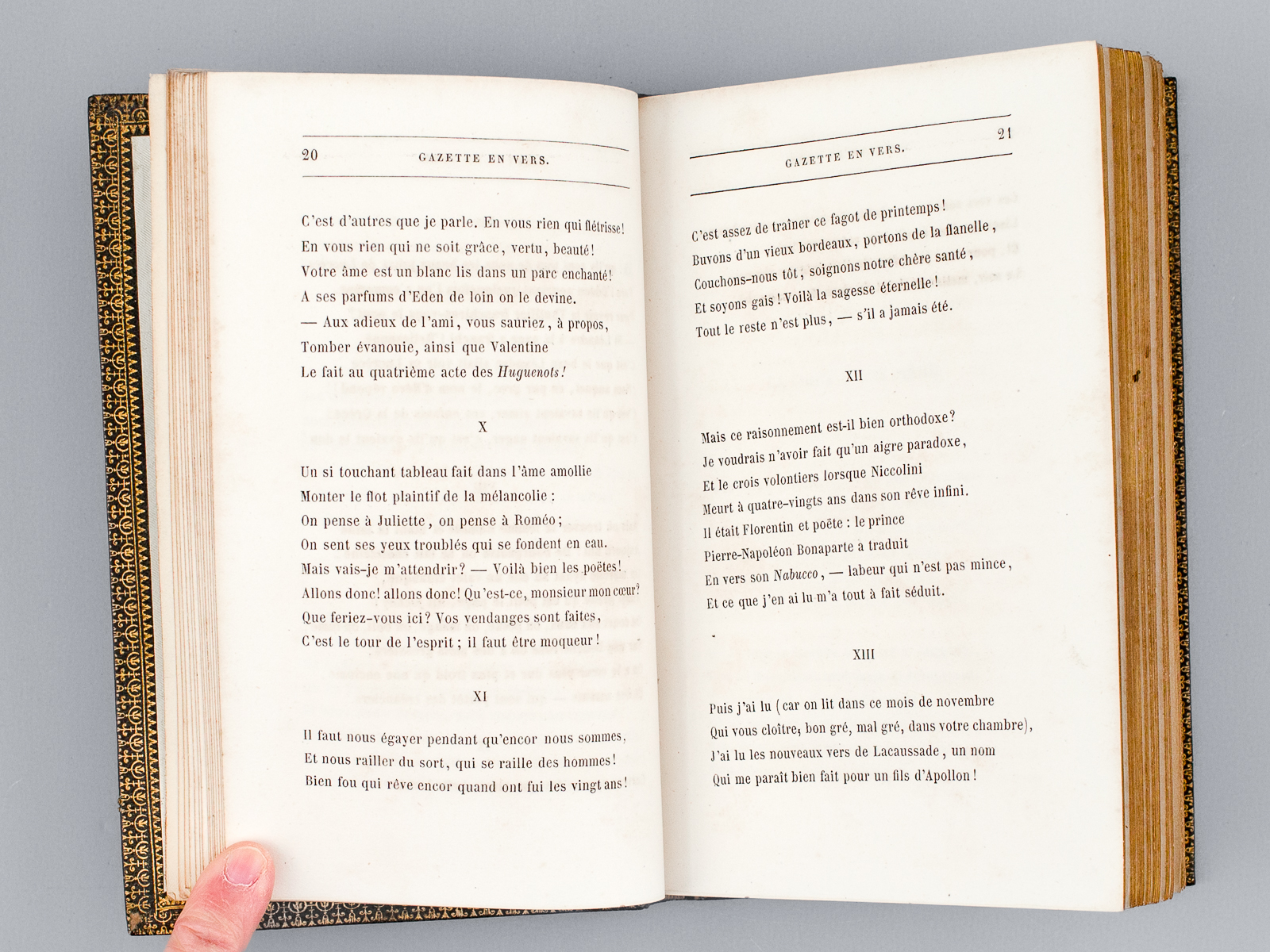 1 vol. in-12 reliure de l'époque plein chagrin vert, dos à 4 nerfs dorés orné (abeille), fers de l'Empereur Napoléon III en plats avec double filet doré d'encadrement et abeilles en écoinçons, coupes et chasses ornées, toutes tranches dorées, Tardieu, Paris, 1863, 2 ff., 154 pp. et 1 f. n. ch. Commentaire : Bon exemplaire aux armes impériales de Napoléon III (OHR, pl. 2659 fer 2, probable fer de prix, variante de format 74 x 57 mm). Le poète, chansonnier et traducteur Nicolas Martin (1814-1877) écrit dans sa préface : 'Je crois devoir laisser aux premières pièces de ce nouveau volume le titre général de Gazette en vers, sous lequel elles ont été imprimées l'année dernière dans l'Artiste'. Bon état (fente partielle à un mors en tête, rel. très lég. frottée, bon exemplaire par ailleurs)