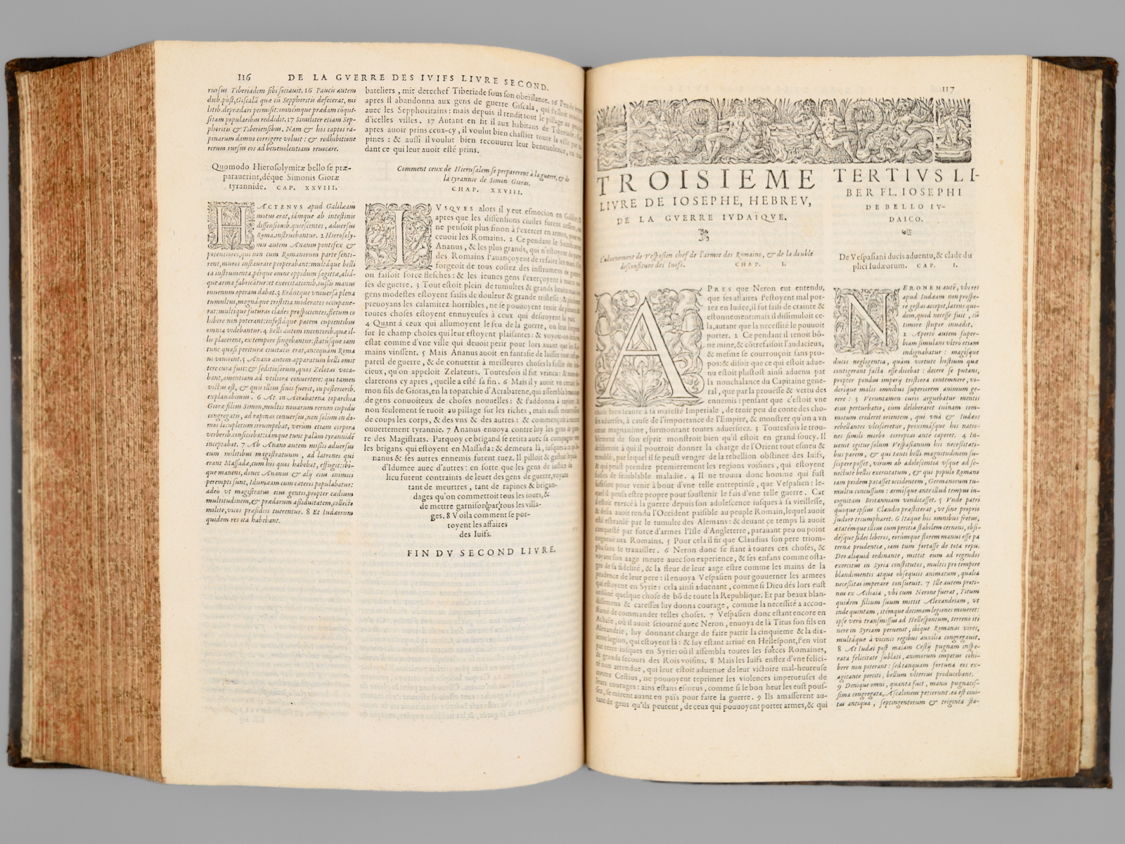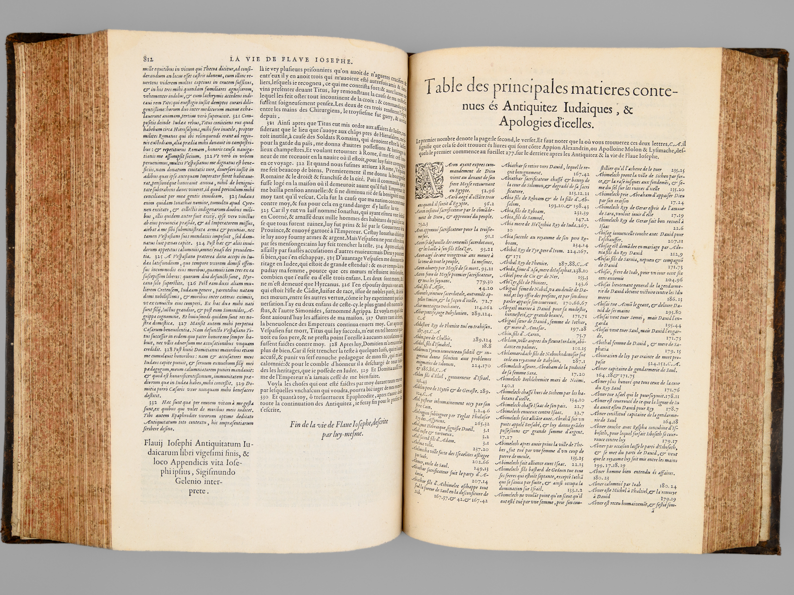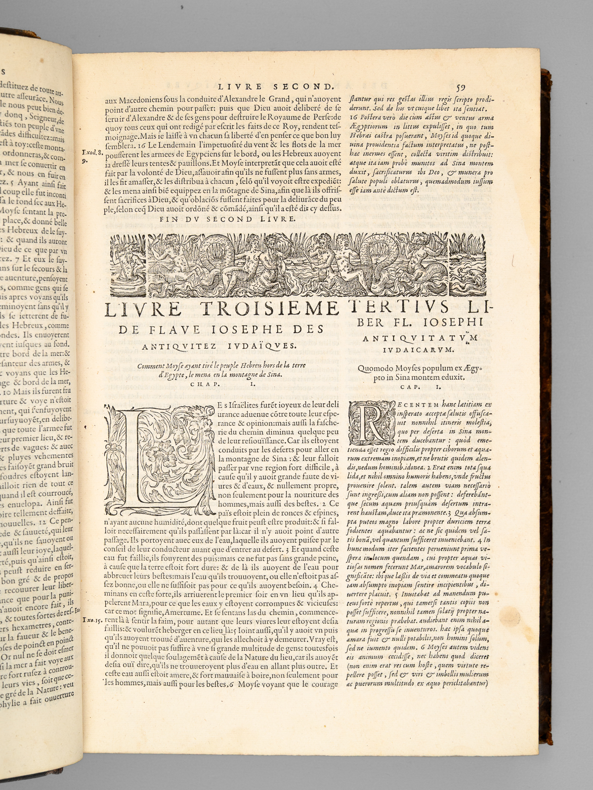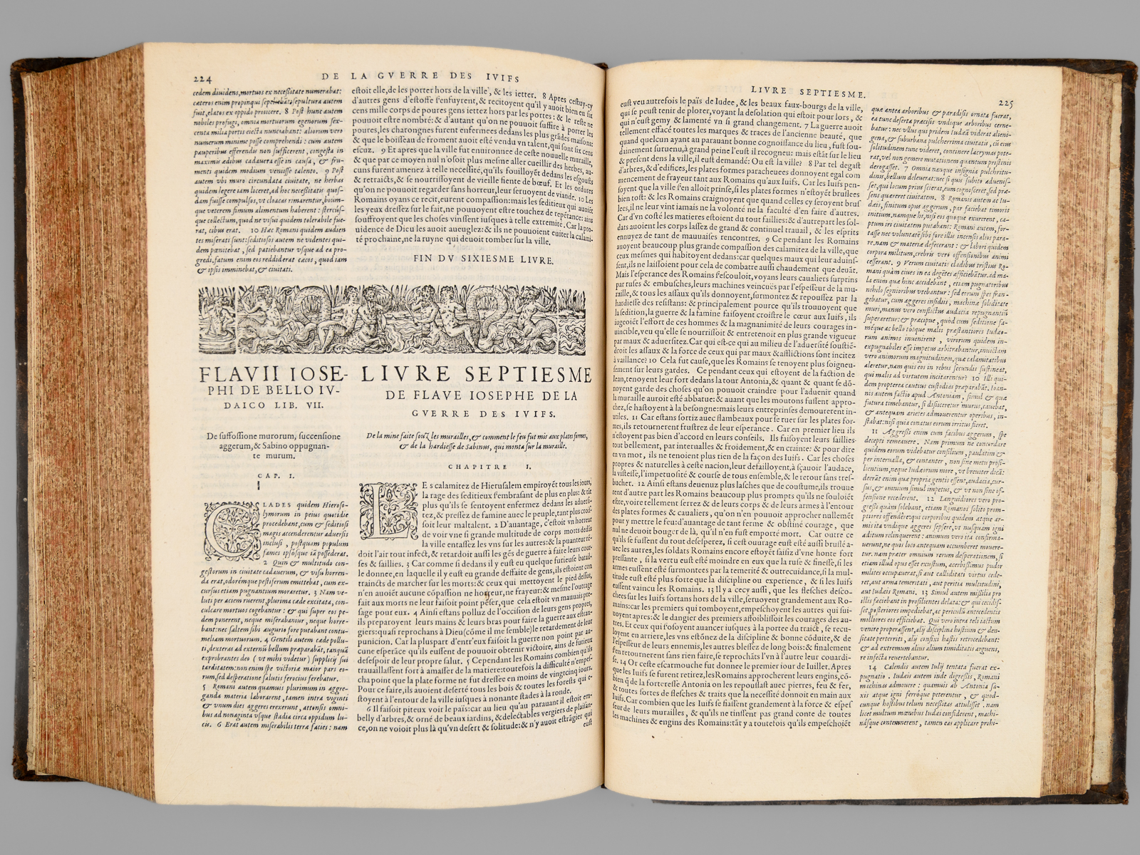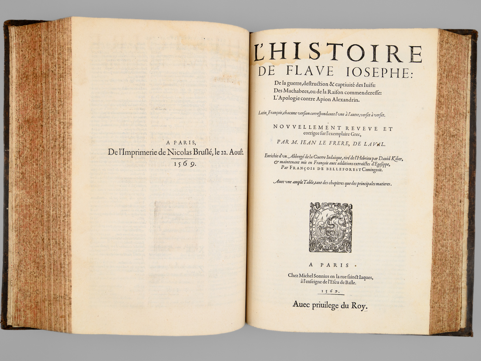 Partie en deux tomes, dont le sommaire du contenu se void en la page suyuante. Avec une ample table, tant des chapitres que des matières principales, 1 vol. in-folio reliure de l'époque pleine basane brune, dos à 6 nerfs, Chez Michel Sonnius en la rue Sainct Jaques à l'enseigne de l'Escu de Basle, Paris, 1569, 7 ff., 812 [ i.e. 612 ] pp., 16 ff., 1 f. (Titre), 344 pp., 6 ff., 63 pp. Rappel du titre complet : L'Histoire de Flave Josèphe : latin-françois, chacune version correspondante l'une à l'autre, verset à verset. Escrite premièrement par l'autheur en langue greque : & nouvellement reueuë & corrigée sur l'exemplaire grec, par M. Jean le Frere de Laval. Enrichie d'un Abbregé de la Guerre Judaïque, tiré de l'Hebrieu par David Kiber, & maintenant mis en françois avec additions extraictes d'Egesippe, par François de Belleforest Comingeois [ Contient : ] Tome I : Les antiquitez judaiques, livres XX, La vie de Josephe, descrite par luymesme ; Tome II : La Guerre, Destruction, & Captivité des Juifs - L'apologie contre Apion Alexandrin, touchant l'antiquité des Juifs - Des Machabees, ou de la Raison commanderesse - Un abbrégé de la guerre judaique tiree de l'hebrieu, par David Kiber, avec additions extraites d'Egesippe