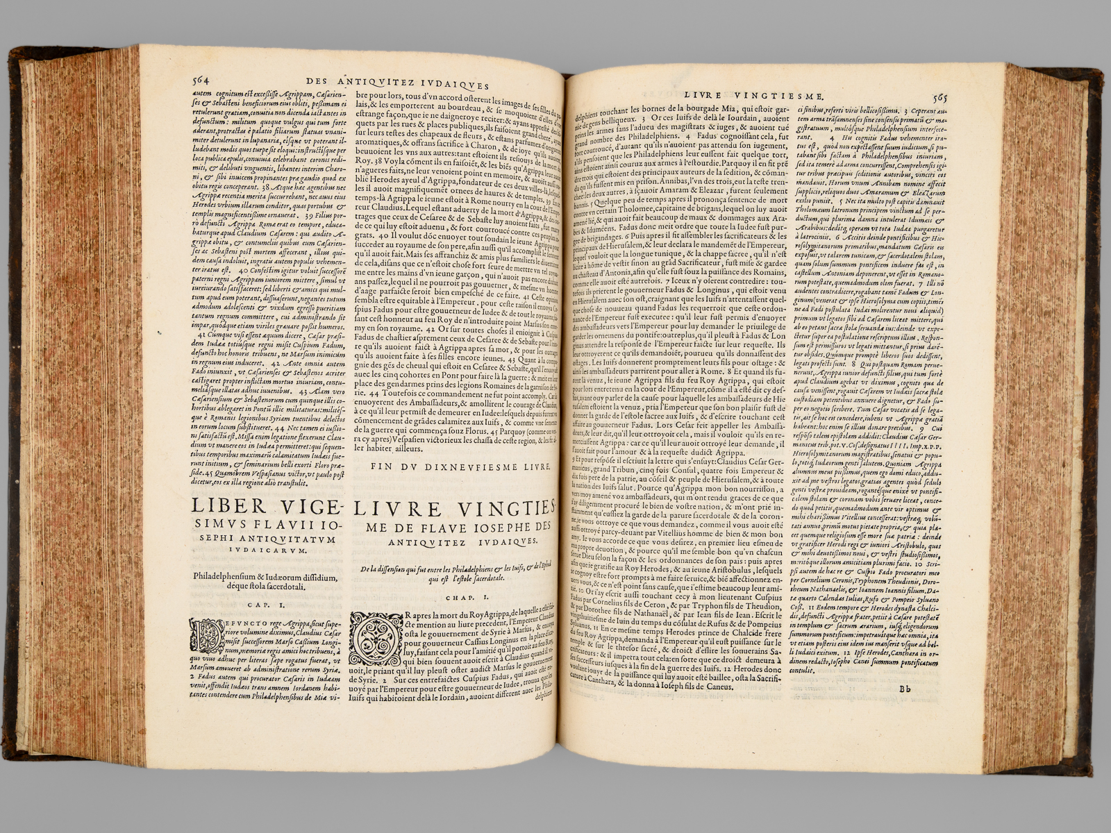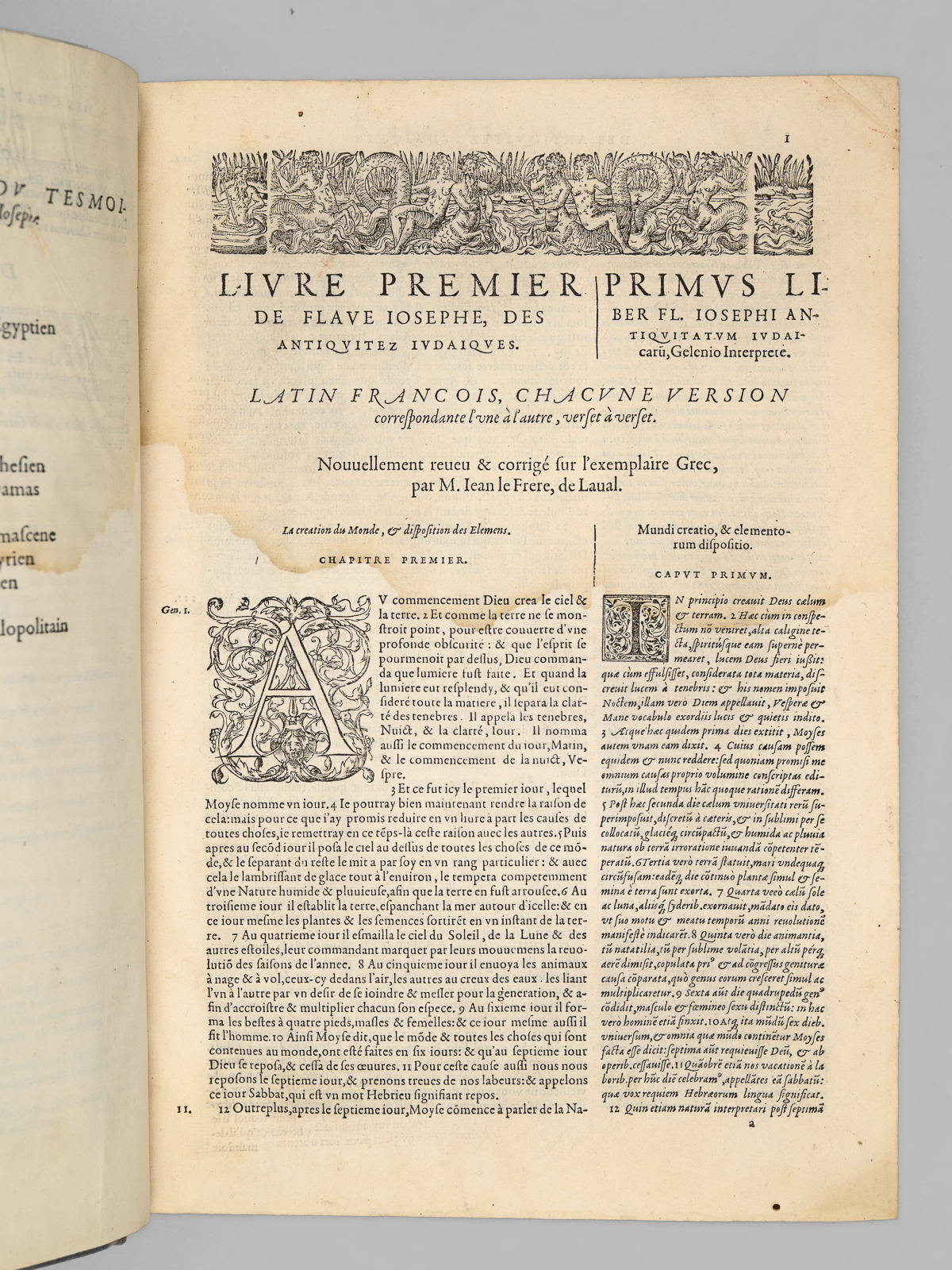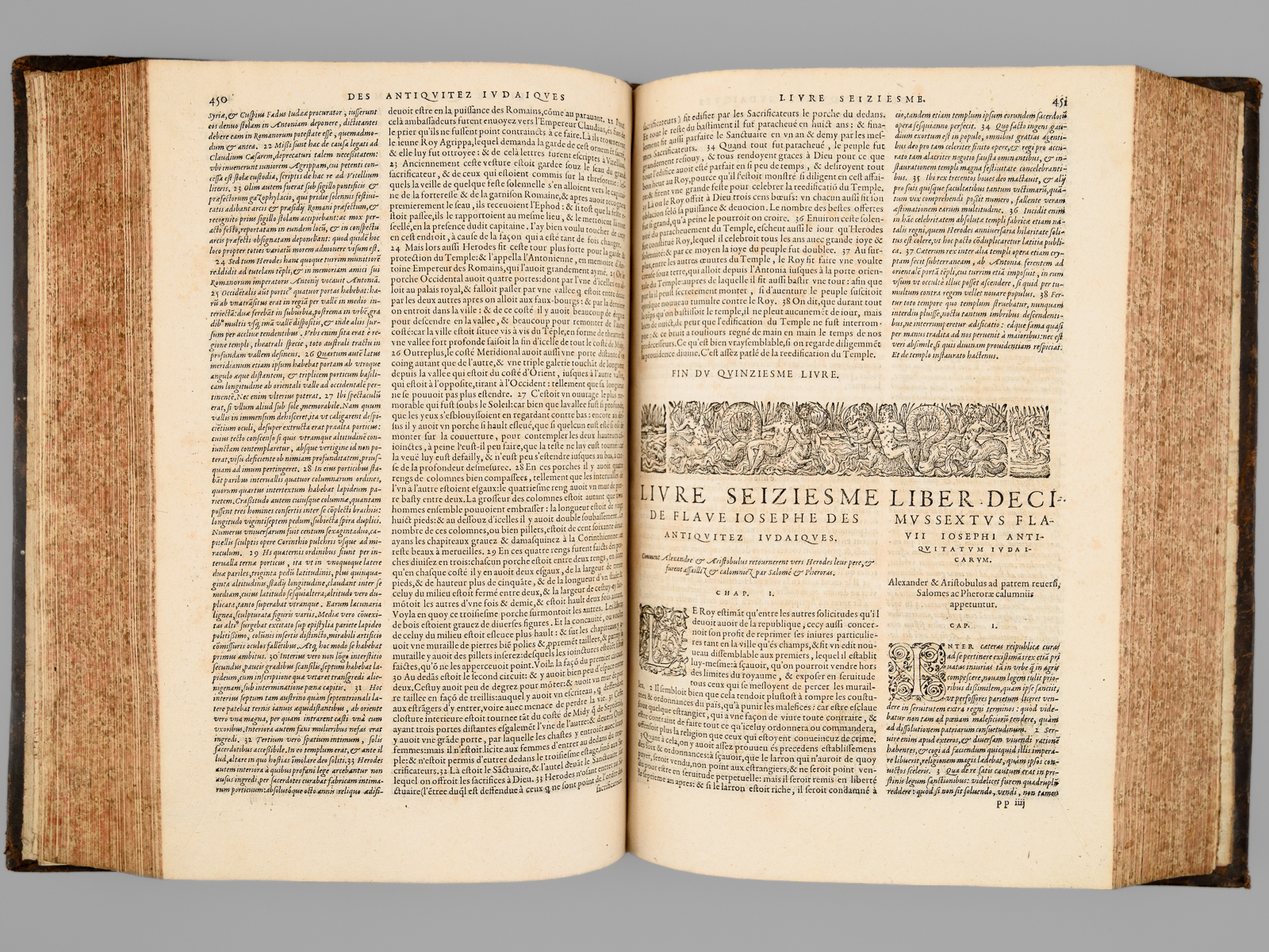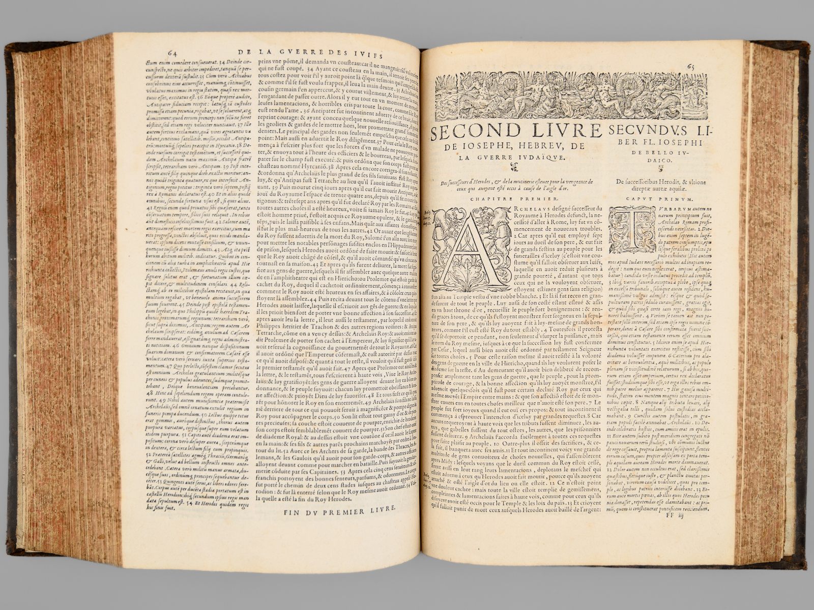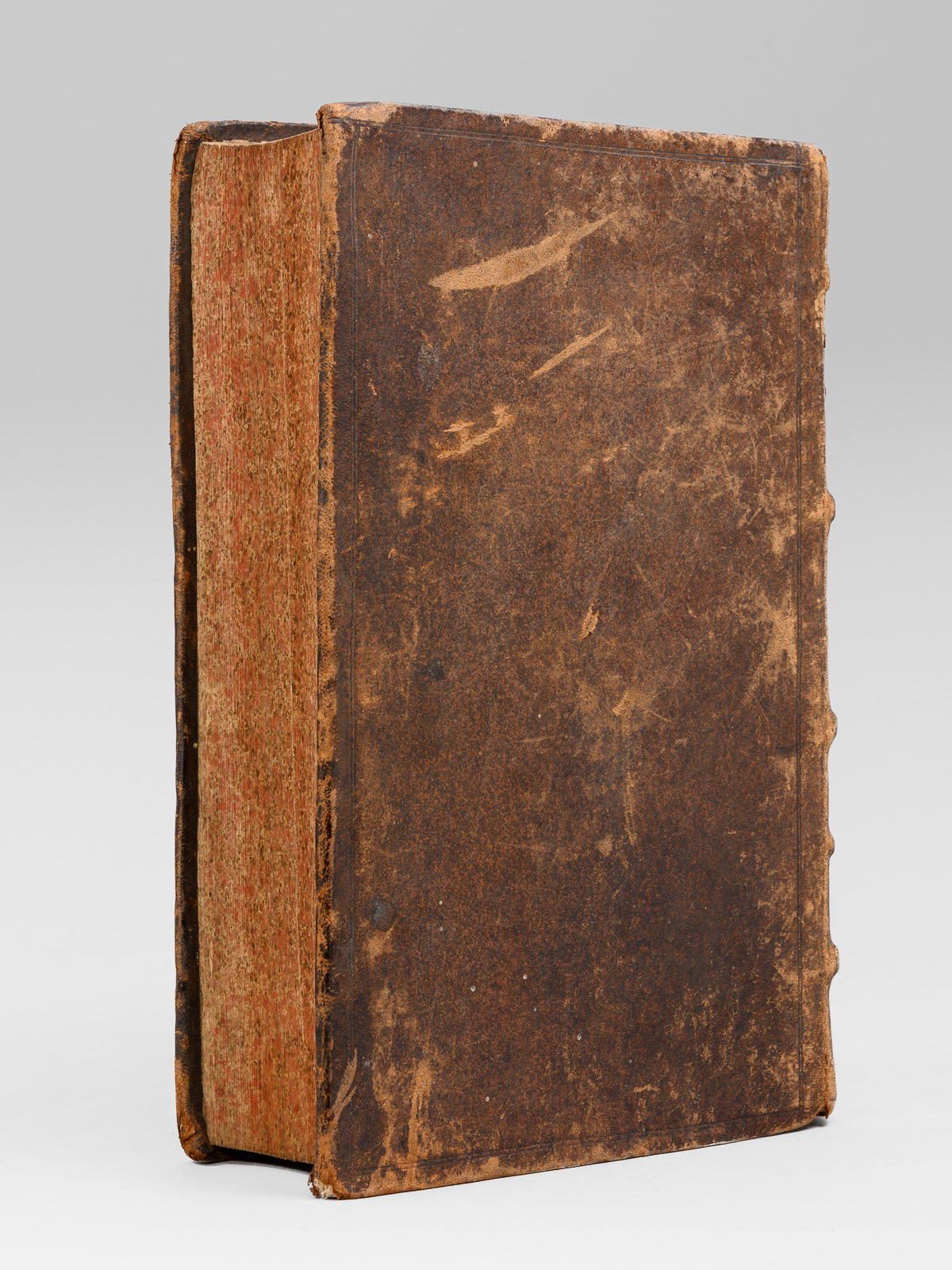 Partie en deux tomes, dont le sommaire du contenu se void en la page suyuante. Avec une ample table, tant des chapitres que des matières principales, 1 vol. in-folio reliure de l'époque pleine basane brune, dos à 6 nerfs, Chez Michel Sonnius en la rue Sainct Jaques à l'enseigne de l'Escu de Basle, Paris, 1569, 7 ff., 812 [ i.e. 612 ] pp., 16 ff., 1 f. (Titre), 344 pp., 6 ff., 63 pp. Rappel du titre complet : L'Histoire de Flave Josèphe : latin-françois, chacune version correspondante l'une à l'autre, verset à verset. Escrite premièrement par l'autheur en langue greque : & nouvellement reueuë & corrigée sur l'exemplaire grec, par M. Jean le Frere de Laval. Enrichie d'un Abbregé de la Guerre Judaïque, tiré de l'Hebrieu par David Kiber, & maintenant mis en françois avec additions extraictes d'Egesippe, par François de Belleforest Comingeois [ Contient : ] Tome I : Les antiquitez judaiques, livres XX, La vie de Josephe, descrite par luymesme ; Tome II : La Guerre, Destruction, & Captivité des Juifs - L'apologie contre Apion Alexandrin, touchant l'antiquité des Juifs - Des Machabees, ou de la Raison commanderesse - Un abbrégé de la guerre judaique tiree de l'hebrieu, par David Kiber, avec additions extraites d'Egesippe