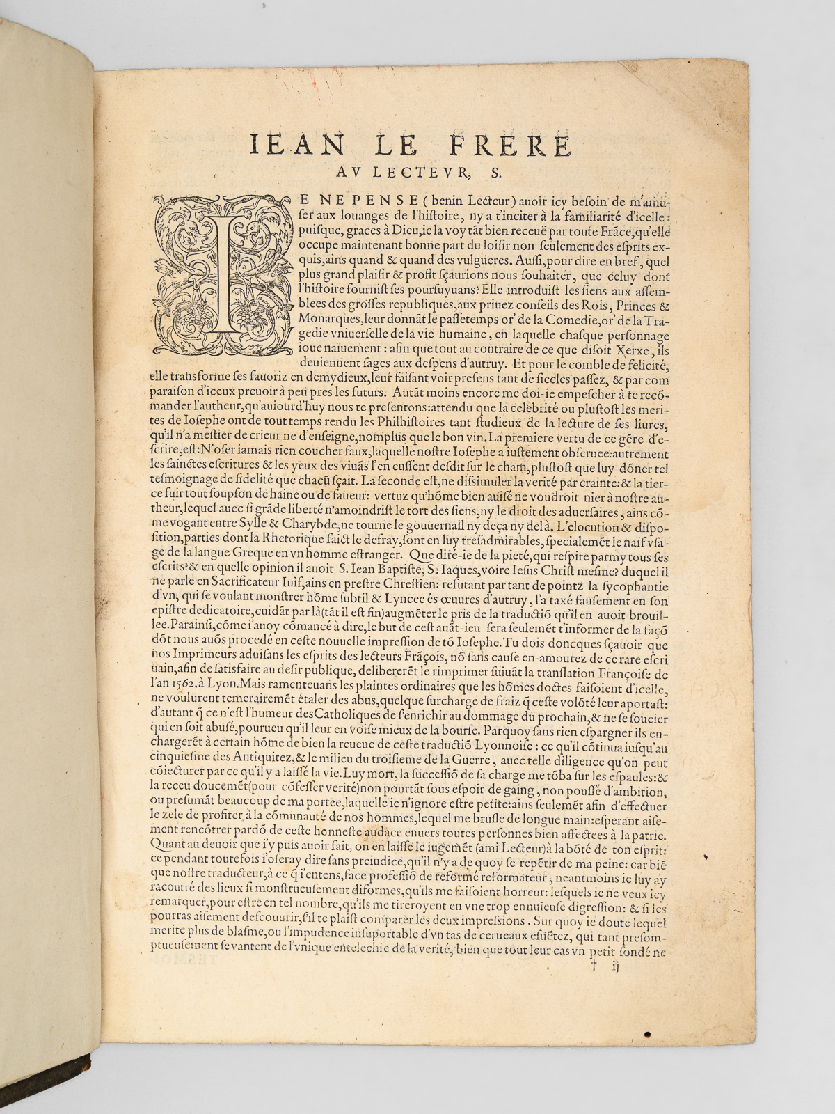 Commentaire : L'exemplaire est incomplet du premier feuillet de titre. L'édition de 1569 est la première édition de la traduction par Jean Le Frère (de Laval), humaniste ami de Dorat et Baïf. Il améliore, sur la base du texte grec, la traduction de François Bourgoing de 1558. L'ouvrage propose également la première édition française d'un extrait de Joseph Ben Gorion (Josippon), ici traduit par François de Belleforest. Sous ce pseudonyme de Joseph Ben Gorion, un auteur italien anonyme du Xe siècle a fourni en hébreu une histoire du peuple juif des origines (depuis la Genèse) jusqu'à la chute de Massada. Le traducteur a suivi l'édition latine de David Kyber ('Historia belli Judaici', ex Josepho Hebreo, Strasbourg, 1550) en y intercalant des extraits d'Hégésippe (traduction latine anonyme de Flavius Josèphe). Etat satisfaisant (sans le premier feuillet de titre, bien complet par ailleurs, reliure frottée avec mq. en coiffes, mouill. assez discrète en début d'ouvrage, une très petite piq. de vers en marge en queue, bon état par ailleurs). Prix en l'état. Brunet, III, 571