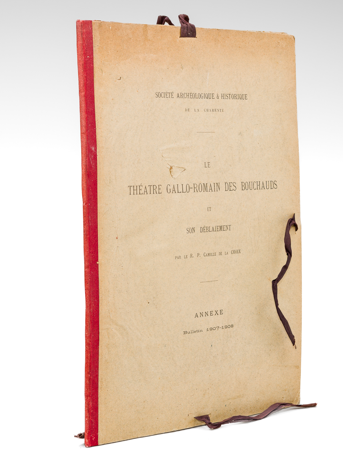 1 vol. in-folio en feuillets sous chemise cartonné à lacets, Société archéologique & historique de la Charente. Annexe. Bulletin 1907-1908 avec 4 plans (planches doubles) et 10 planches photographiques par Jules Robuchon. Détail des plans : I : Plan d'étude du Théâtre qui servit a diriger son déblaiement ; II : Plan du théâtre après son déblaiement ; III : Diverses Coupes du Théâtre ; IV : Pierres travaillées retrouvées pendant le cours des travaux. Commentaire : Suite aux travaux qui avaient menés sur le site par Jean Gontier, le site est racheté après sa mort par Solange Laporte-Bisquit, épouse du sénateur-maire de Jarnac, et fille du mécène Adrien Dubouché. C'est elle qui fit venir le père Camille de La Croix, jésuite belge qui venait de fouiller le site et le théâtre antique de Sanxay. Etat très satisfaisant (chemise frottée avec ancien accroc, qq. rouss., bon état par ailleurs).