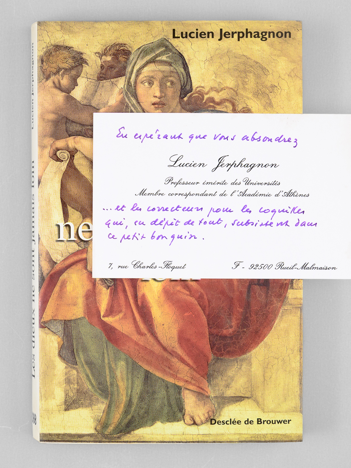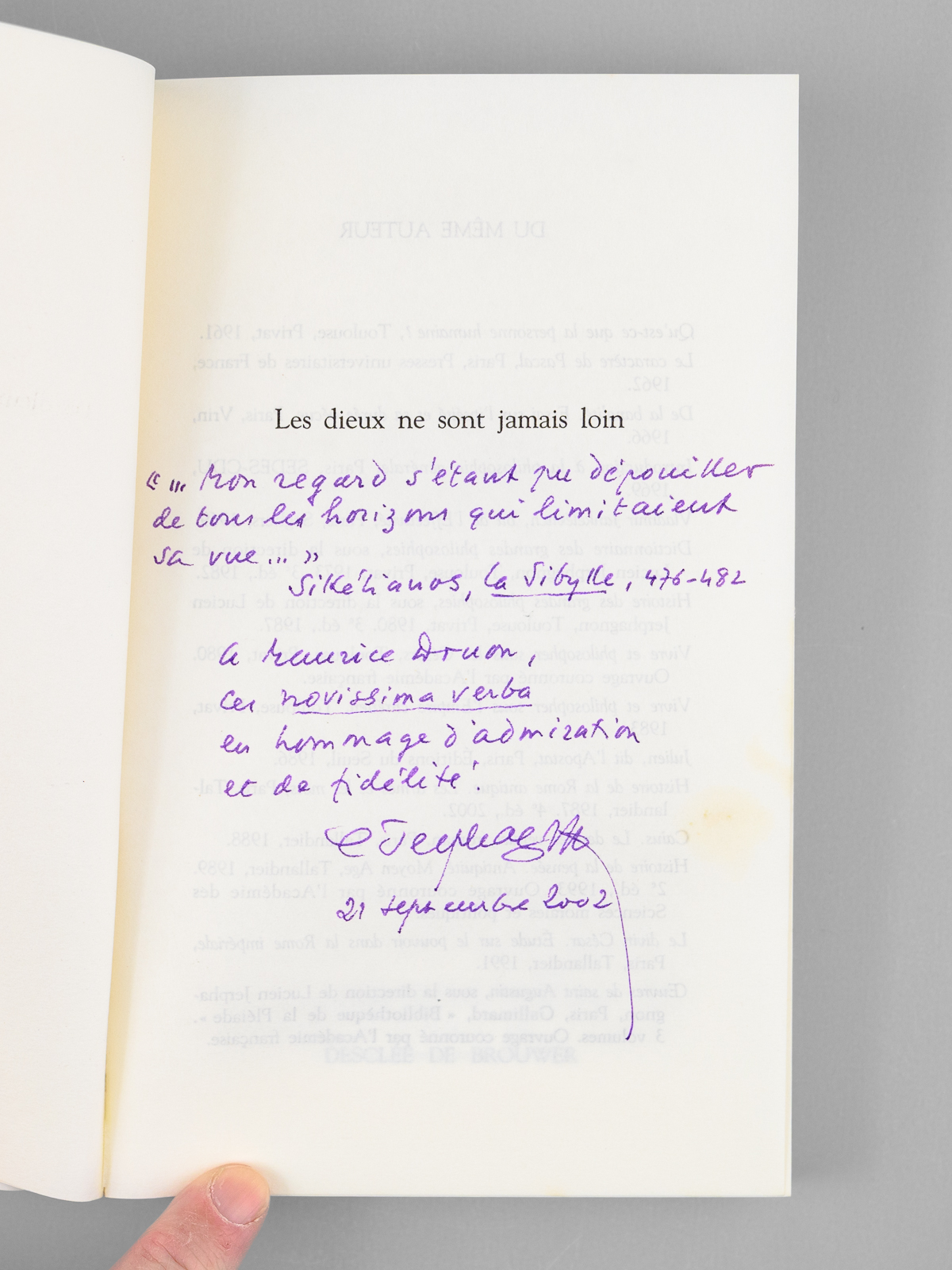 Commentaire : Bel envoi de Lucien Jerphagnon 'A Monsieur Maurice Druon, ces 'novissima verba' en hommage d'admiration et de fidélité', précédé d'une citation extraite de 'La Sibylle'. On joint une carte de visite enrichi d'une mention manuscrite de Lucien Jerphagnon : 'En espérant que vous absoudrez 'Lucien Jerphagnon' ... et les correcteurs pour les coquilles quo, en dépit de tout, subsistent dans ce petit bouquin'. Comme à son habitude, Maurice Druon a plié l'angle de 12 feuillets qui avaient plus particulièrement retenu son attention (avec qq. annotations de la main de Maurice Druon en marge). Bon état