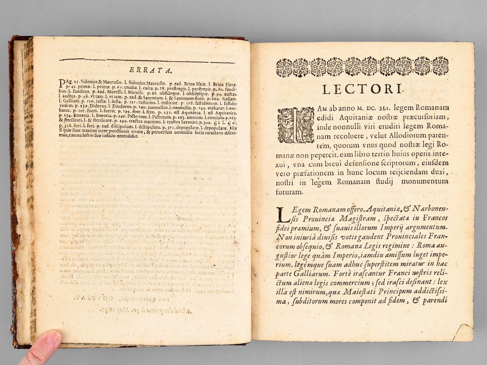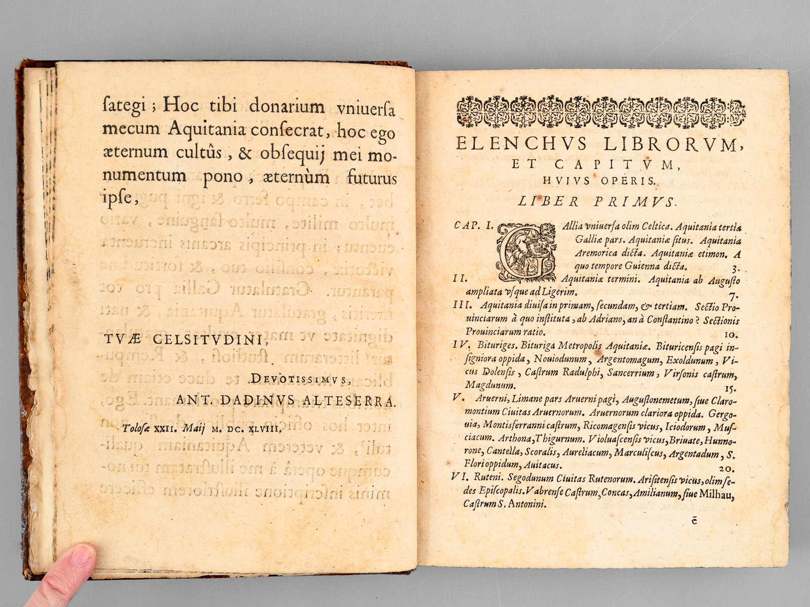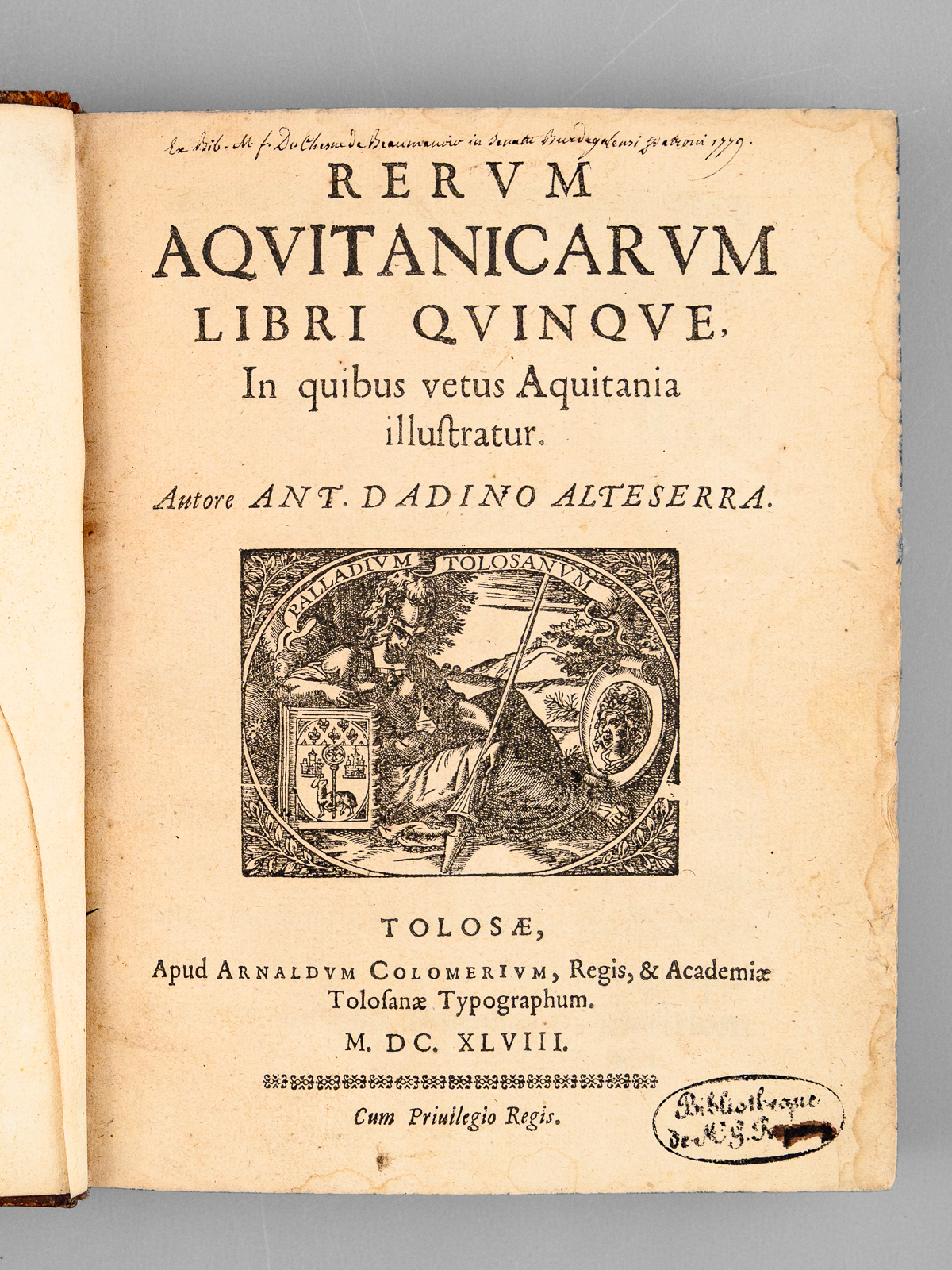 Autore Ant. Dadino Alteserra, 1 vol. in-4 reliure de l'époque pleine basane marbrée, dos à 5 nerfs orné, toutes tranches marbrées, Apud Arnaldum Colomerium [ Arnaud Colomer ], Tolosae [ Toulouse ], 1648, 11 ff., 395 pp.