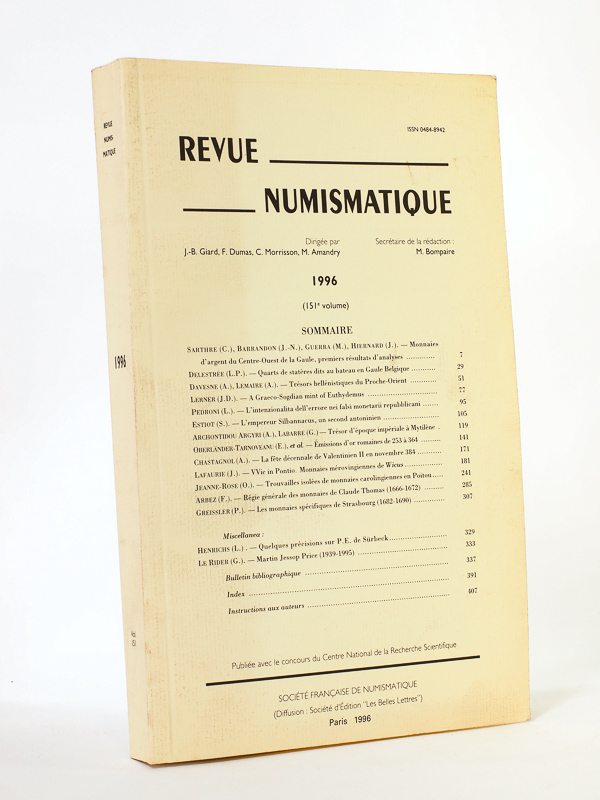 1 vol. in-8 br., Revue de Numismatique - Société Française de Numismatique, Société d'Edition 'Les Belles Lettres', Paris, 1996, 415 pp. + XXXVI pl. noir et blanc. Au sommaire notamment : monnaies d'argent du centre-Ouest de la France ; Quarts de statère dits au bateau en Gaule Belgique ; trésors hellénistiques du Proche-Orient ; trésor d'époque impériale à Mytilène ; émissions d'or romaines de 253 à 364 ; lla fête décennale de Valentinien II en novembre 384 ; trouvailles isolées de monnaies carolingiennes en Poitou ; règle générale des monnaies de Claude Thomas (1666-1672) ; les monnaies spécifiques de Strasbourg (1682-1690) Commentaire : Bon état (couv. très lég. frottée, très bon état intérieur).