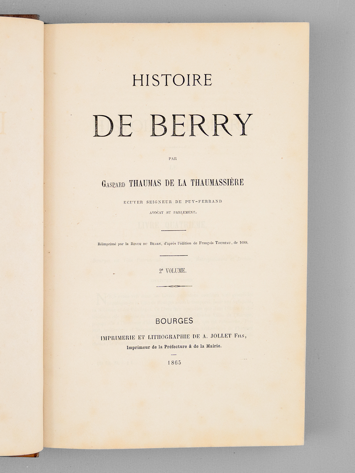 Réimprimé par la Revue du Berry, d'après l'édition de François Toubeau de 1689, 3 vol. grand in-8 reliure demi-veau blond, dos à 5 nerfs dorés, Imprimerie et Lithographie de A. Jollet Fils, Bourges, 1865, 606 ; 279 ; 530-XIII pp.