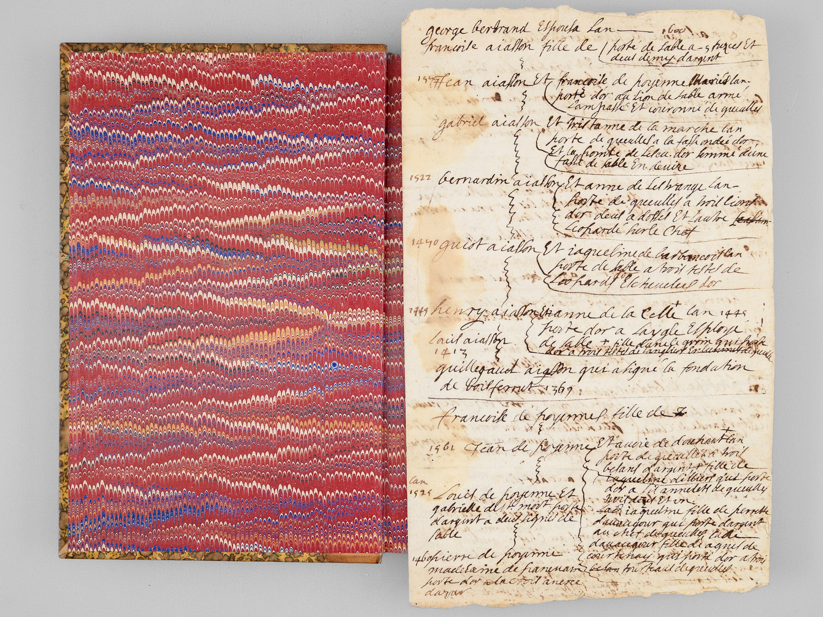 Commentaire : On joint un intéressant document manuscrit ancien (probablement XVIIe ou début XVIIIe siècle) de 2 grands feuillets relatif à diverses familles du Berry dont Aiallon, de Chamborant, de Bridiers... Bon état (3 tomes sur 4, bon exemplaire par ailleurs).