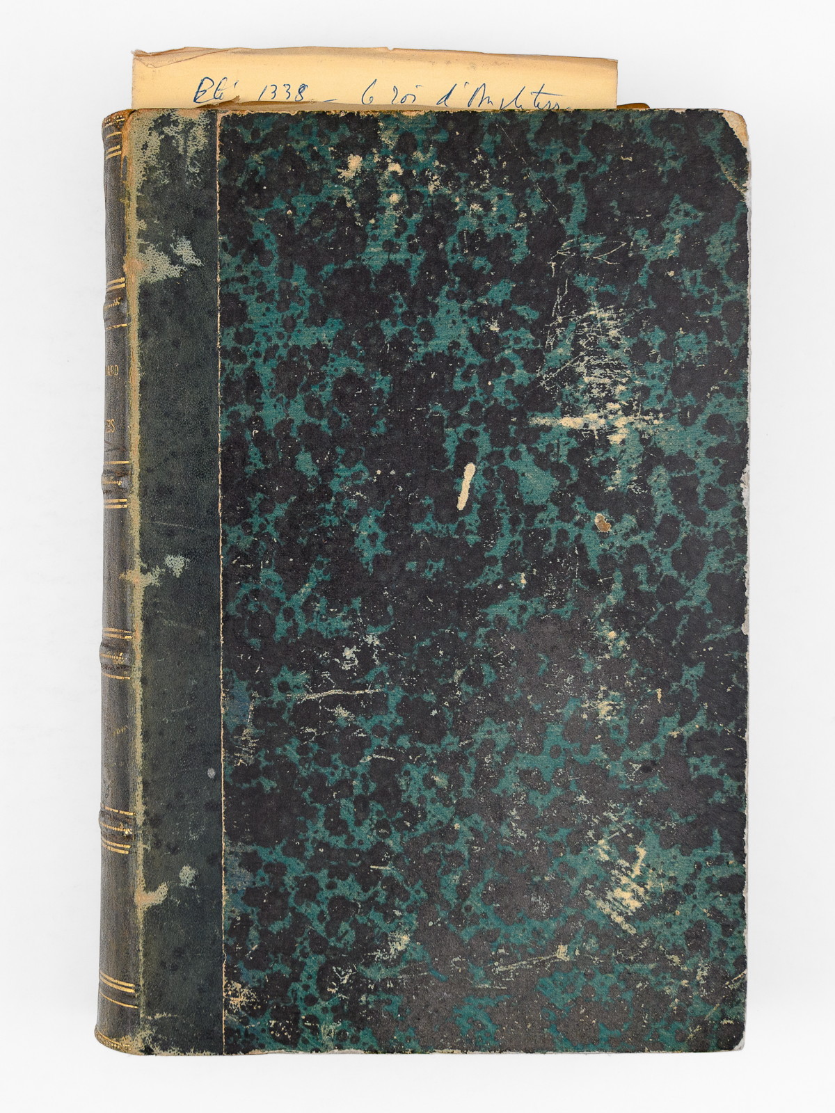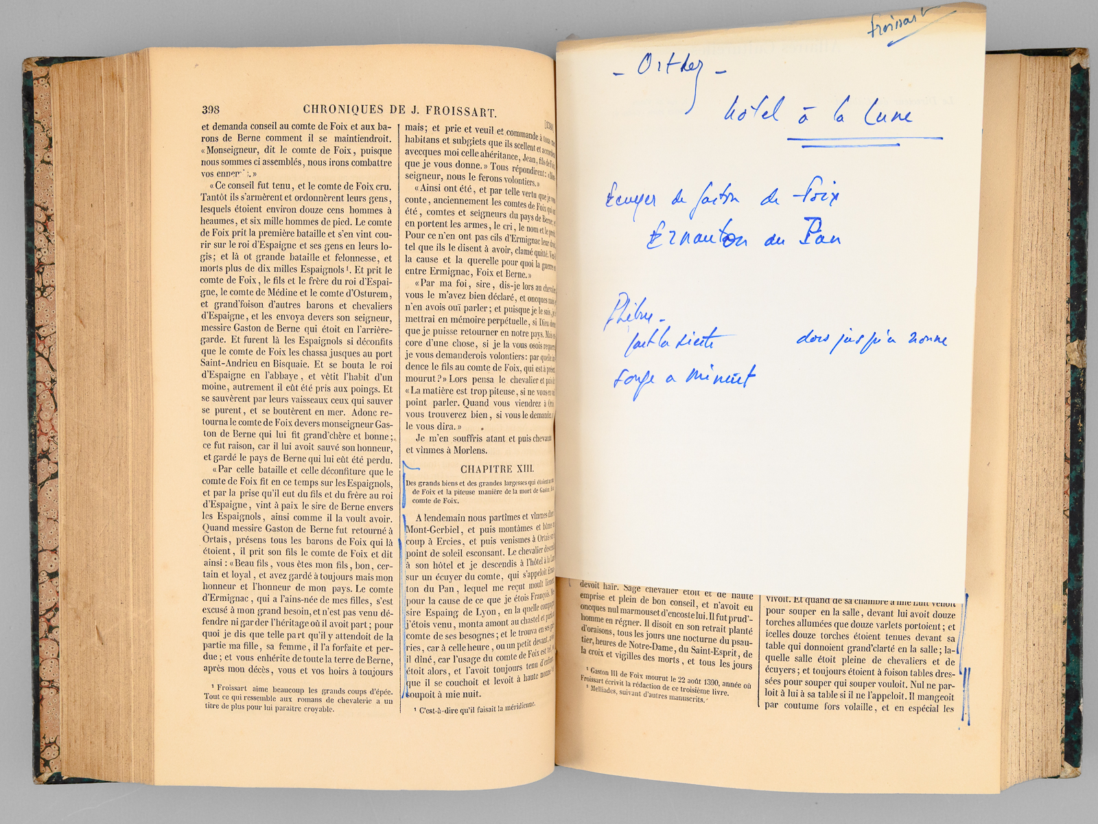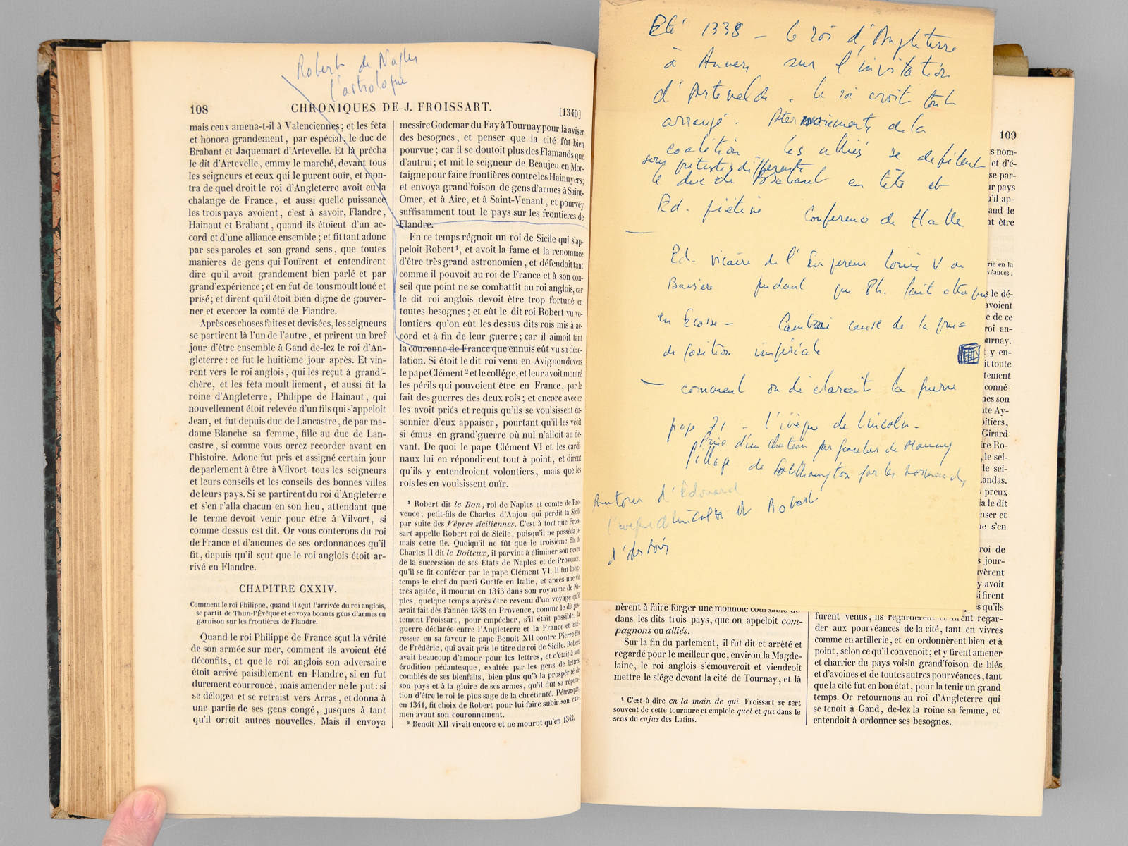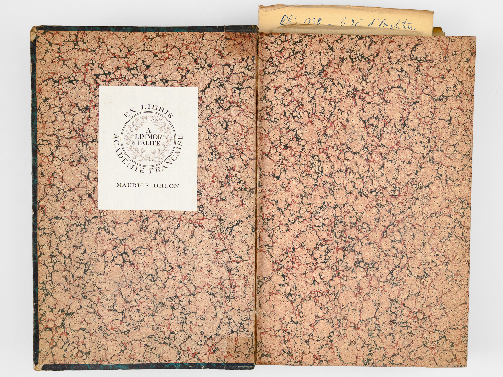Commentaire : Exceptionnel exemplaire des Chroniques de Froissart, annoté par Maurice Druon pour préparer la rédaction des 'Rois Maudits'. Maurice Druon a souligné ou signalé certains passages, placé quelques annotations dans le texte, et glissé notamment deux feuillets portant diverses annotations autographes. La première série de notes sur une feuillet à en-tête 'Maurice Druon' glissé dans le chapitre CXXIV du livre I Partie I, évoque l'été 1338, 'le roi d'Angleterre à Anvers sur l'invitation d'Artevelde. Le roi croit tout arrangé. Atermoiements de la coalition. Les alliés se défilent sous prétexte différents' etc... 'Phil VI certainement autoritaire et mufle s'est brouillé avec Hainaut son beau-frère' etc... Maurice Druon y précise notamment le numéro des pages concernées. Un autre feuillet, d'apparence plus récente, à en-tête du Directeur de Cabinet du Ministère des Affaires Culturelles (Maurice Druon en fut le ministre d'avril 1973 à février 1974), est glissé dans le chapitre XIII du Livre III, les qq. notes évoquent Orthez, Hôtel à la Lune, Ecuyer de Gaston de Foix Ernauton du Pan, Phébus fait la sieste, dors jusqu'à nonne, soupe à minuit'. On sait que Maurice Druon évoquera la figure de Gaston Phébus dans le septième et dernier tome des 'Rois Maudits' paru en 1977 : 'Quand un Roi perd la France'. Si l'exemplaire est d'apparence assez modeste (dos frotté), Maurice Druon avait cependant souhaité y marquer son attachement en y apposant ses beaux ex-libris 'Académie Française, A l'Immortalité'. Cet exemplaire tout à fait remarquable est un témoignage direct de la manière dont l'histoire 'romancée' par Maurice Druon s'enracine dans les sources historiques du Chroniqueur Froissart, pour aboutir à ce chef-d'oeuvre du roman historique du XXe siècle.