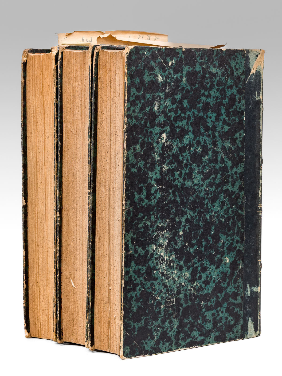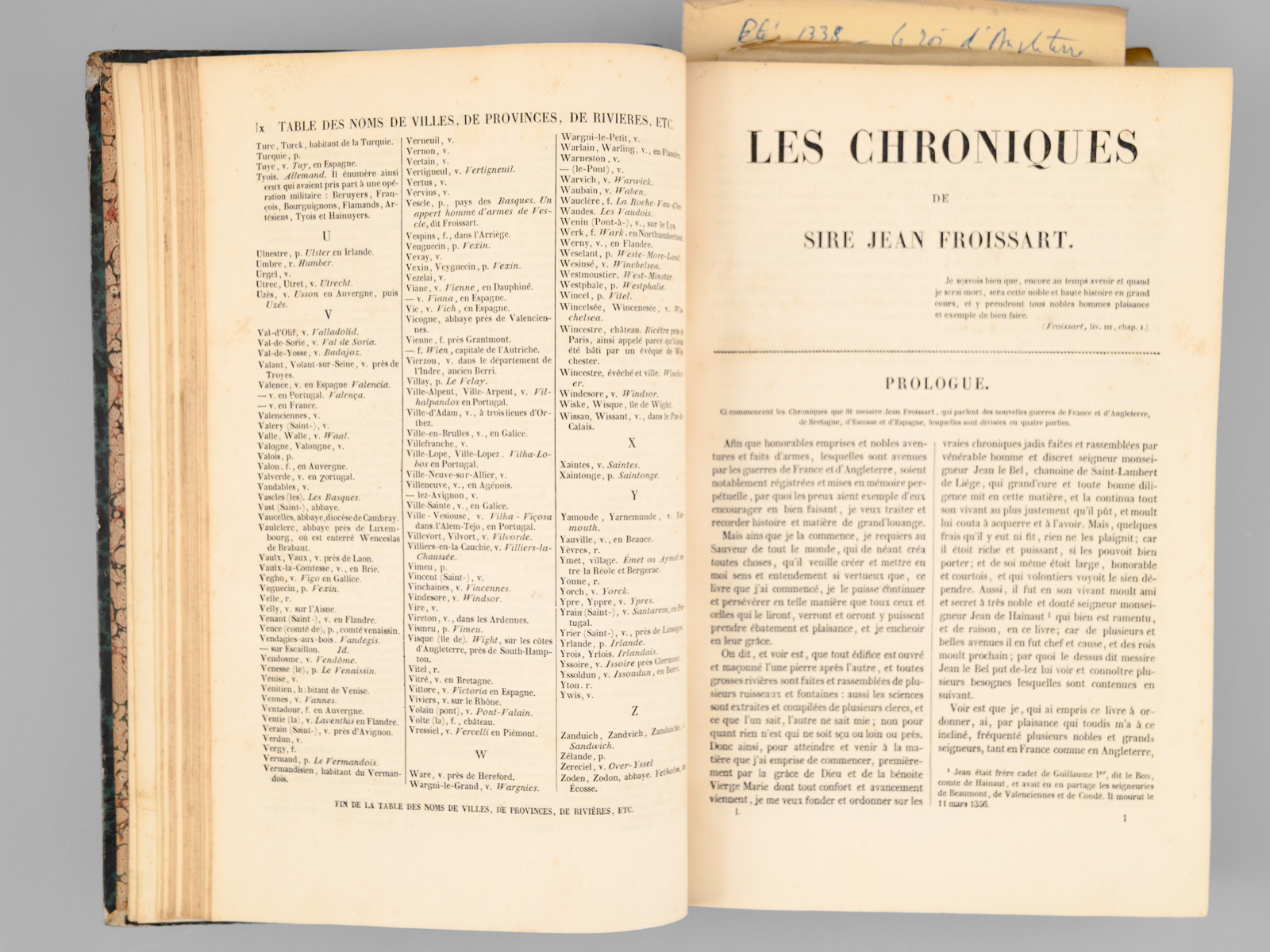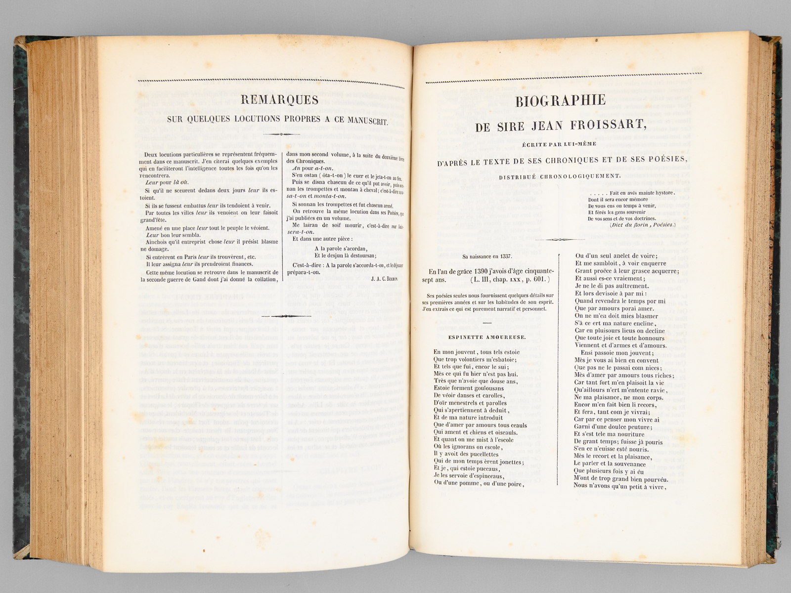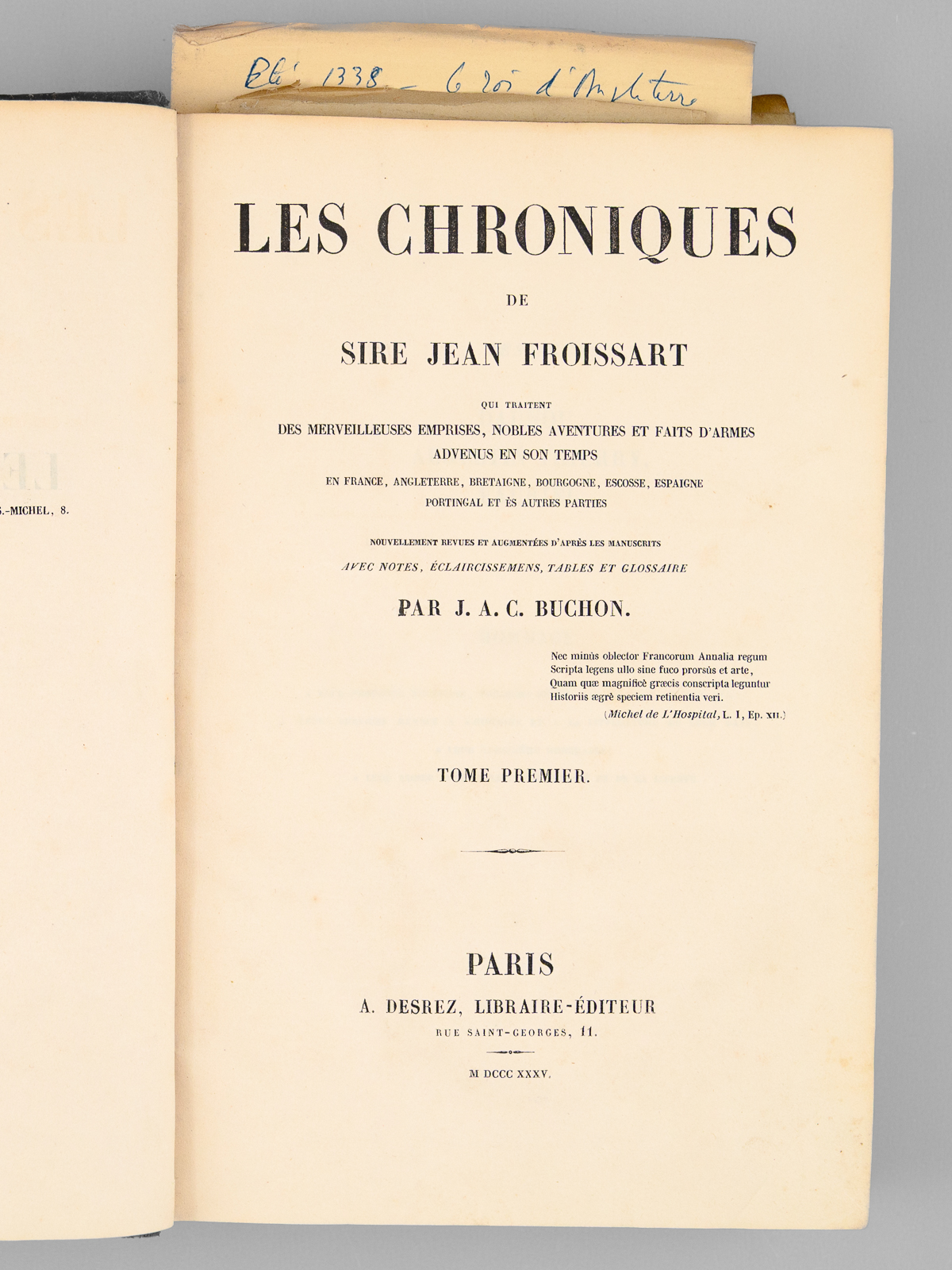 Nouvellement Revues et augmentées d'après les manuscrits avec Notes, Éclaircissements et Glossaire par J. A. C. Buchon., 3 vol. in-4 reliure demi-basane verte, dos à 4 nerfs ornés, A. Desrez, Paris, 1835. Rappel du titre complet : Les Chroniques de Sire Jean Froissart Qui traitent des Merveilleuses Emprises, Nobles Aventures et Faits d'armes advenus en son Temps en France, Angleterre, Bretagne, Bourgogne, Ecosse, Espagne, Portugal et autres parties.