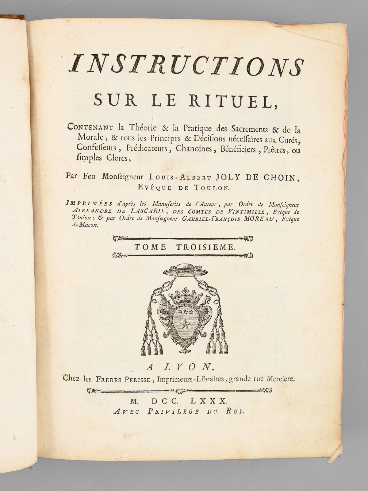 Publié par ordre de Mgr Alexandre de Lascaris, 1780 et 1778, 1 vol. in-4 reliure de l'époque pleine basane marbrée, dos à 5 nerfs oprné aux armes de Mgr Joly de Choin, Chez les Frères Perisse, Lyon, 1780, 1778, 2 ff., 339 pp., 2 ff., XII-370- 86 pp.