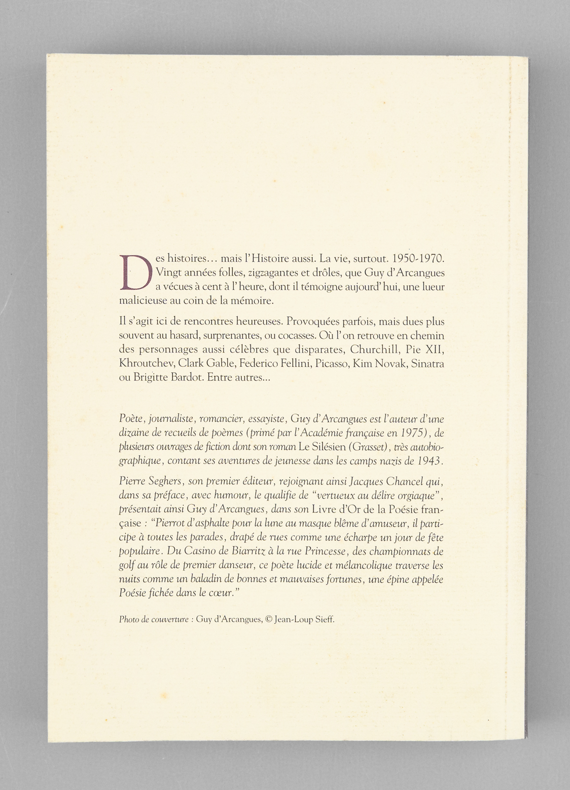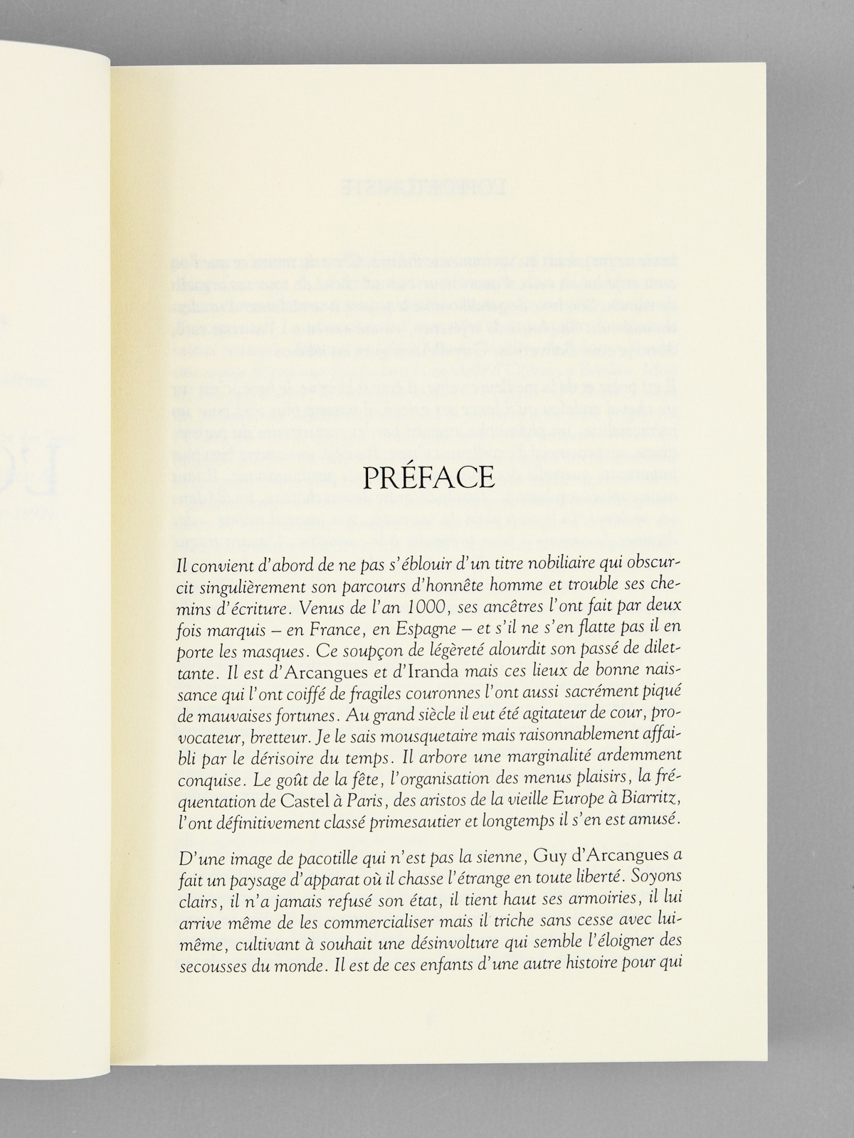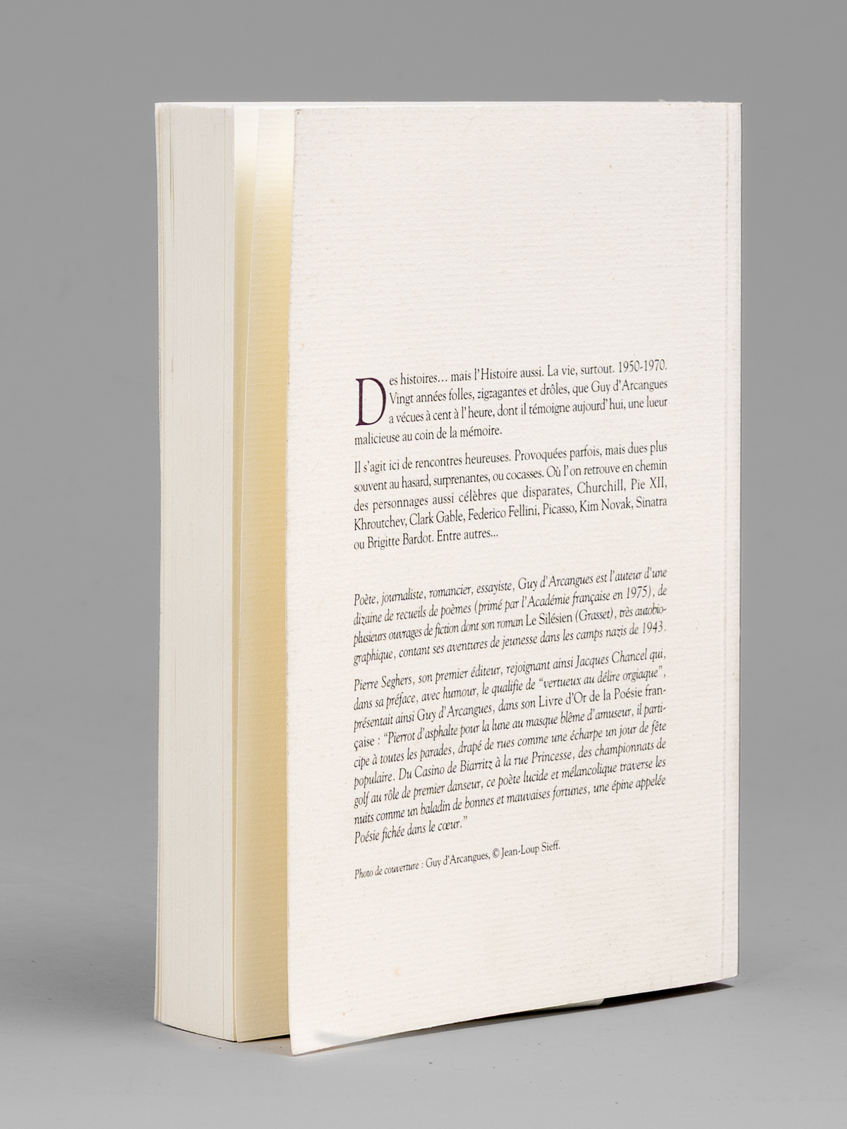 Commentaire : Bel envoi de Guy d'Arcangues 'Pour Maurice Druon, ces aventures, ces rencontres, ces personnages, toute une époque, celle, mythique, des années 1950-1970. En très amical hommage, en souvenir du Pays Basque'. Bon état pour cet exemplaire du tirage de luxe, dédicacé au Secrétaire Perpétuel de l'Académie Française Maurice Druon, qui a, comme à son habitude, replié l'angle de 2 feuillets dont les passages avaient plus particulièrement retenu son attention.
