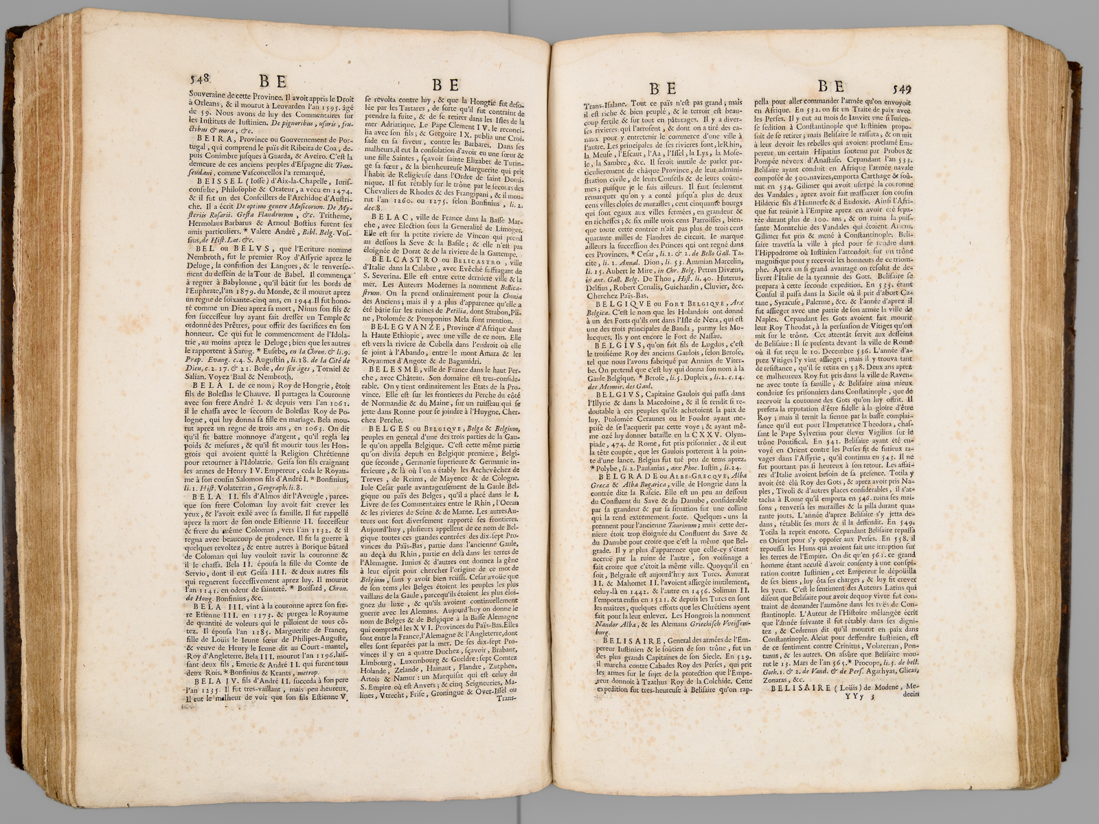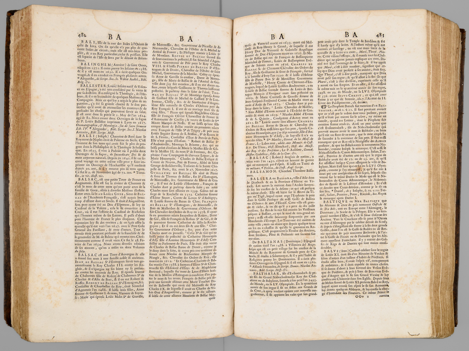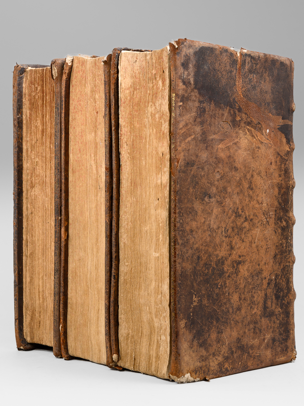Commentaire : Le troisième tome est le 'Supplément ou Troisième Volume du Grand Dictionnaire Historique' qui contient 'Des Matières de même Nature que celles des deux premiers Tomes'. Paru en 1689, ce supplément complétait la quatrième édition du Dictionnaire de Moreri, paru en 1687, mais également cette troisième édition de 1683. Etat satisfaisant (reliures fort. frottées mais bien solides, avec manques en coins, coupes et coiffes, restaurations au verso des 2 premiers feuillets du tome I et du second feuillet et du dernier feuillet du tome II avec qq. pertes de texte pour ces deux feuillets, 2 ff. remontés et contrecollés en marge intérieure en préface du tome premier, gardes volantes remplacées, bon état par ailleurs). Prix en l'état pour cet ensemble monumental.