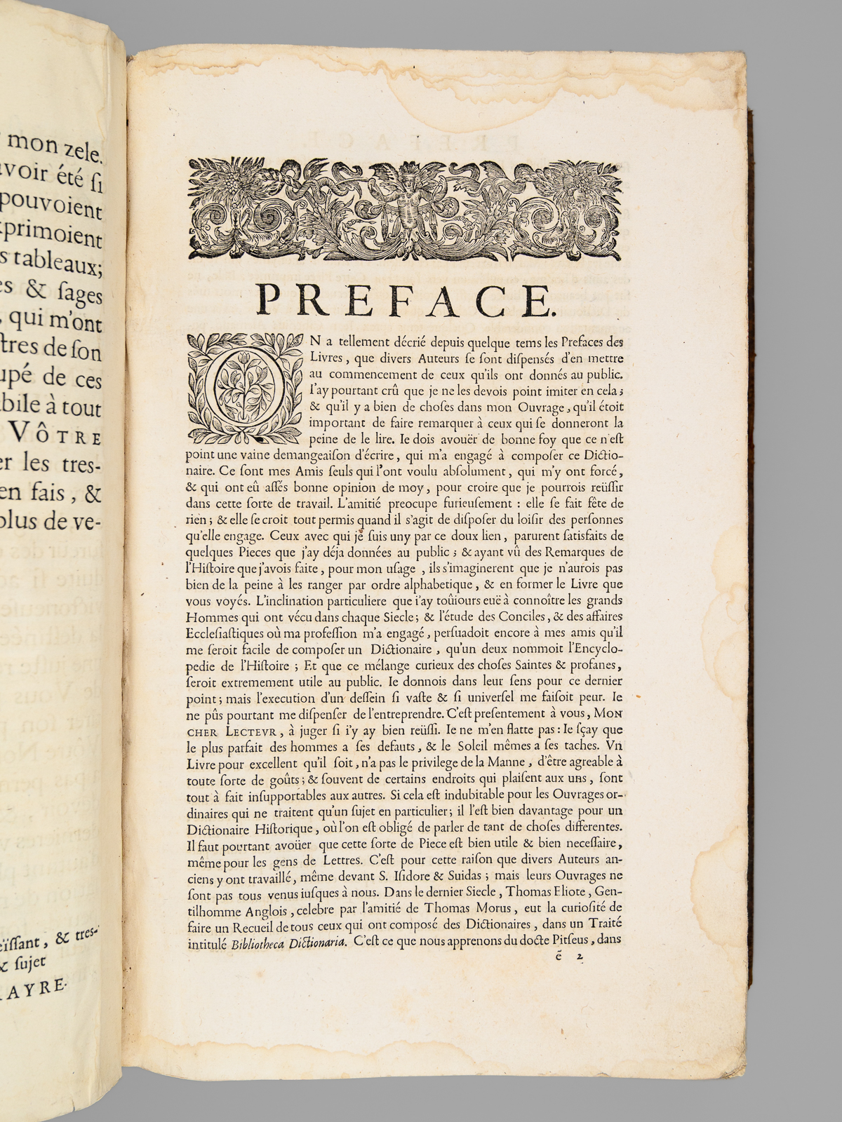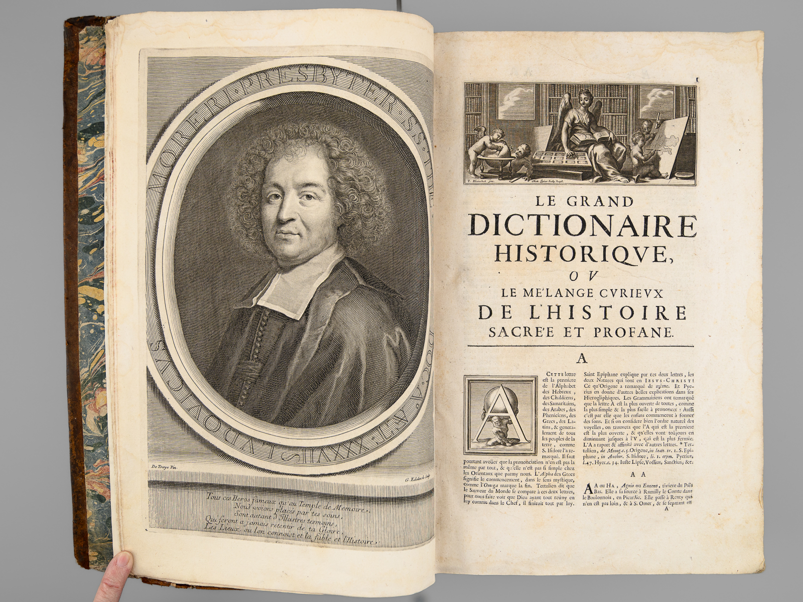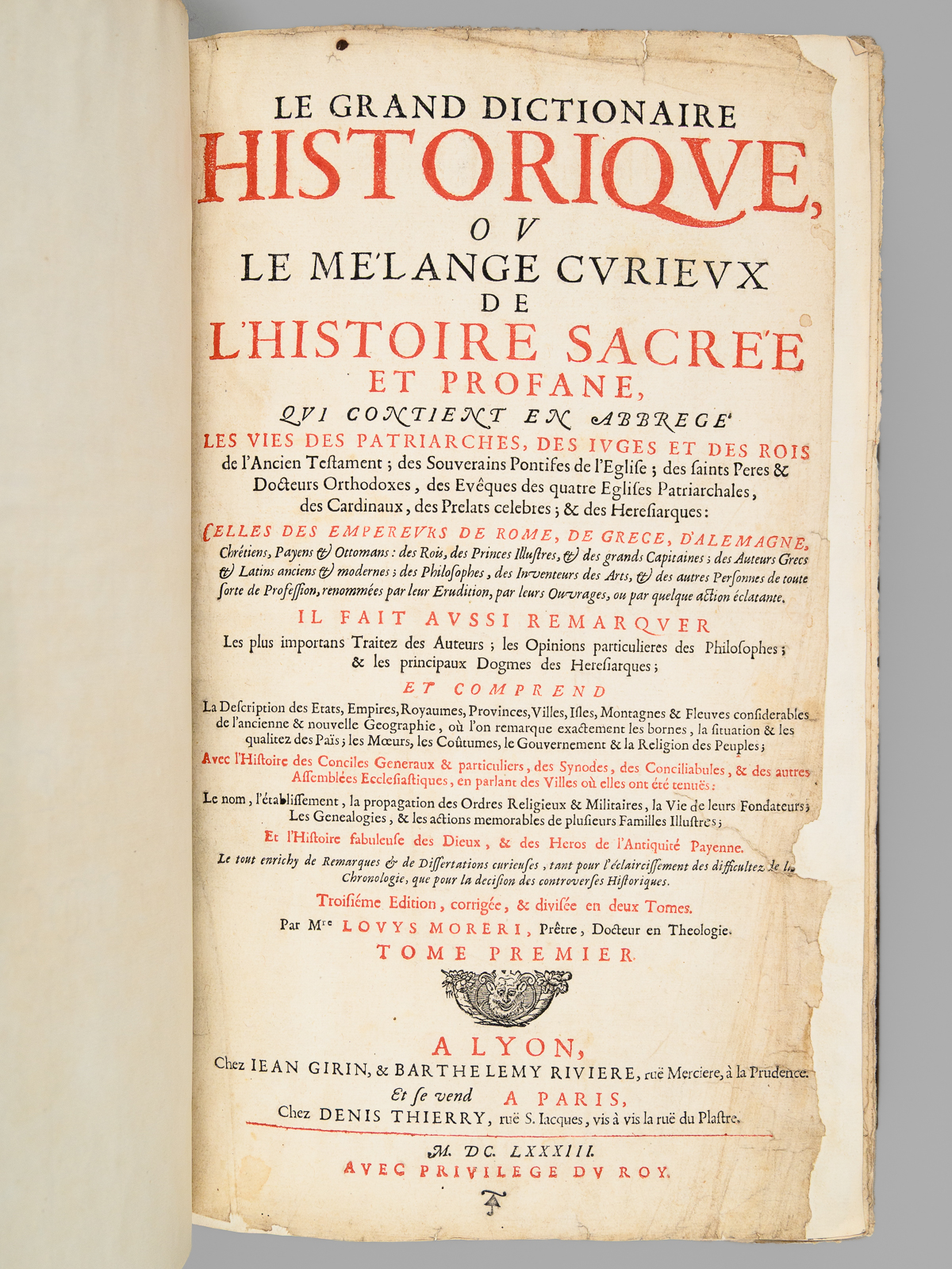 Troisième Edition, corrigée & divisée en deux Tomes, par Mr. Louis Moreri, Prêtre, Docteur en Théologie, 3 vol. fort in-folio reliure de l'époque pleine basane brune, dos à 6 nerfs orné (différences de reliure entre les tomes 1-2 et le supplément), Chez Jean Girin & Barthélémy Rivière, A Lyon, se vend à Paris, Chez Denis Thierry, 1683 et Chez Denis Thierry, 1689 (tome III), 8 ff. (titre, frontispice, 'Au Roy', Préface et portrait de l'auteur), 1359 pp. ; 2 ff., 1263 pp. ; 3 ff., 1238 pp.