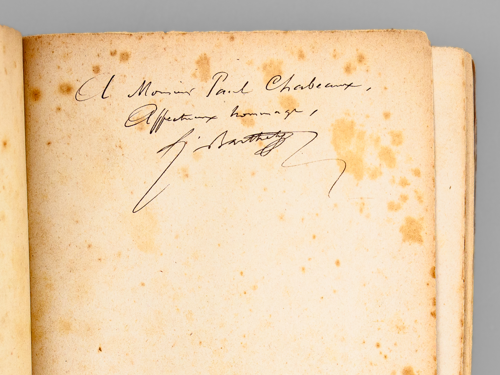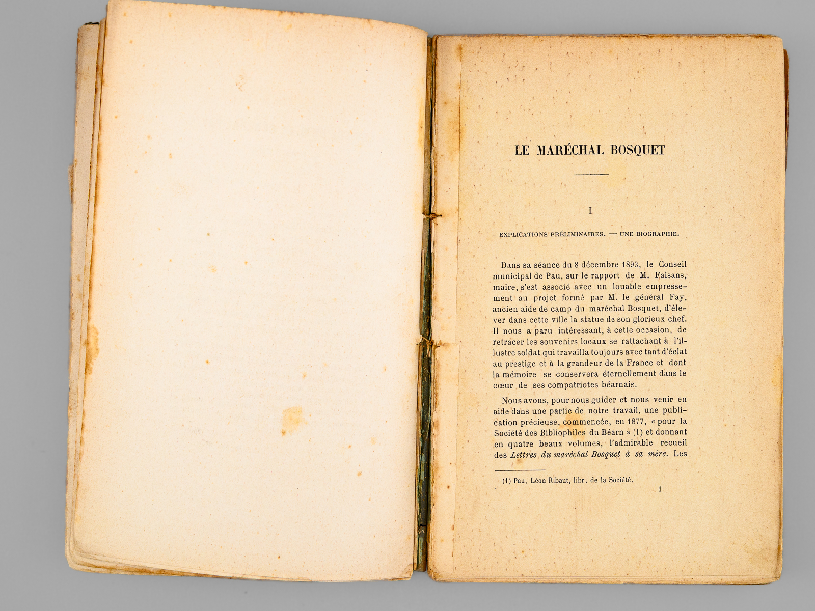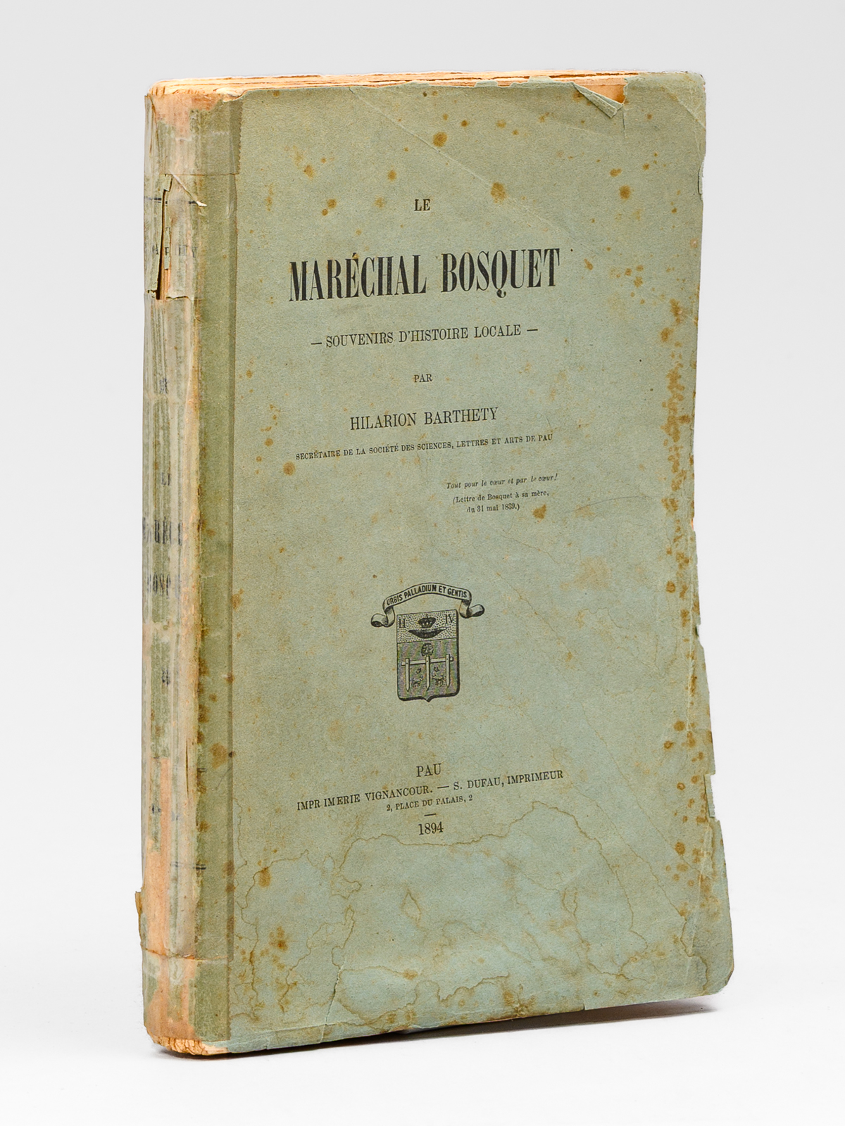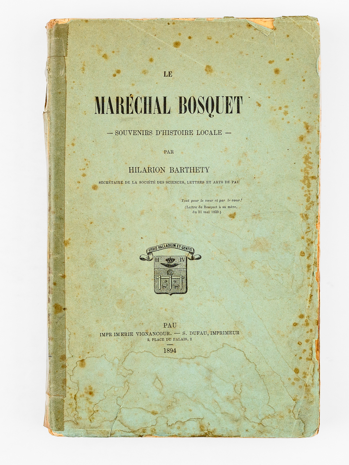 Commentaire : Envoi de l'auteur, l'historien et archéologue du Béarn Hilarion Barthéty (1842-1913) à Paul Chabeaux. Le maréchal Bosquet (1810-1861) né à Mont-de-Marsan et mort à Pau, est célèbre pour sa conduite lors de la conquête de l'Algérie et pendant la guerre de Crimée. Prix en l'état pour cet exemplaire à faire relier (exemplaire très faible avec adhésif en dos).