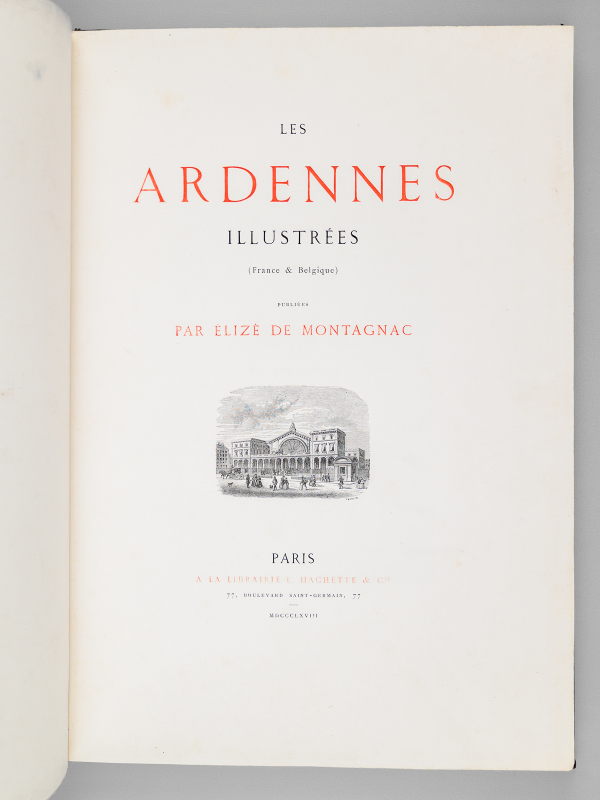 Publiées par Élizé de Montagnac, 1 vol. in-folio reliure demi-basane bordeaux, dos à 5 nerfs, À la Librairie L. Hachette & Cie, Paris, 1868, 133 pp. avec 15 planches hors texte (dont 14 sur fond teinté Chine)