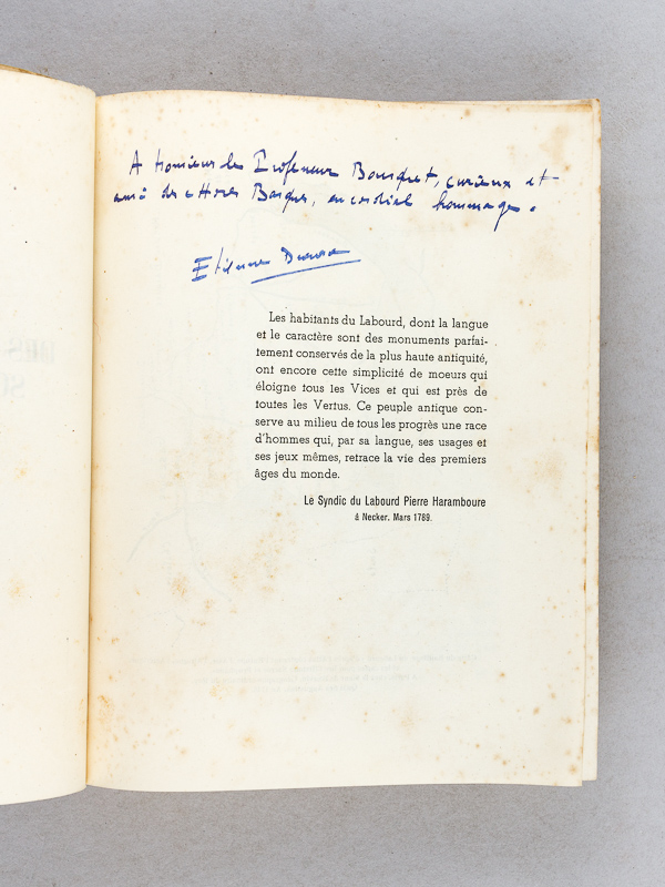 1 vol. in-8 br., s.n., 1950, 480 pp. Commentaire : Envoi de l'auteur 'à Monsieur le Professeur Bousquetn curieux et ami des lettres Basques'. Etat très satisfaisant (petites griffures en dos, rouss. importantes en dos et texte) pour cet ouvrage rare.