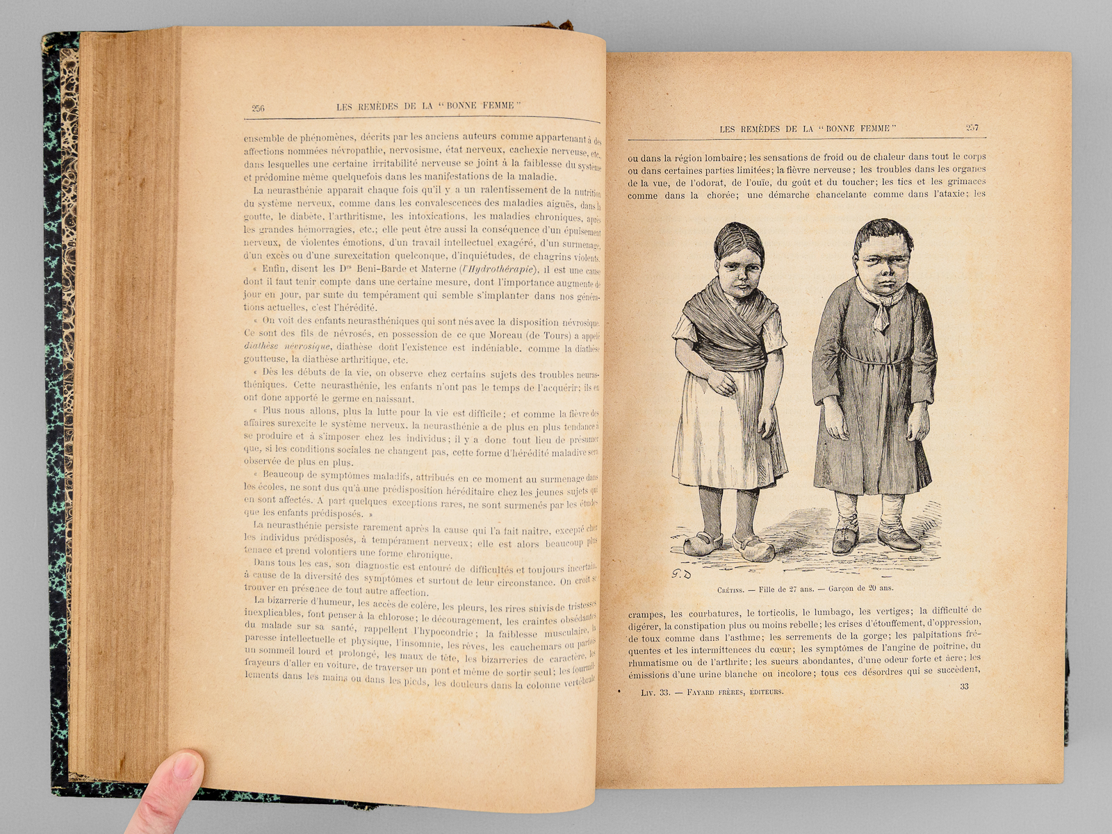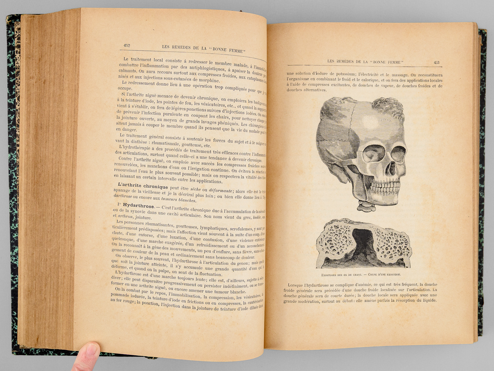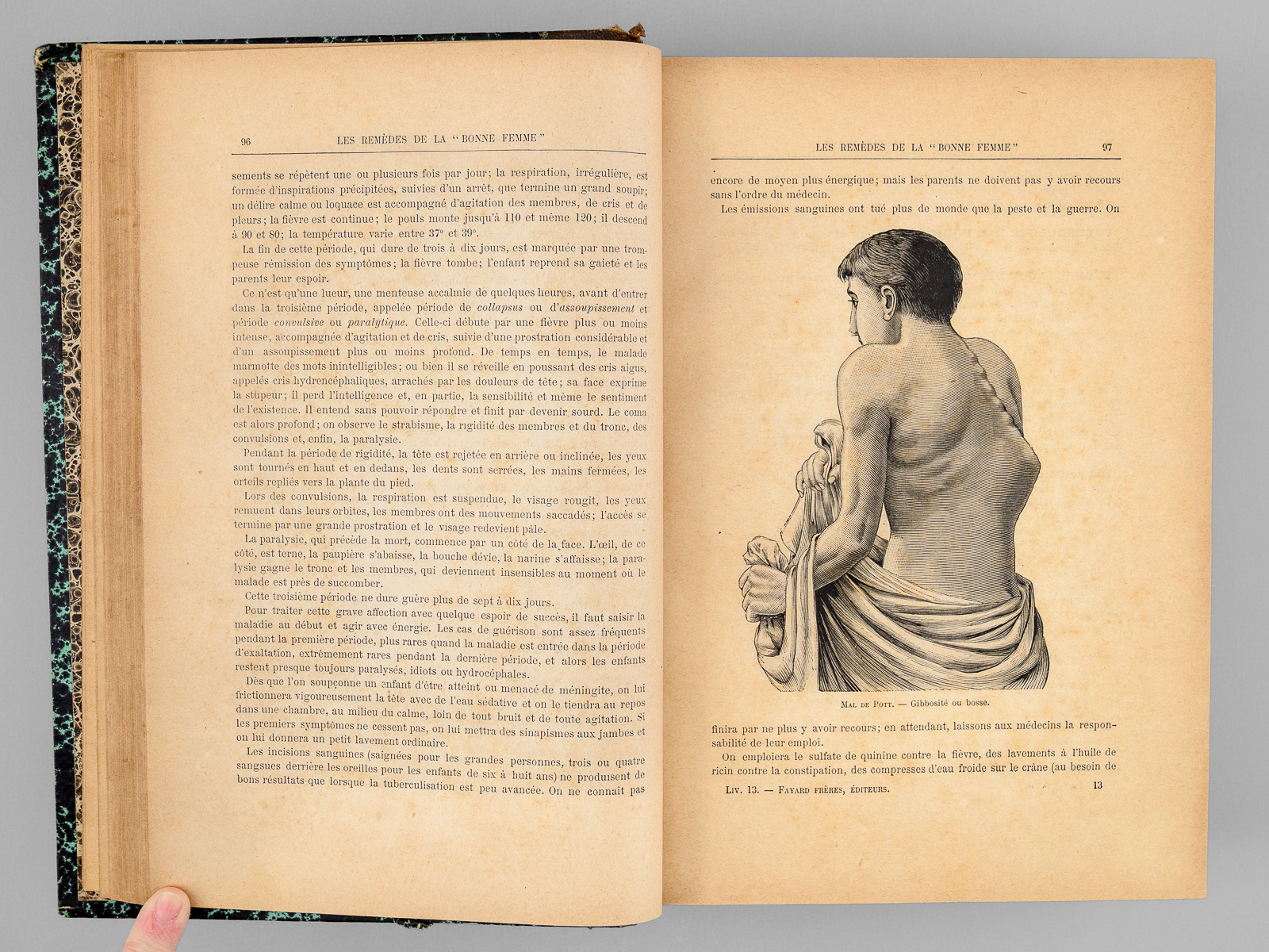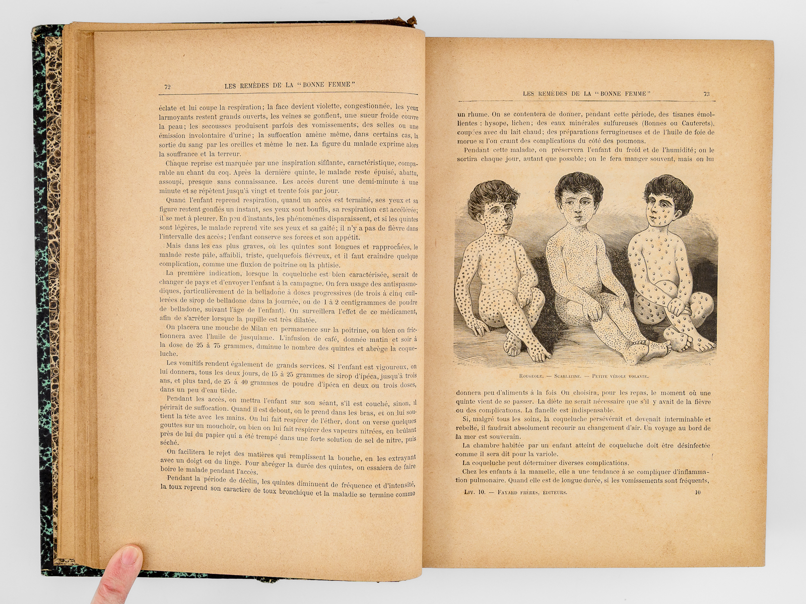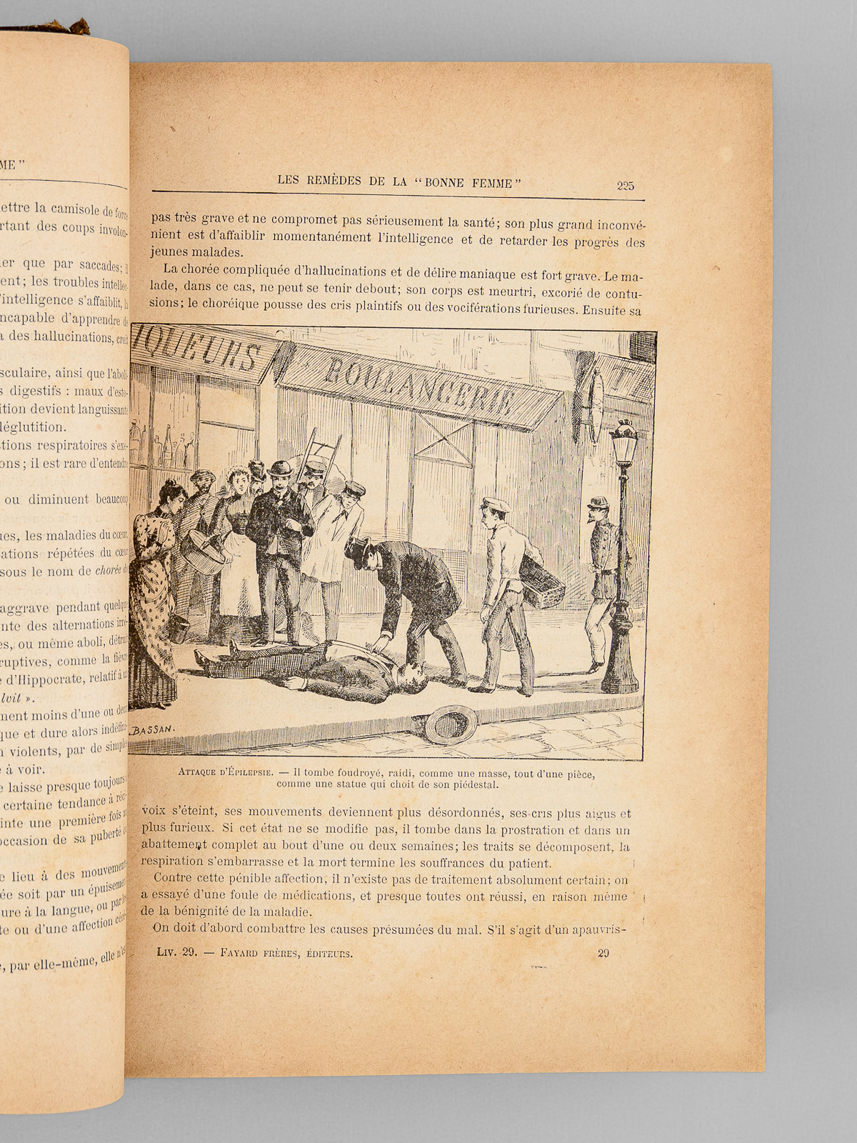 1 vol. grand et fort in-8 reliure demi-basane marron, Fayard Frères, Éditeurs, Paris, s.d. [ 1895-1897 ], 1596 pp. Commentaire : Impressionnante encyclopédie médicale populaire, mêlant le drame populaire et les savoirs populaires ou folkloriques aux connaissances médicales du temps (avec de nombreuses illustrations, certaines en couleurs). Etat très satisfaisant (coiffes frottées, qq. traces d'usage, bon état par ailleurs).