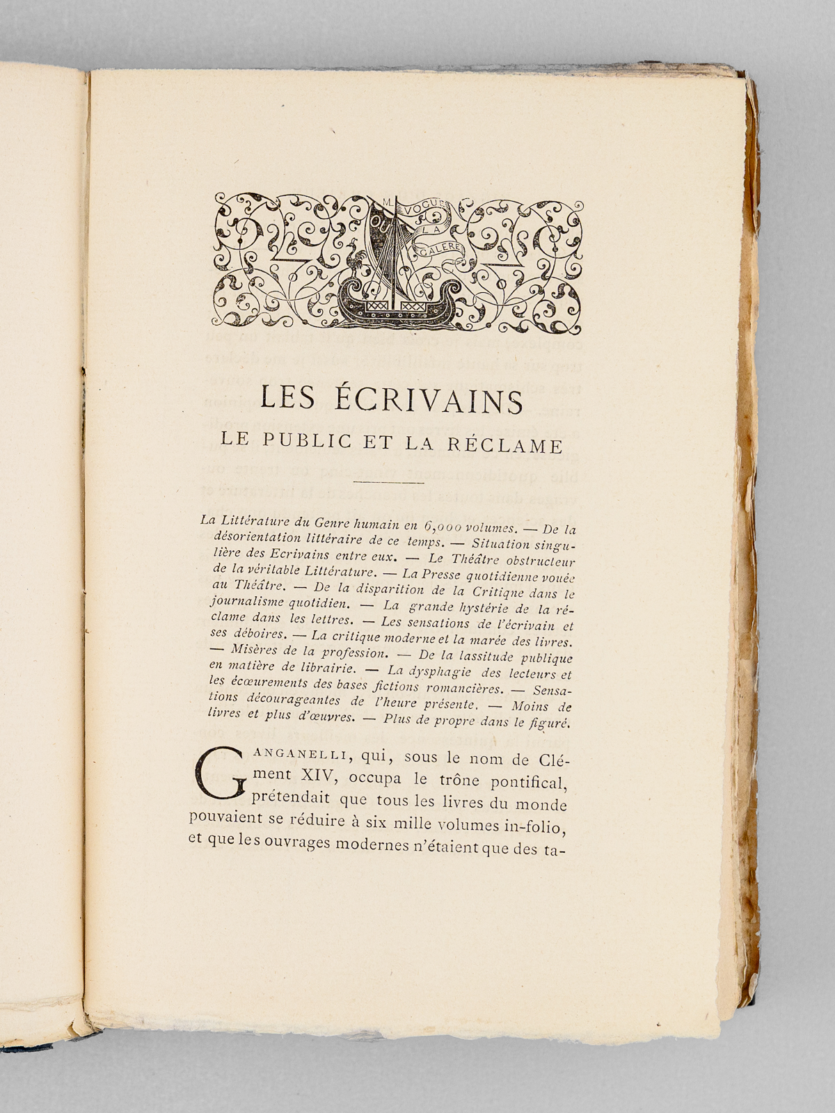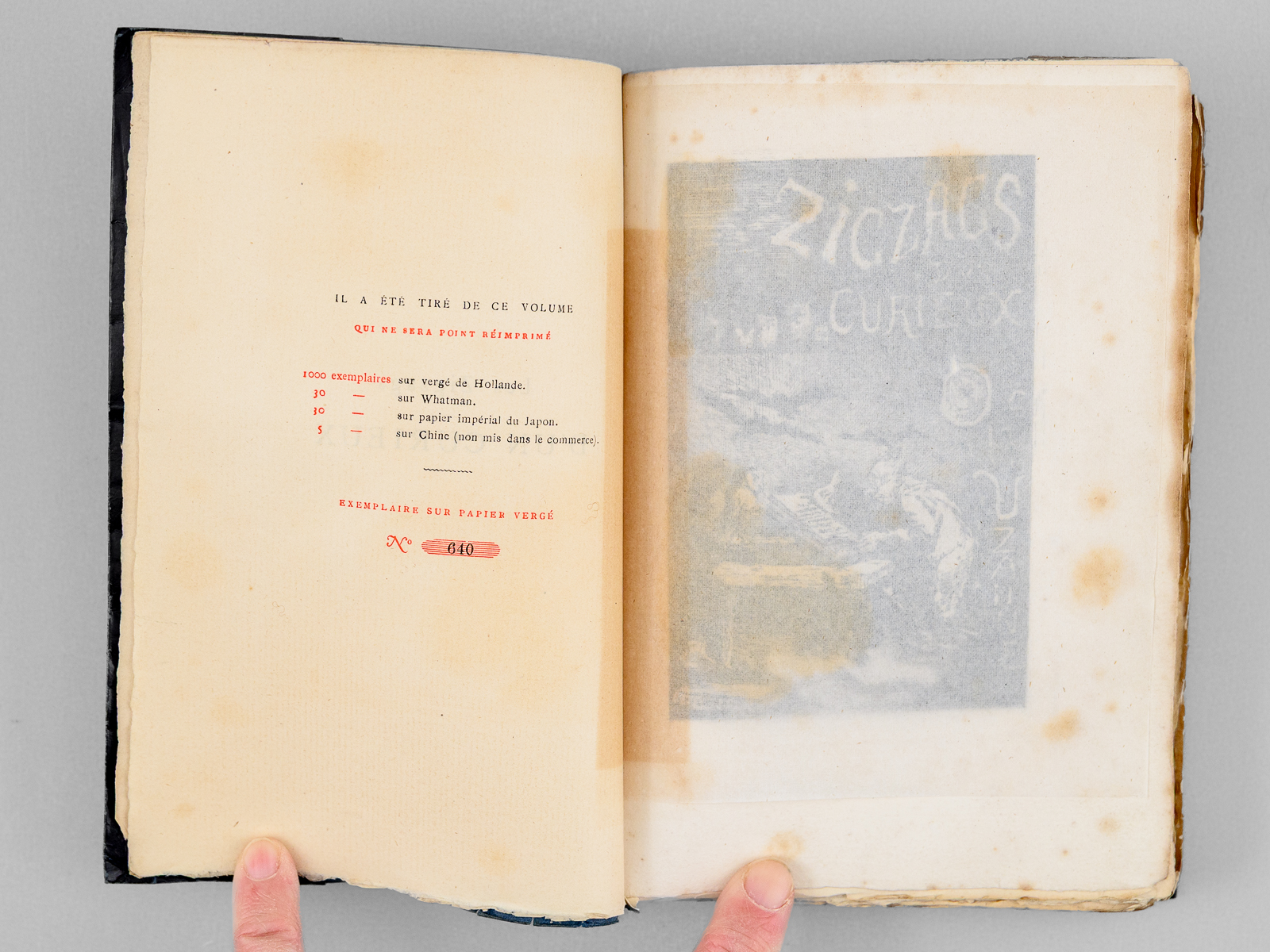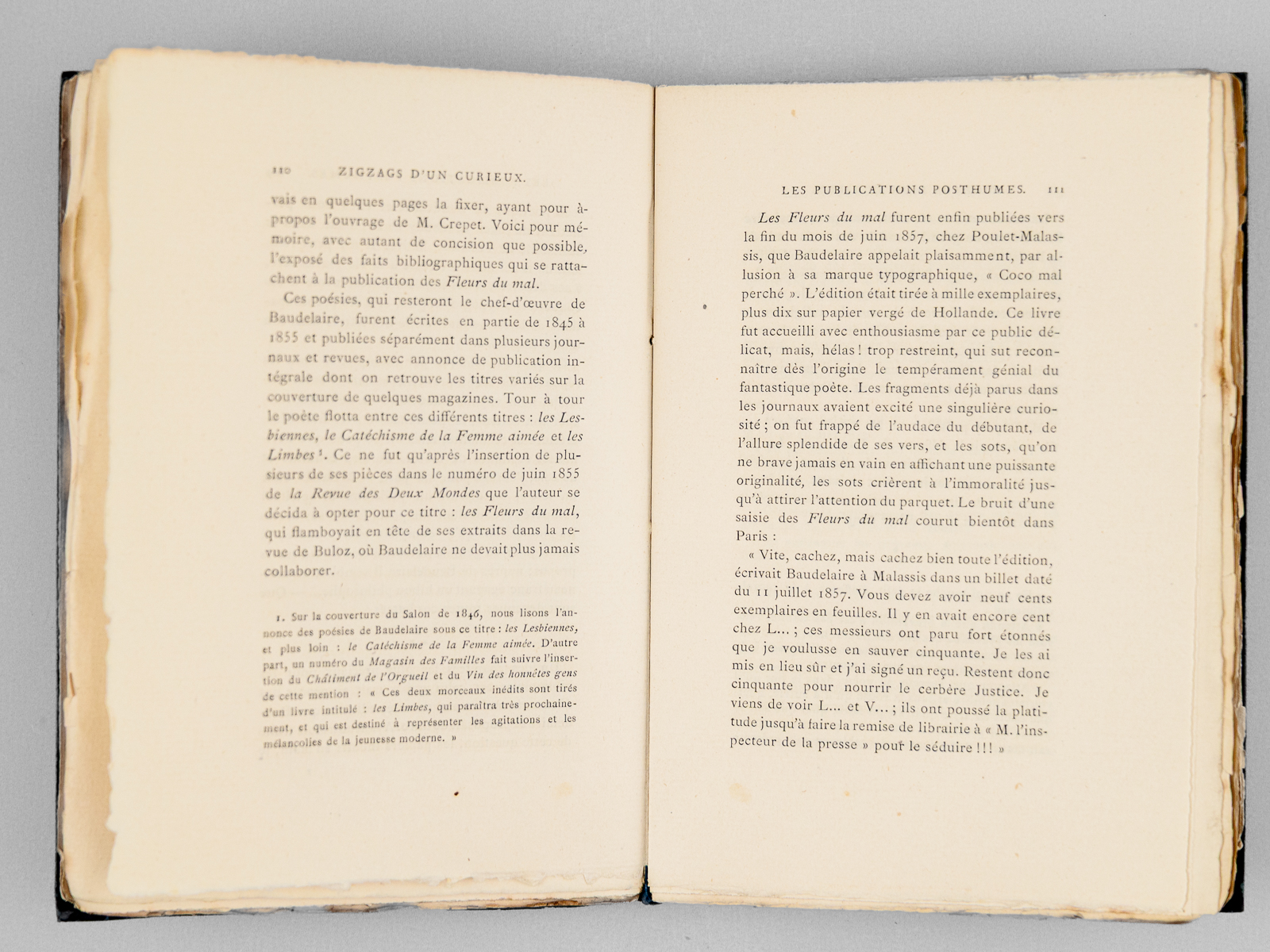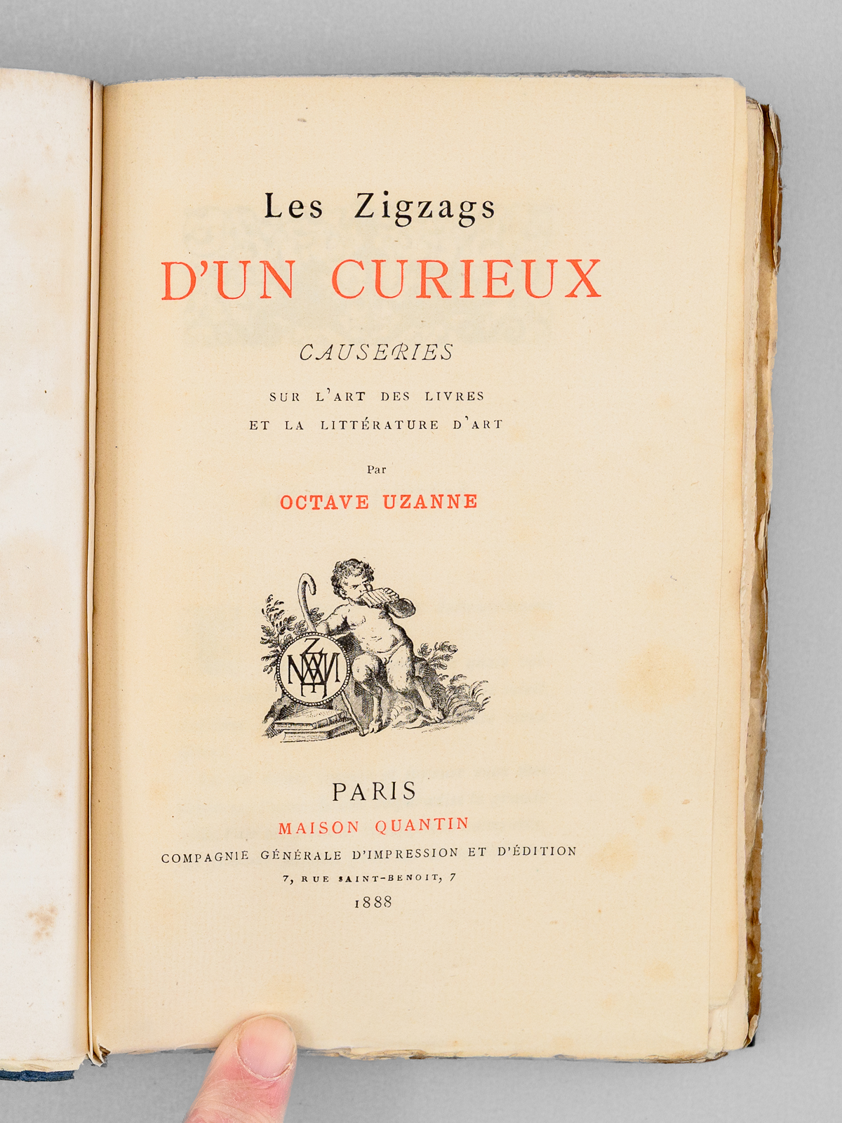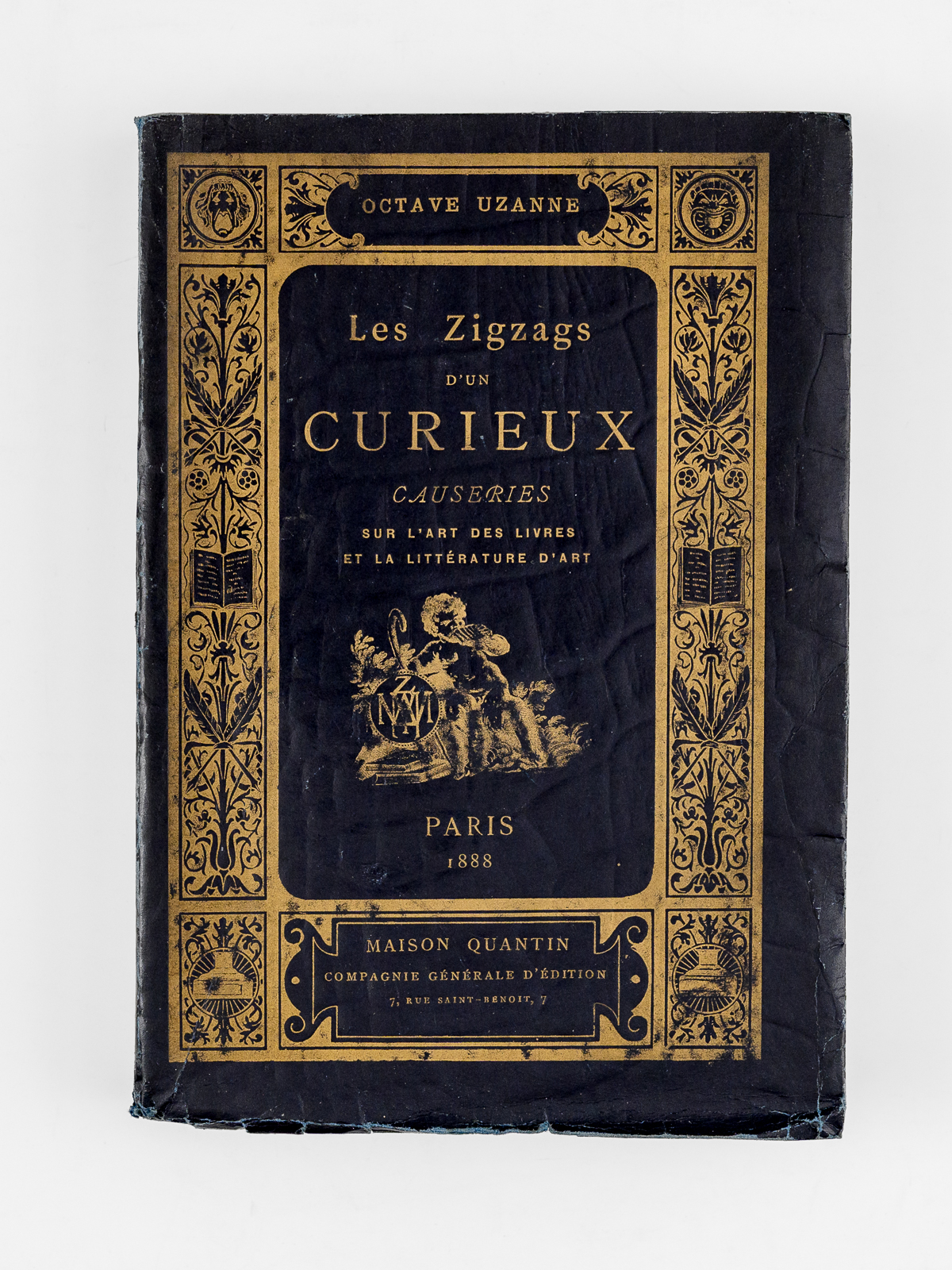 Un des 1000 exemplaires sur vergé de hollande numérotés (n° 640), 1 vol. grand in-12 br., Maison Quantin, Compagnie générale d'impression et d'édition, Paris, 1888, 300 pp. Commentaire : Bon état (couv. très lég. frottée). Octave Uzanne aborde notamment les thèmes suivants : les femmes bibliophiles, la gravure (Henri Béraldi, Jules Chéret...), les publications posthumes, Honoré de Balzac, les bibliophiles collectionneurs, l'Hôtel Drouot, les amateurs d'autographes