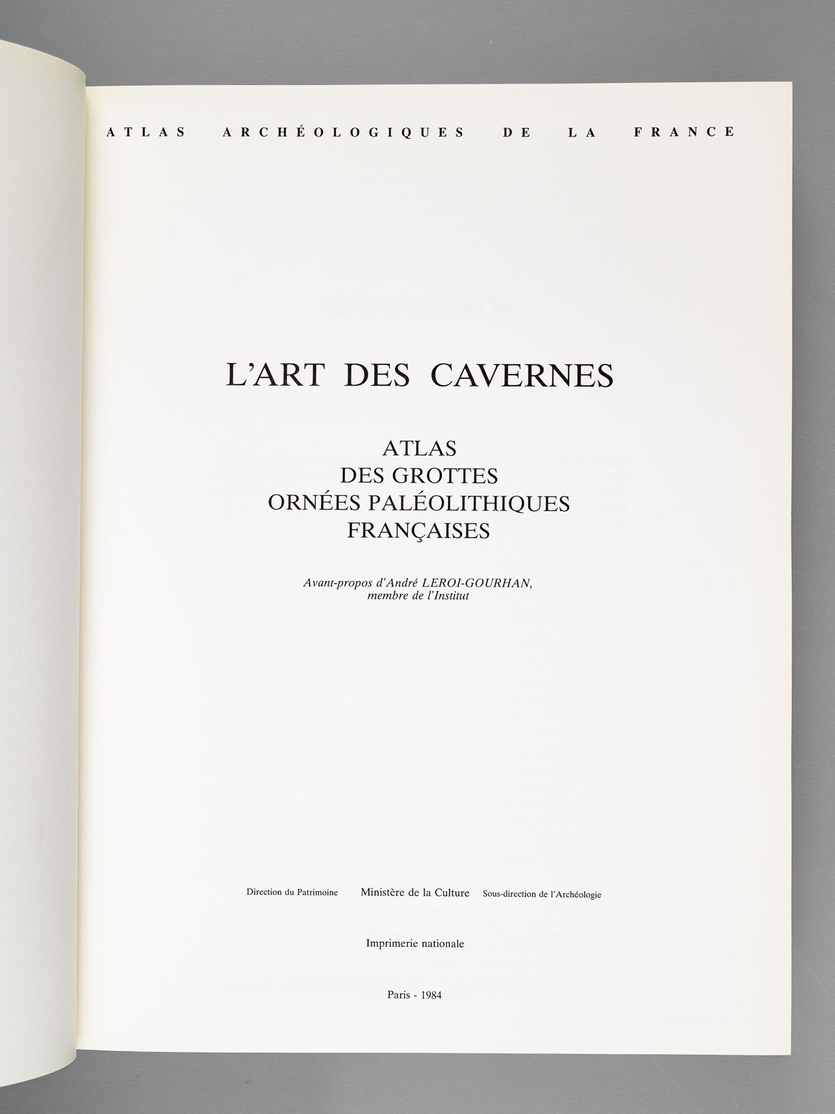 Avant-propos d'André Leroi-Gourhan, 1 vol. grand in-4 reliure pleine toile éditeur sous jaquette illustrée, ''Atlas archéologiques de la France'', Ministère de la Culture, Imprimerie Nationale, Paris, 1984, 673 pp.