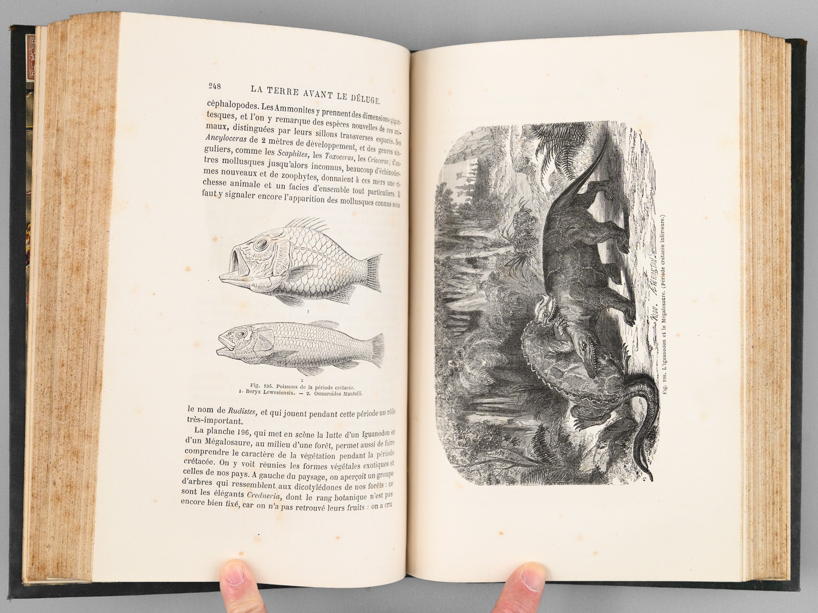 Cinquième édition, ouvrage contenant 25 vues idéales de paysages de l'ancien monde, dessinées par Riou, 322 autres figures et 8 cartes géologiques coloriées, 1 vol. in-8 reliure de l'époque demi-chagrin vert, dos à 4 nerfs ornés, fers de prix du Département de Seine-et-Oise, Cours d'Adulte 1865-1866 Prix décerné à l'Instituteur, Librairie de L. Hachette et Cie, Paris, 1866, 506 pp. Commentaire : Agréable exemplaire orné d'un très intéressant fer de prix (lég. anciennes traces d'humidité en plat, très bon état par ailleurs).