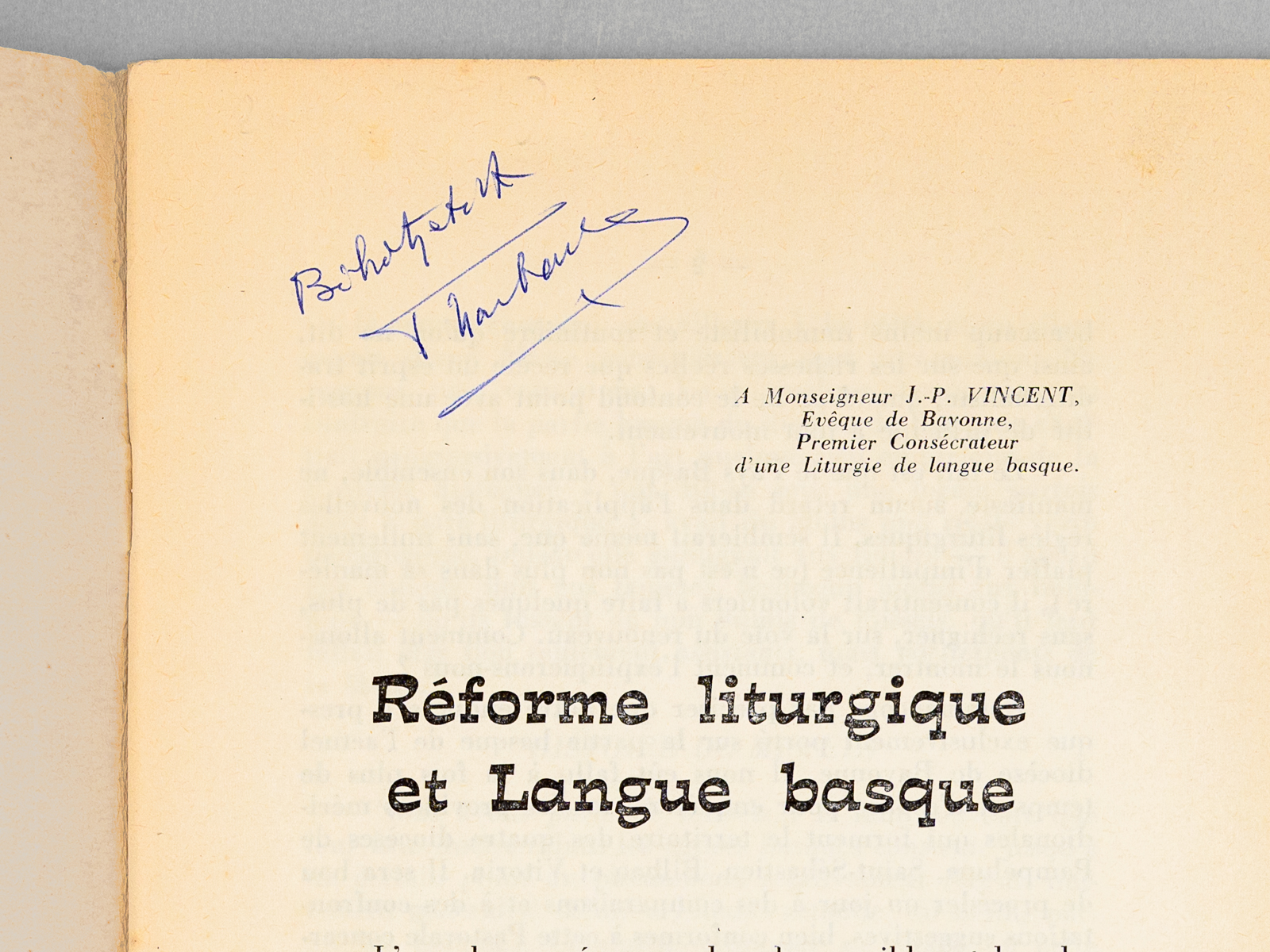 Commentaire : Tiré-à-part de cet article important pour la mise en place des réformes du Concile Vatican II en langue basque. Bon état (ex-libris ms., couv. lég. frottée).