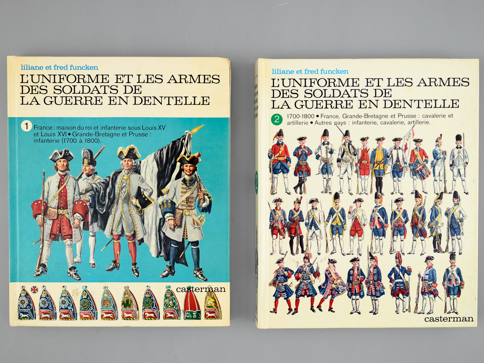 2 vol. in-4 cartonnage éditeur illustré, Casterman, Tournai, 1975 et 1976, 156 ; 156 pp. Rappel du titre complet : L'Uniforme et les Armes des Soldats de la Guerre en Dentelle (2 Tomes - Complet) Tome I : France : maison du Roi et infanterie sous Louis XV et Louis XVI - Grande-Bretagne et Prusse : Infanterie (1700 à 1800) ; Tome II : 1700-1800. France, Grande-Bretagne et Prusse : cavalerie et artiellerie. Autres pays : infanterie, cavalerie, artillerie