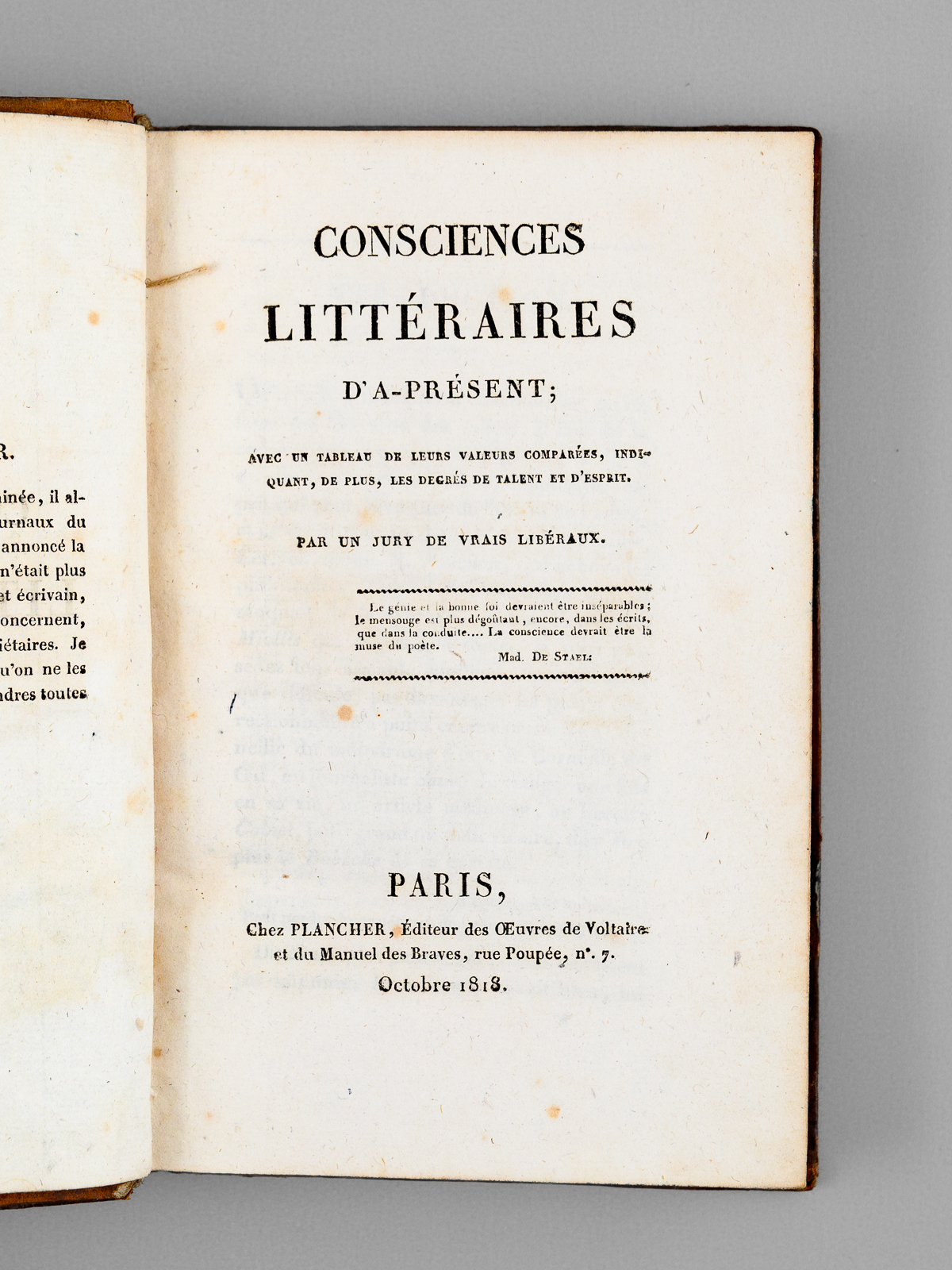 Consciences littéraires d'a-présent ; avec un tableau de leurs valeurs comparées, indiquant, de plus, les degrés de talent et d'esprit. [ Edition originale ] - Auteur: UN JURY DE VRAIS LIBERAUX ; [ LEBRUN-TOSSA, Jean-Antoine ] - Année d'édition: 1818 |