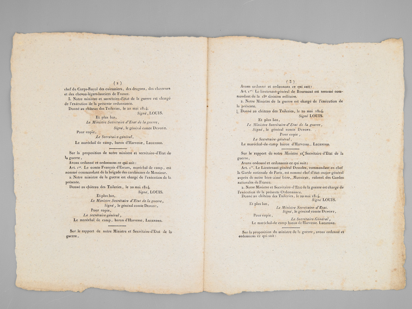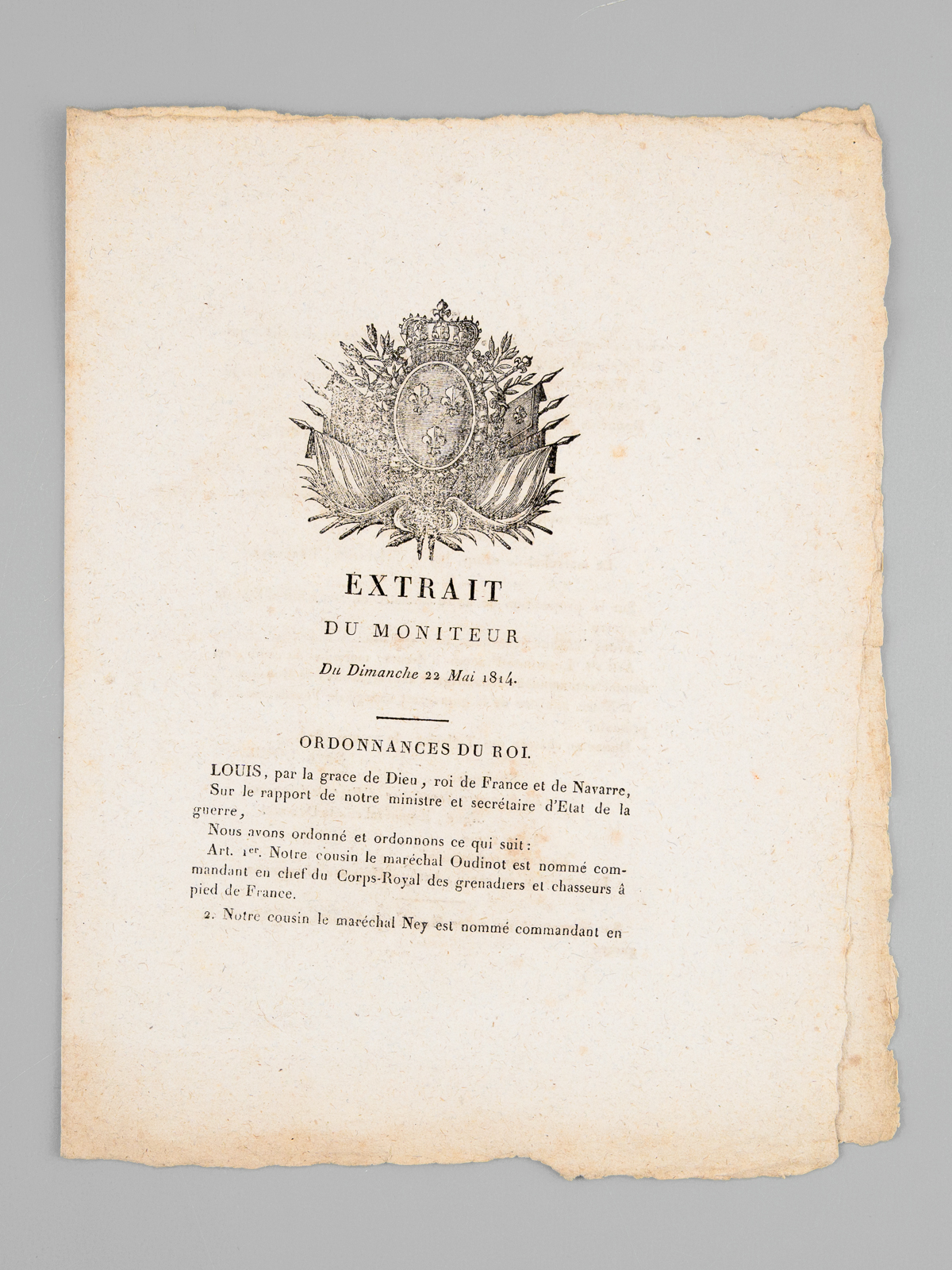Extrait du Moniteur du Dimanche 22 Mai 1814. Ordonnances du Roi : Louis, par la grace de Dieu, roi de France et de Navarre [ ... ] Nous avons ordonné et ordonnons ce qui suit : Art. 1er : Notre cousin le maréchal Oudinot est nommé com