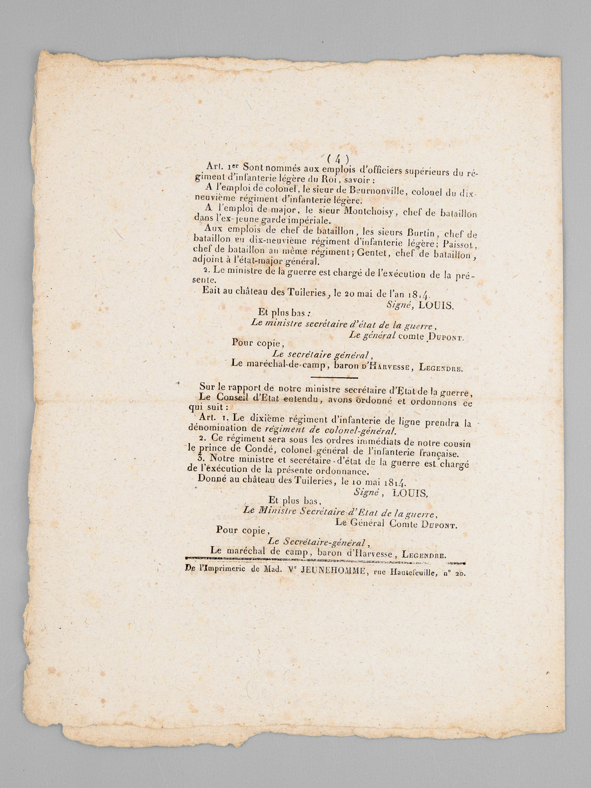 1 brochure in-4, De l'Imprimerie de Mad. Ve Jeunehomme, rue Hautefeuille, n° 20, [ Paris ], s.d. [mai 1814 ], 4 pp. Commentaire : Cette brochure évoque notamment les nominations des maréchaux d'Empire Oudinot et Ney dans l'armée du Roi, lors de la Première Restauration. Bon état