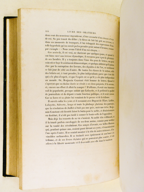 Quatorzième édition, ornée de 27 portraits gravés sur acier, 1 vol. in-4 reliure de l'époque demi-chagrin à coins vert, dos à 4 nerfs orné, toutes tranches dorées, Pagnerre, Paris, 1844, 547 pp. Commentaire : Exemplaire agréablement relié (rel. lég. frottée, ex-dono au verso du frontispice, rouss.). Un grand classique sur l'éloquence, essentiellement politique, de la Révolution à la Monarchie de Juillet.