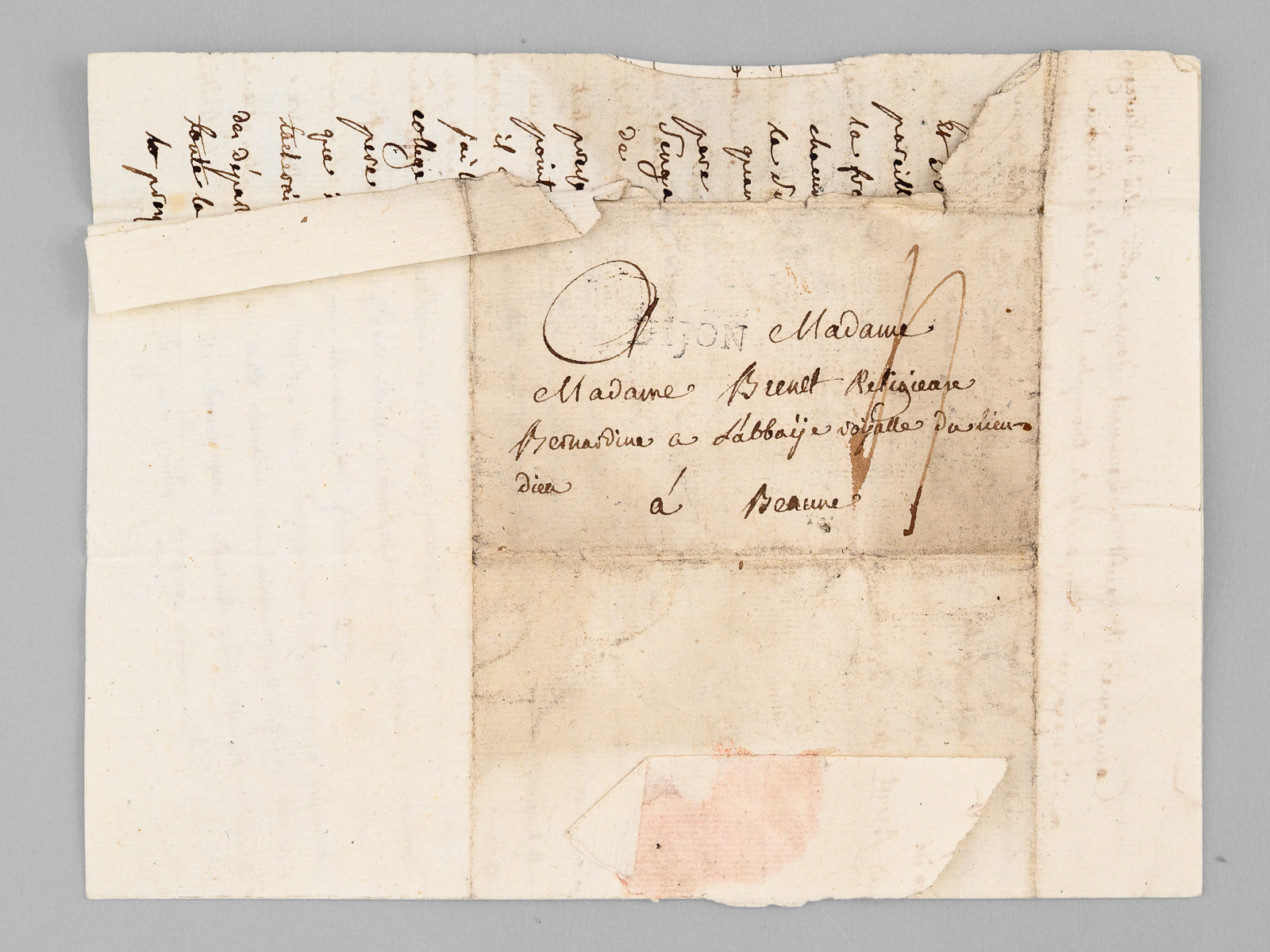 1 lettre autographe signée de 2 ff. (format 21,5 x 16cm ) avec cachet de cire et cachet postal 'Dijon' : [ Belle L.AS. datée du 11 mai 1790, adressée à Madame Brenet Religieuse Bernardine a l'Abbaye du Lieu-Dieu à Beaune ] 'Dijon, 11 mai 90. Il ya déjà longtemps que je ne t'ai donnée de nouvelles tu penses peut-être que je suis indifférent à en recevoir des tiennes [... ] J'avais des affaires comme tu le sais je t'apprendrai que lundi 3 de ce mois j'ai soutenu mon dernier examen. Tu va me dire que je m'en suis tiré avec les Etrivières, pas du tout ma petite poule j'ai été complimenté et comblé d'éloges si bien que sans délibérer et sans me faire retirer on m'a prodigué des louanges. Il faut avouer que l'on a bien peu ménagé ma modestie. Quoiqu'il en soit, ces messieurs ont eu la bonté d'être content de la preuve que je leur ai donné de mes talents il n'y a eu que moi de mécontent [ ... ] Je serais très fâché de n'avori pas encore une thèse à soutenir pour me dédommager. Cette thèse sera publique à l'hôtel-de-ville en présence de tous les officiers municipaux de cette ville. Juge si je vais la travailler [...] J'appris de Moissey lorsque j'y allai que ma tante Thérèse avait fait une donation [... il explique ensuite que de son côté il n'a fait aucun arrangement avec son père 'parce qu'il ne veut s'engager à rien' : ] 'il a bien eu tort car il est presque sans le sou à présent et j'ai bien eu des maux pour me faire aggréger cette année au collège des médecins de Dijon. J'oublie de te dire que mon père et mon frère l'aîné viendront à ma thèse. Je voudrais que depuis Dijon ils voulussent faire le voyage de Beaune ; je tâcherai de les y décider. On songe actuellement à la formation des départements et cette semaine on aura une confédération de toute la [ milice ? ] de Bourgogne : la ville sans cela [ serait de reste ? ] presque tous les gens riches et aisés se sont [... ] à leur Campagne, il y avait évidemment deux partis celui des Enragés ou démagogues outrés a été le triomphant tout cela je l'avoue n'est pas amusant quoique je sois neutre fort heureusement. Je suis cependant faché de bien des choses. Adieu ma petite donne moi de tes nouvelles et ne m'oublie pas auprès de Mde [ ... ] et et Mde sa soeur [ ... ]. Ton ami Brenet']