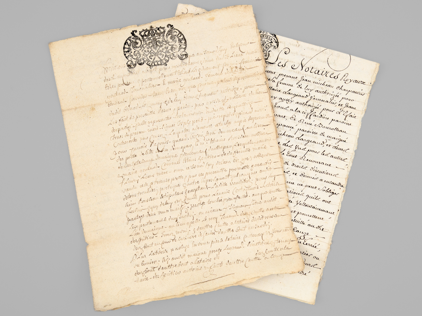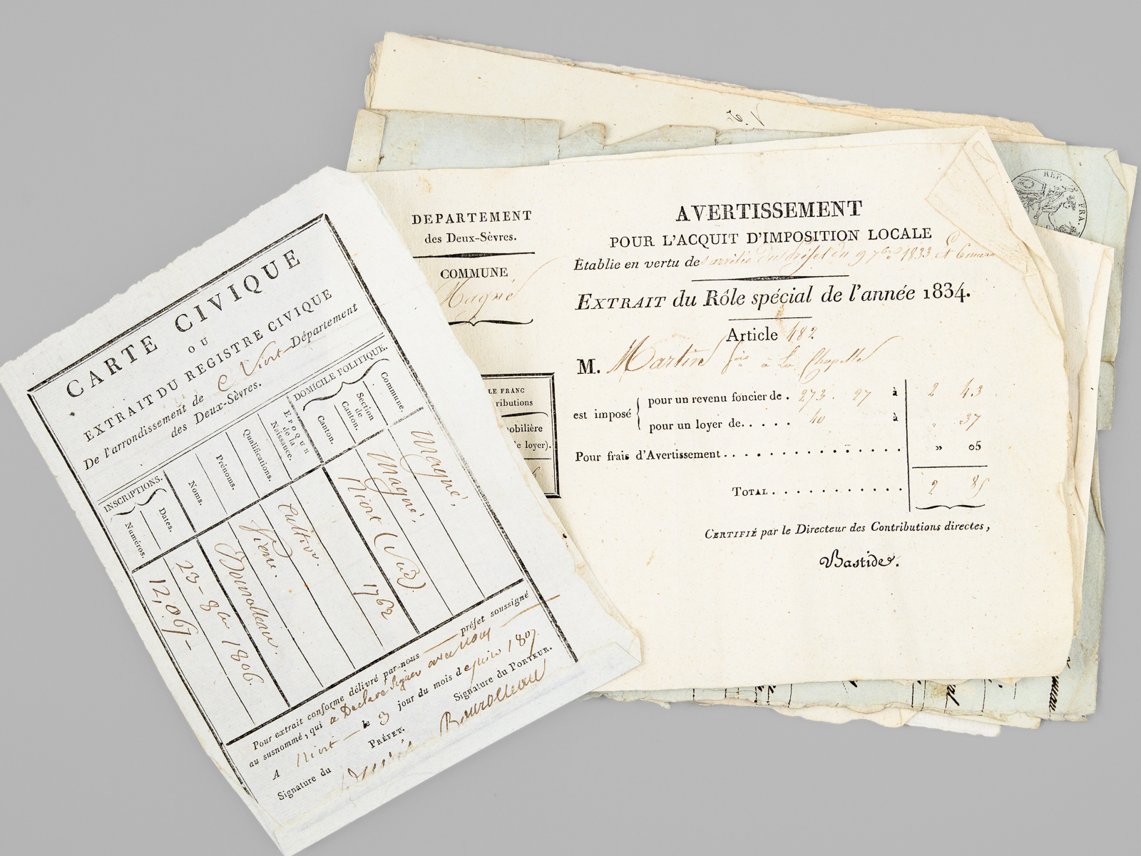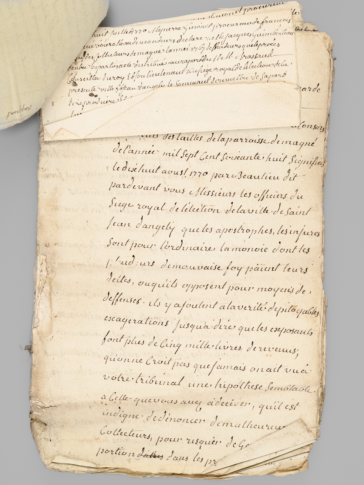 [ Lot d'archives XVIIIe et début XIXe relatifs à la commune de Magné [ Deux-Sèvres ]] I : 4 pièces XVIIIe dont acte de vente sur vélin, 8 ff. datés de 1697, acte de vente daté de 1680,II : Importante liasse de 38 documents : pièces réunies en défense vers 1767-1769 par François et René Bourolleau, garde-hara et garde étalon à Magné : 'Les parties de François Bourolleau garde harras et René Bourolleau Garde Etalon répliquant aux ecritures de jean rodier et consors Collecteurs des tailles de la parroisse de Magné de l'année mil Sept Cent Soixante huit Signifiées le dix huit aoust 1770 par Beaulieu dit pardevant vous Messieurs les officiers du Siege royal de l'élection de la ville de Saint Jean d'angely que les apostrophes, les injures Sont pour l'ordinaire la monnoie dont les plaideurs de mauvaise foy paient leurs dettes, ou qu'ils opposent pour moyens de deffenses. ils y ajoutent a la vérité de pitoyables exagerations jusqu'à dire que les exposants font plus de Cinq mille livres de revenus; qu'on ne Croit pas que jamais on ait vue a votre tribunal une hipothese Semblable a Celle que vous avez à decider, qu'il est indigne de dénoncer de malheureux Collecteurs [ etc... ] ; III : Lot d'une quarantaine de pièces diverses (Carte civique de l'arrondissement de Niort de juin 1807, contract d'affermage, quittance, reçu divers, etc...) daté du Consulat, de l'Empire, de la Restauration et qq. documents postérieurs.