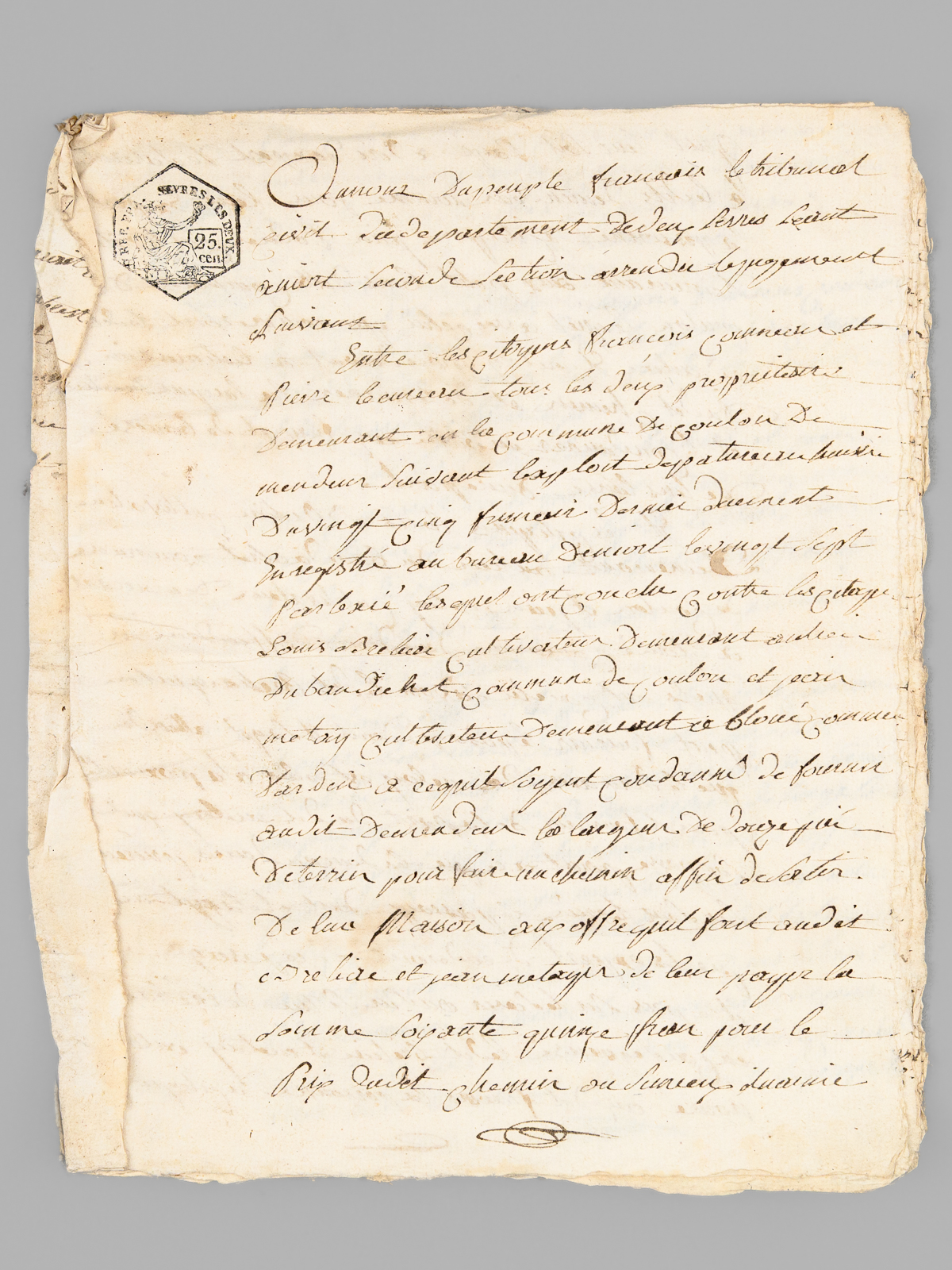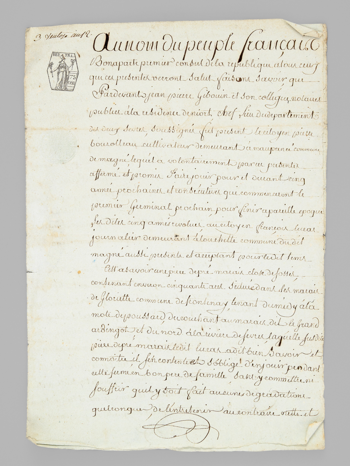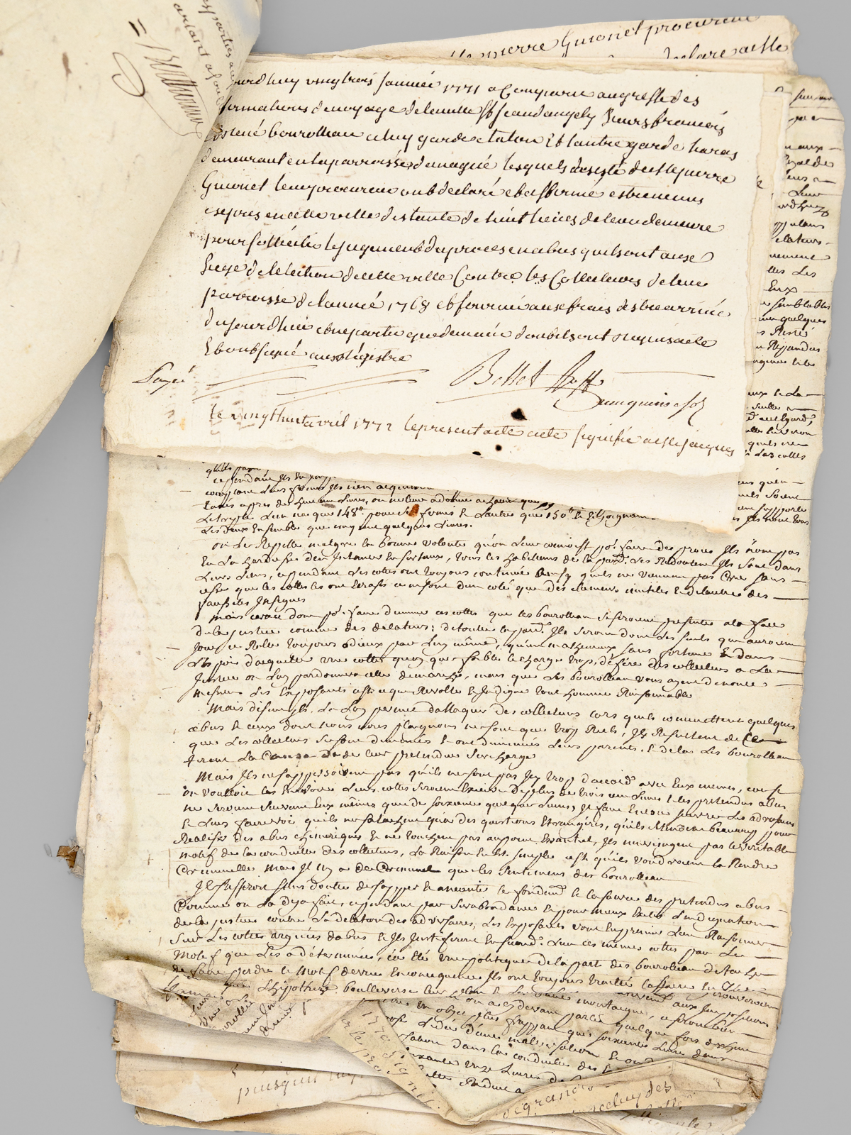 [ Lot d'archives XVIIIe et début XIXe relatifs à la commune de Magné [ Deux-Sèvres ]] I : 4 pièces XVIIIe dont acte de vente sur vélin, 8 ff. datés de 1697, acte de vente daté de 1680,II : Importante liasse de 38 documents : pièces réunies en défense vers 1767-1769 par François et René Bourolleau, garde-hara et garde étalon à Magné : 'Les parties de François Bourolleau garde harras et René Bourolleau Garde Etalon répliquant aux ecritures de jean rodier et consors Collecteurs des tailles de la parroisse de Magné de l'année mil Sept Cent Soixante huit Signifiées le dix huit aoust 1770 par Beaulieu dit pardevant vous Messieurs les officiers du Siege royal de l'élection de la ville de Saint Jean d'angely que les apostrophes, les injures Sont pour l'ordinaire la monnoie dont les plaideurs de mauvaise foy paient leurs dettes, ou qu'ils opposent pour moyens de deffenses. ils y ajoutent a la vérité de pitoyables exagerations jusqu'à dire que les exposants font plus de Cinq mille livres de revenus; qu'on ne Croit pas que jamais on ait vue a votre tribunal une hipothese Semblable a Celle que vous avez à decider, qu'il est indigne de dénoncer de malheureux Collecteurs [ etc... ] ; III : Lot d'une quarantaine de pièces diverses (Carte civique de l'arrondissement de Niort de juin 1807, contract d'affermage, quittance, reçu divers, etc...) daté du Consulat, de l'Empire, de la Restauration et qq. documents postérieurs.
