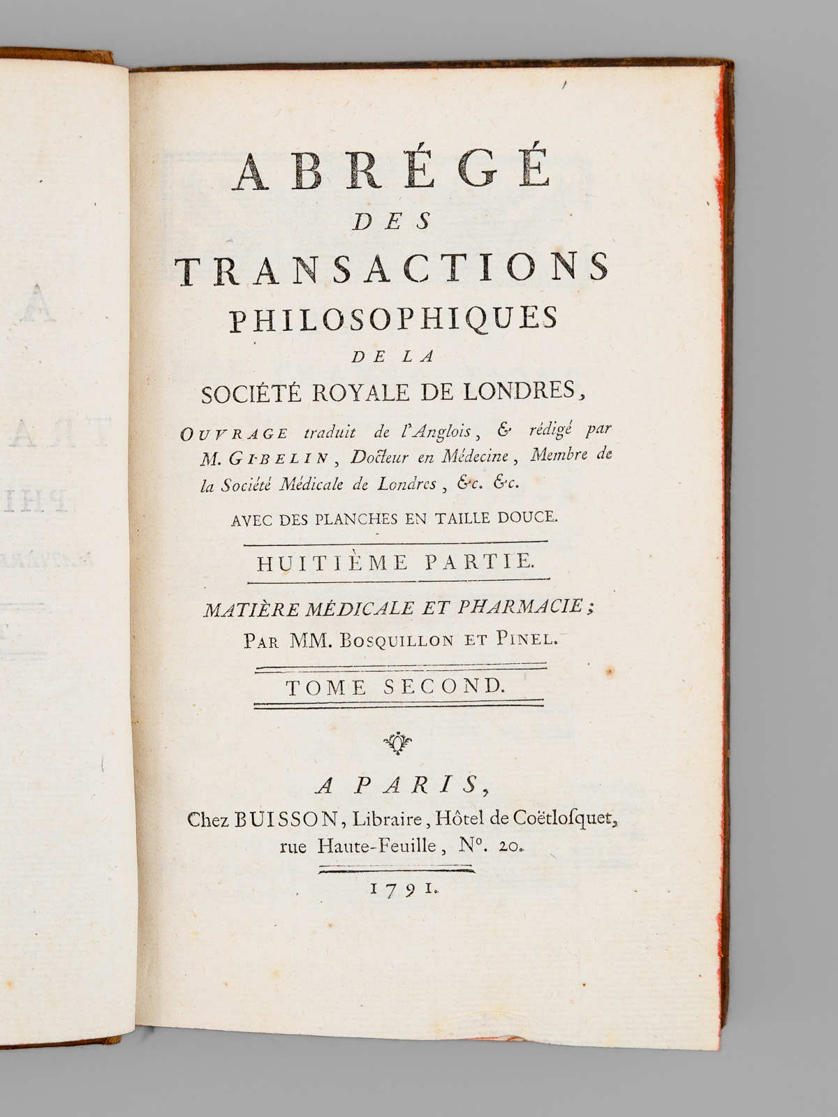 Abrégé des Transactions philosophiques de la Société Royale de Londres. Huitième Partie : Matière Médicale et Pharmacie. Tome Second [ Tome 2 seul ] - Auteur: GIBELIN, Jacques ; BOSQUILLON ; PINEL - Année d'édition: 1791