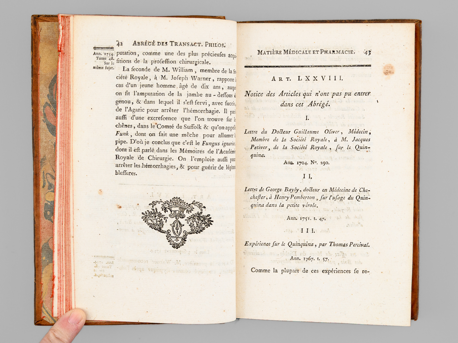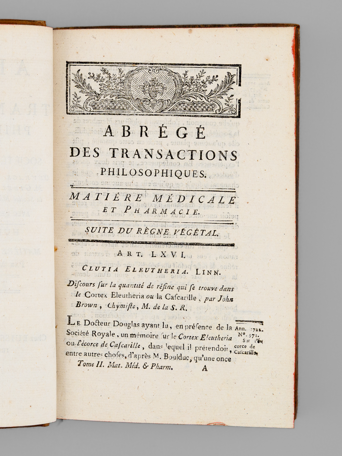 Abrégé des Transactions philosophiques de la Société Royale de Londres. Huitième Partie : Matière Médicale et Pharmacie. Tome Second [ Tome 2 seul ]