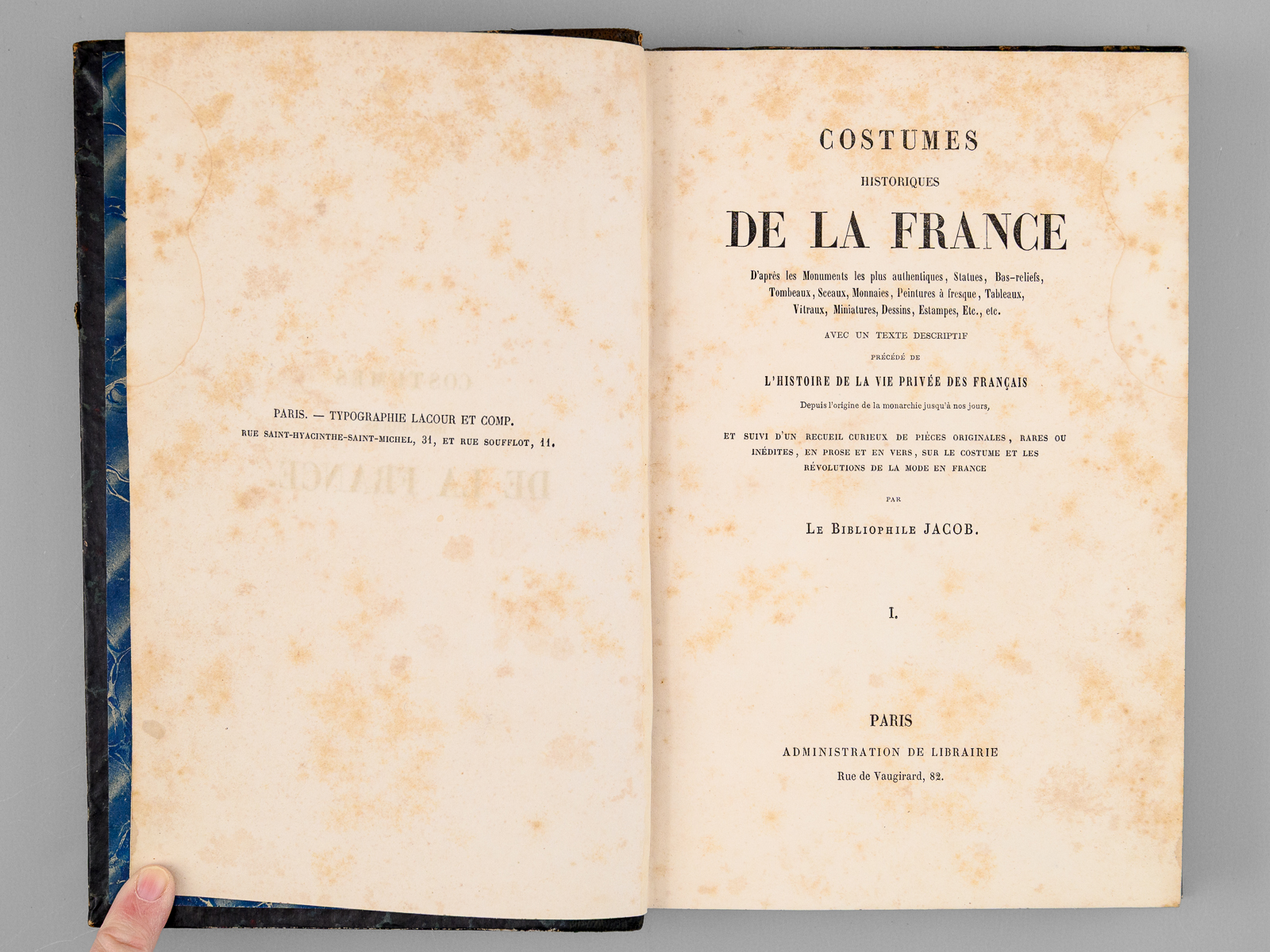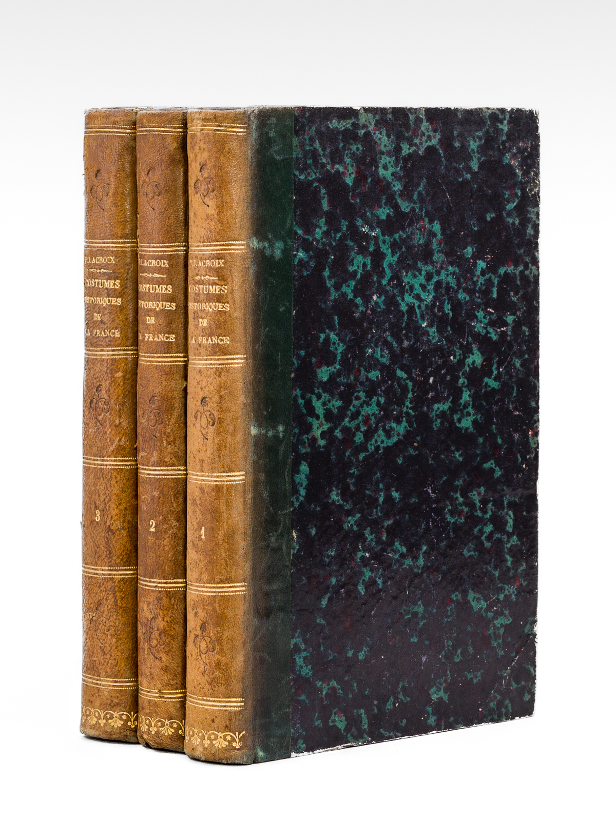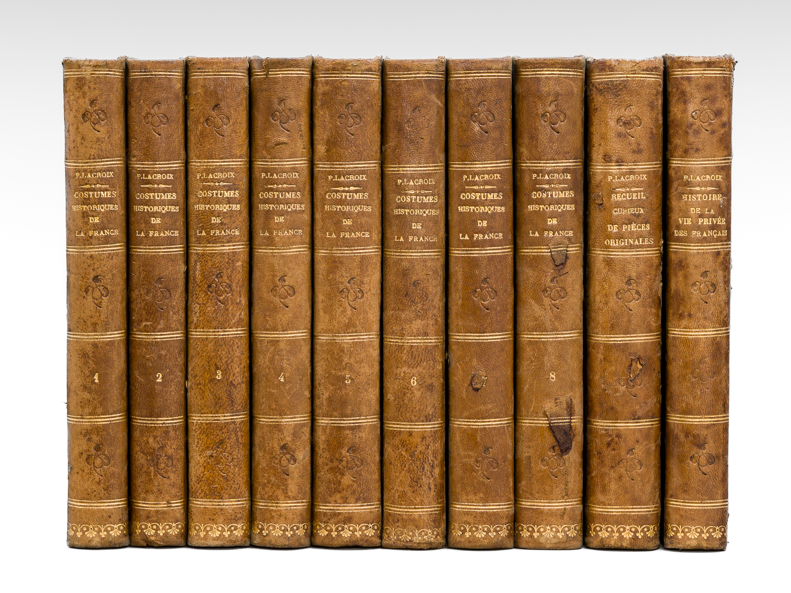 10 vol. in-8 reliure de l'époque demi-basane marron, Administration de Librairie, Paris, s.d. [ 1852 ], 2 ff., 441 pp. rt 1 f. n. ch. 2 ff., 187 pp. avec 80 planches hors texte dont 67 en noir et 13 en couleurs ; 2 ff. 172 pp. avec 80 planches hors texte dont 67 en noir et 13 en couleurs ; 2 ff., 217 pp. avec 80 planches hors texte dont 68 en noir et 12 en couleurs ; 3 ff. 202 pp. avec 80 planches hors texte dont 68 en couleurs et 12 en noir ; 2 ff., 256 pp. avec 80 planches hors texte dont 67 en noir et 13 en couleurs ; 2 ff., 202 pp. et 1 f. n. ch. avec 80 planches hors texte dont 68 en noir et 12 en couleurs ; 2 ff., 214 pp. et 1 f. n. ch. avec 80 planches hors texte dont 68 en noir et 12 en couleurs ; 2 ff. 221 pp. et 1 f. n. ch. avec 80 planches hors texte dont 68 en noir et 13 en couleurs ; 2 ff., 517 pp. Rappel du titre complet : Costumes Historiques de la France (10 Tomes - Complet) D'après les Monuments les plus authentiques, Statues, Bas-reliefs, Tombeaux, Sceaux, Monnaies, Peintures à fresque, Tableaux, Vitraux, Miniatures, Dessins, Estampes, etc. etc. [Contient : ] Histoire de la vie privée des français depuis l'origine de la monarchie jusqu'à nos jours (Introduction) [Suivi de : ] Costumes Historiques de la France (8 Volumes) [Suivi de : ] Recueil curieux de pièces originales rares ou inédites en prose et en vers. Sur le costume et les revolutions de la mode en France.