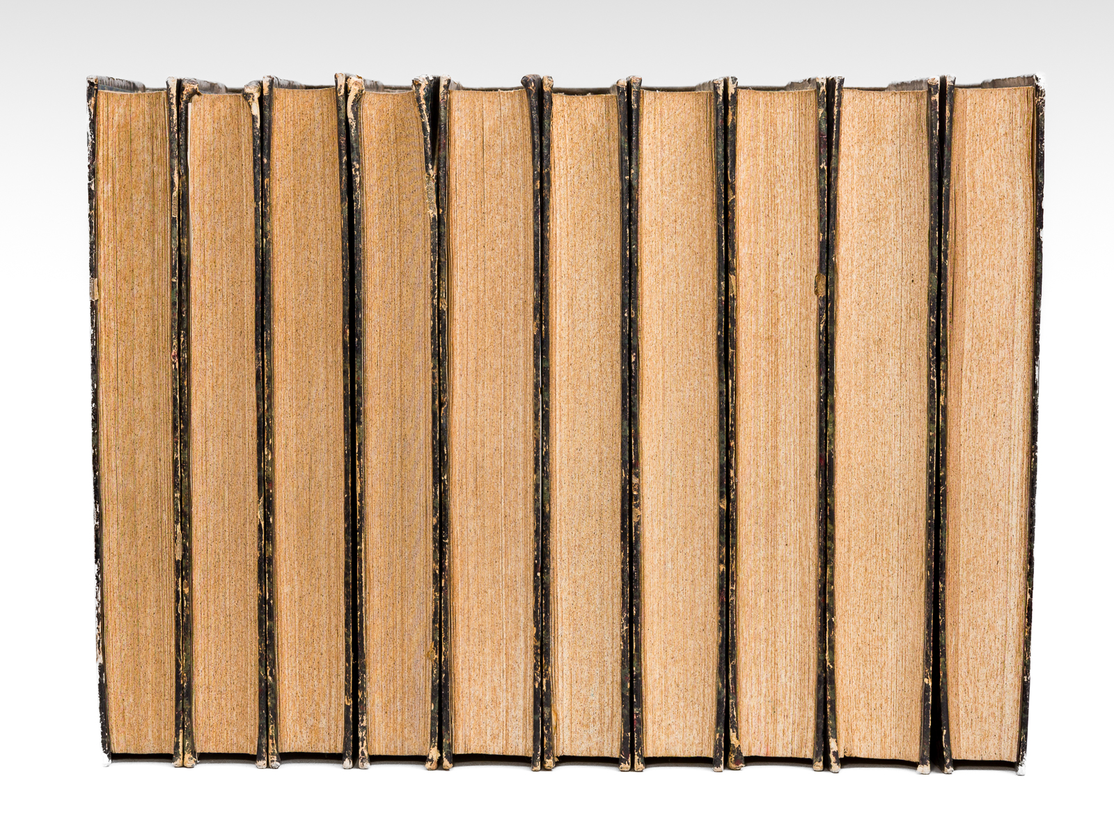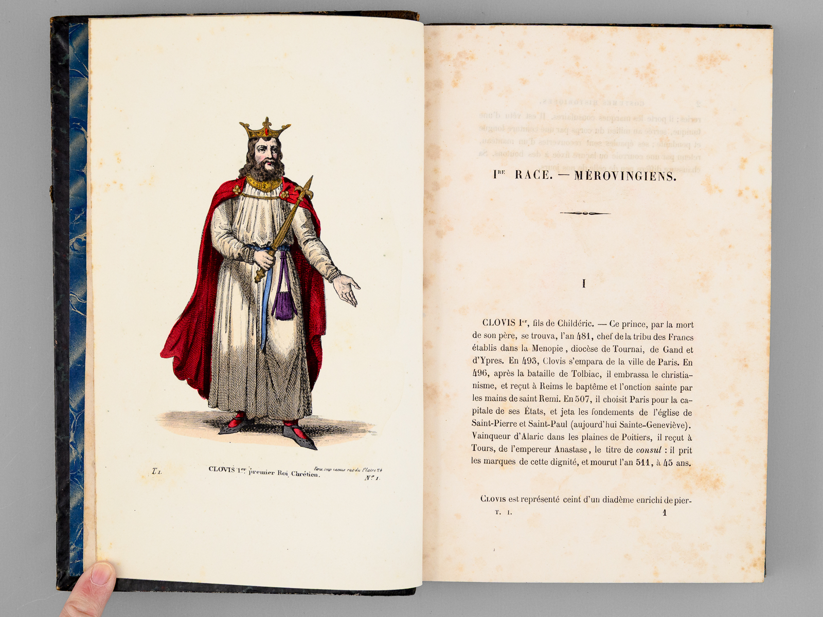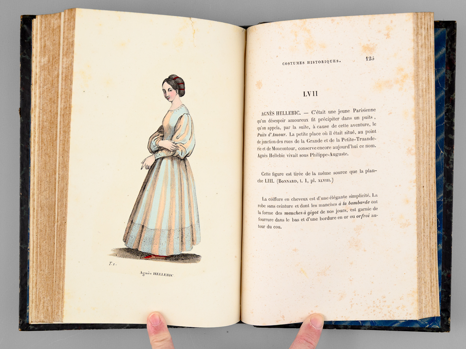 10 vol. in-8 reliure de l'époque demi-basane marron, Administration de Librairie, Paris, s.d. [ 1852 ], 2 ff., 441 pp. rt 1 f. n. ch. 2 ff., 187 pp. avec 80 planches hors texte dont 67 en noir et 13 en couleurs ; 2 ff. 172 pp. avec 80 planches hors texte dont 67 en noir et 13 en couleurs ; 2 ff., 217 pp. avec 80 planches hors texte dont 68 en noir et 12 en couleurs ; 3 ff. 202 pp. avec 80 planches hors texte dont 68 en couleurs et 12 en noir ; 2 ff., 256 pp. avec 80 planches hors texte dont 67 en noir et 13 en couleurs ; 2 ff., 202 pp. et 1 f. n. ch. avec 80 planches hors texte dont 68 en noir et 12 en couleurs ; 2 ff., 214 pp. et 1 f. n. ch. avec 80 planches hors texte dont 68 en noir et 12 en couleurs ; 2 ff. 221 pp. et 1 f. n. ch. avec 80 planches hors texte dont 68 en noir et 13 en couleurs ; 2 ff., 517 pp. Rappel du titre complet : Costumes Historiques de la France (10 Tomes - Complet) D'après les Monuments les plus authentiques, Statues, Bas-reliefs, Tombeaux, Sceaux, Monnaies, Peintures à fresque, Tableaux, Vitraux, Miniatures, Dessins, Estampes, etc. etc. [Contient : ] Histoire de la vie privée des français depuis l'origine de la monarchie jusqu'à nos jours (Introduction) [Suivi de : ] Costumes Historiques de la France (8 Volumes) [Suivi de : ] Recueil curieux de pièces originales rares ou inédites en prose et en vers. Sur le costume et les revolutions de la mode en France.