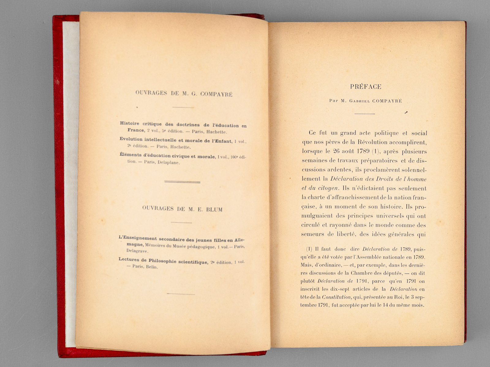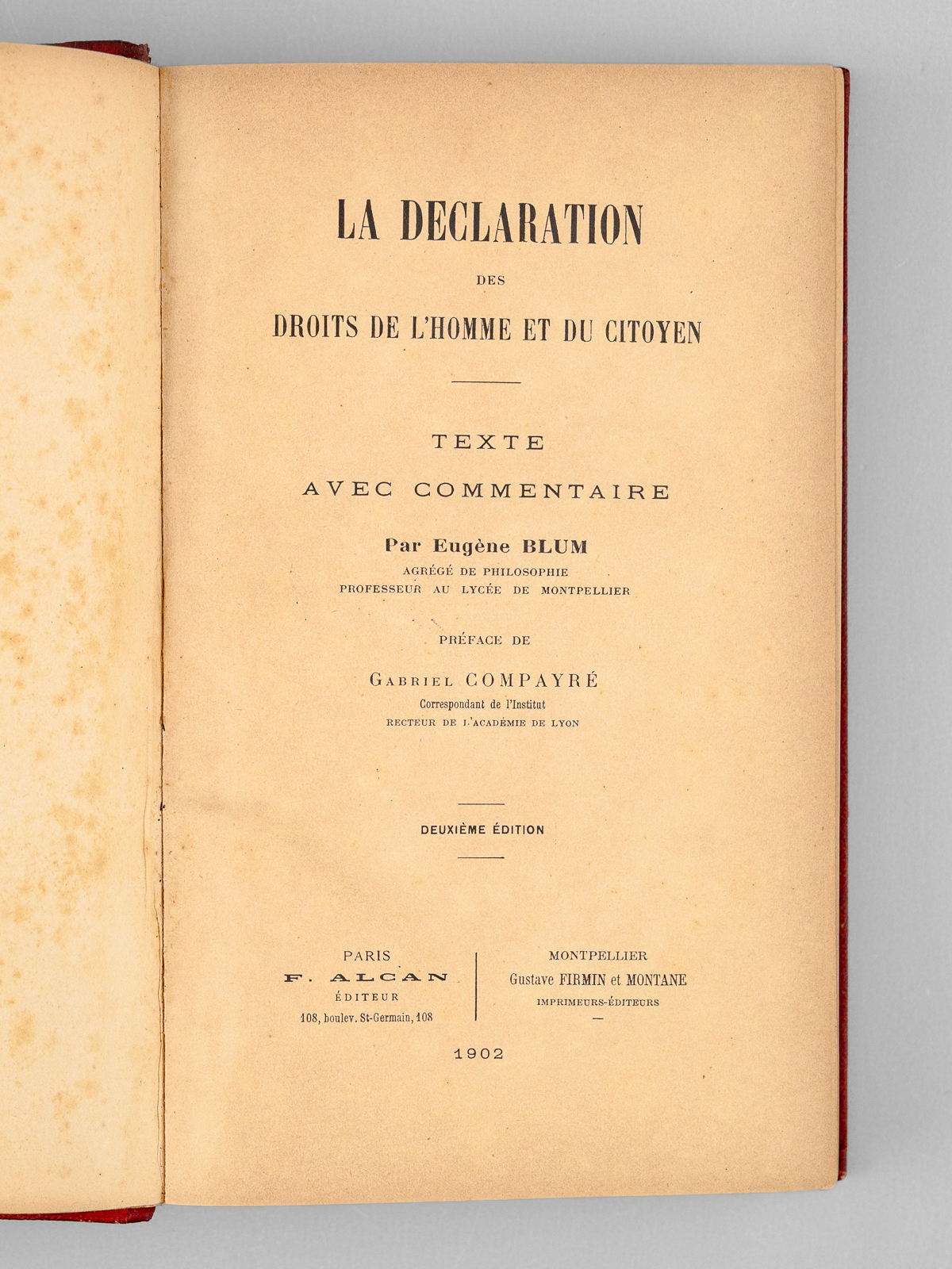 Texte avec Commentaire par Eugène Blum, agrégé de philosophie, professeur au Lycée de Montpellier, préface de Gabriel Compayré, deuxième édition, 1 vol. in-8 reliure demi-chagrin rouge, dos à 5 nerfs orné, toutes tranches dorées, fers de prix municipal de la Ville de Paris en premier plat, F. Alcan, Paris, Gustave Firmin et Montane, Montpellier, 1902, 398 pp.