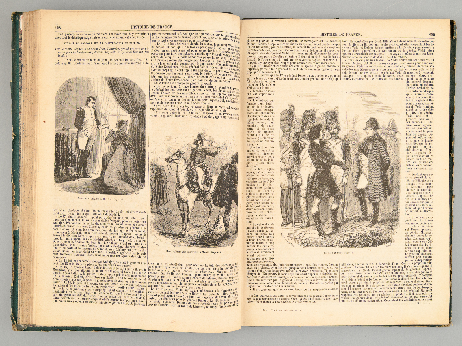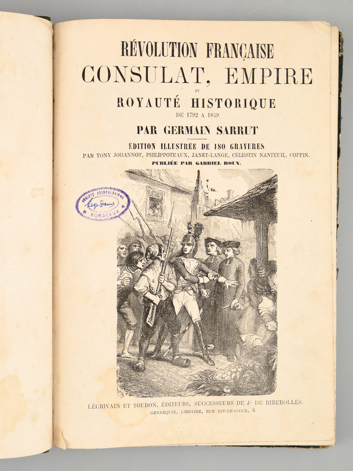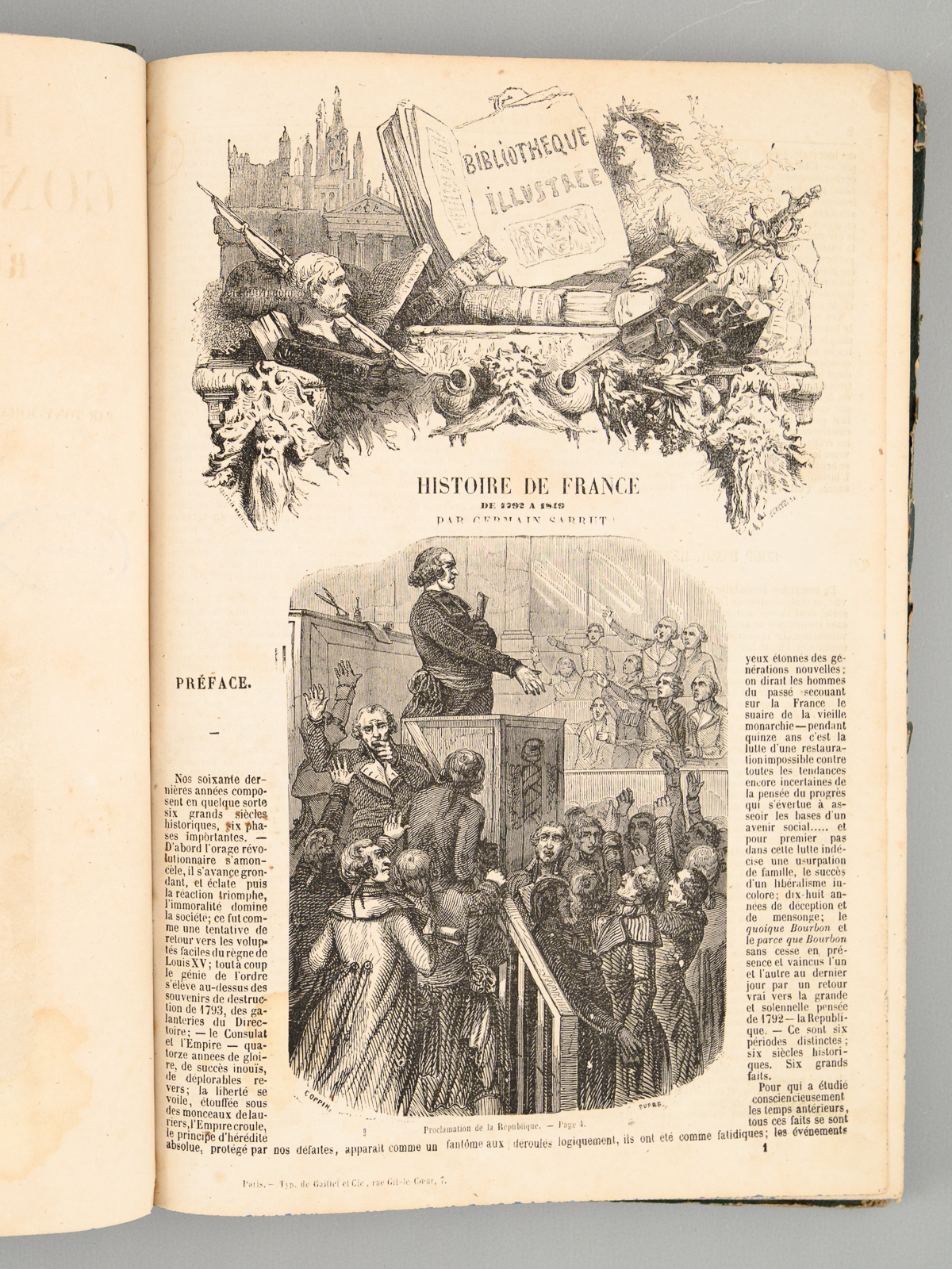 Edition illustrée de 180 gravures par Tony Johannot, Philippoteaux, Janet-Lange, Célestin Nanteuil, Coppin, publiée par Gabriel Roux, 1 vol. in-4 reliure de l'époque demi-basane verte, Lécrivain et Toubon, Successeurs de J. de Riberolles, s.d. [ circa 1849-1850 ],452 pp. Commentaire : Neveu du général Jacques Thomas Sarrut (1765-1813), Germain Sarrut (1800-1883) siègera à l'extrême-gauche de l'Assemblée constituante durant la Seconde République. Etat satisfaisant (coupes fort. frottés, rouss., ancien cachet de société savante, petit accroc à un feuillet) pour ce tirage peu commun. Prix en l'état.
