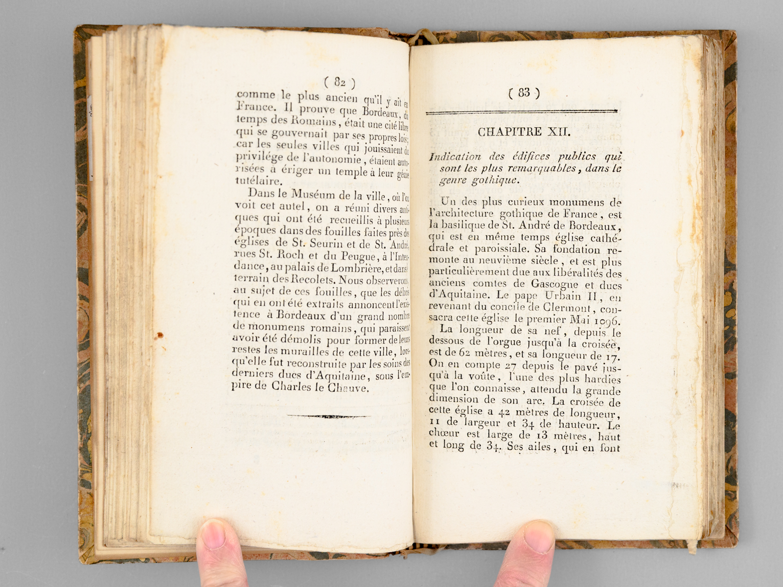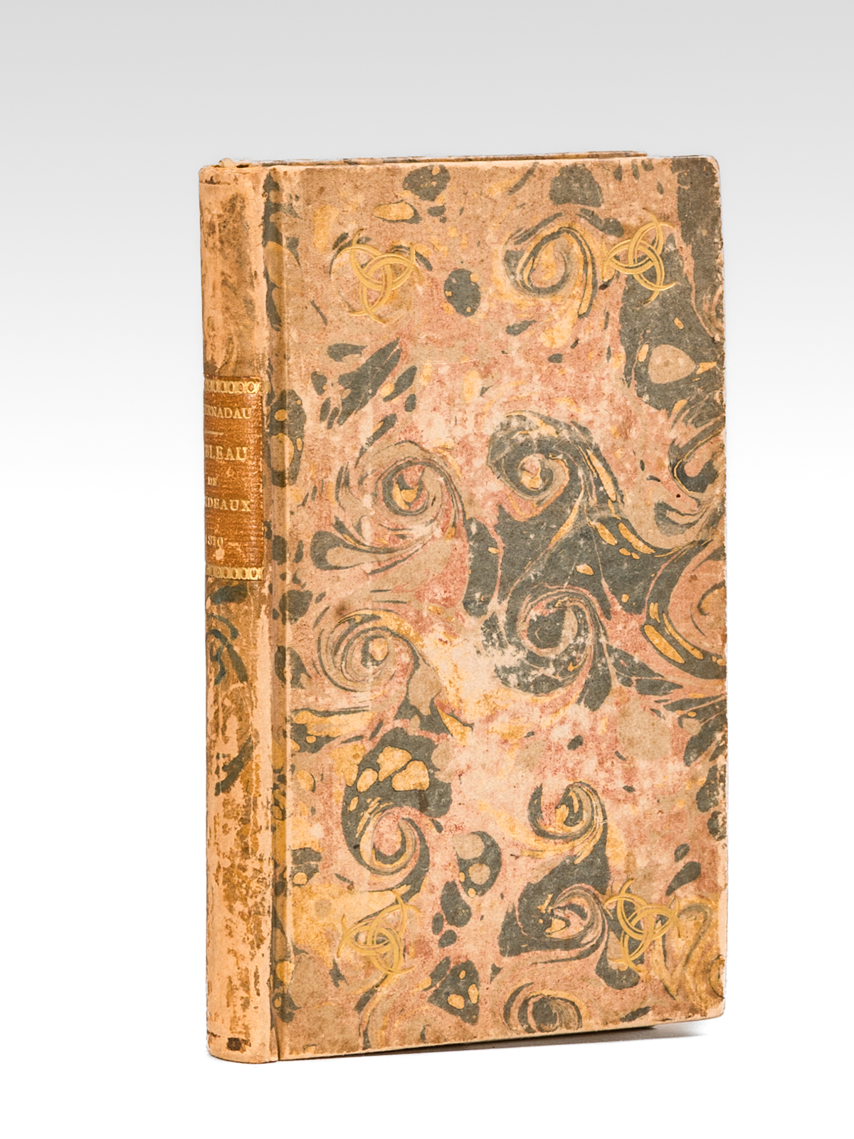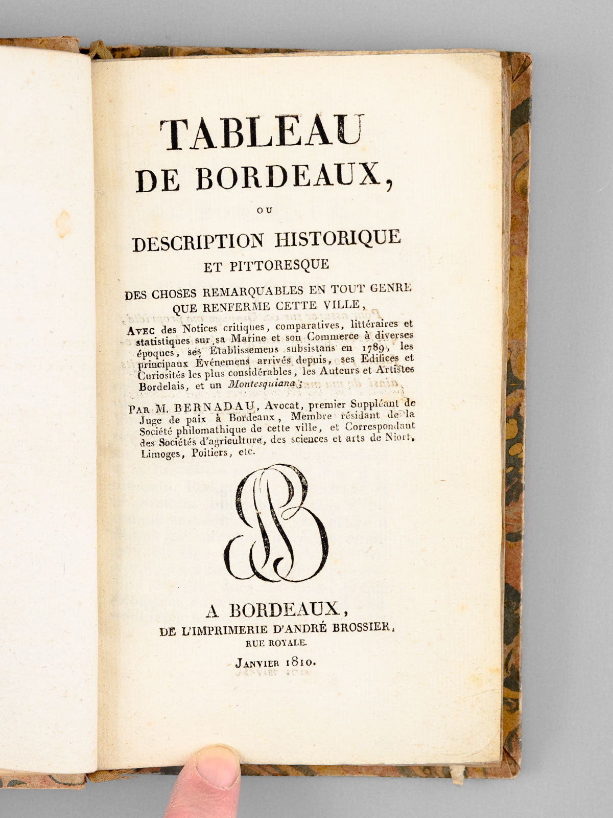 1 vol. in-12 cartonnage bradel postérieur, 3 croissants entrelacés en écoinçoins, couv. conservées, reliure signée de F. Barets, De l'Imprimerie d'André Brossier, Bordeaux, Janvier 1810, 214 pp. Rappel du titre complet : Tableau de Bordeaux, ou Description historique et pittoresque des choses. Avec des notices critiques, comparatives, littéraires et statistiques sur sa Marine et son Commerce à diverses époques, ses Etablissemens subsistans en 1789, les Principaux Evénemen arrivés depuis, ses Edifices et Curiosités les plus considérables, les Auteurs et Artistes Bordelais, et un Montesquiana