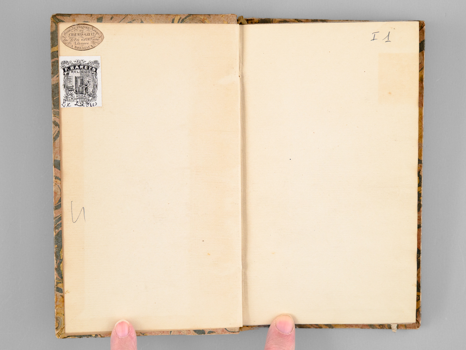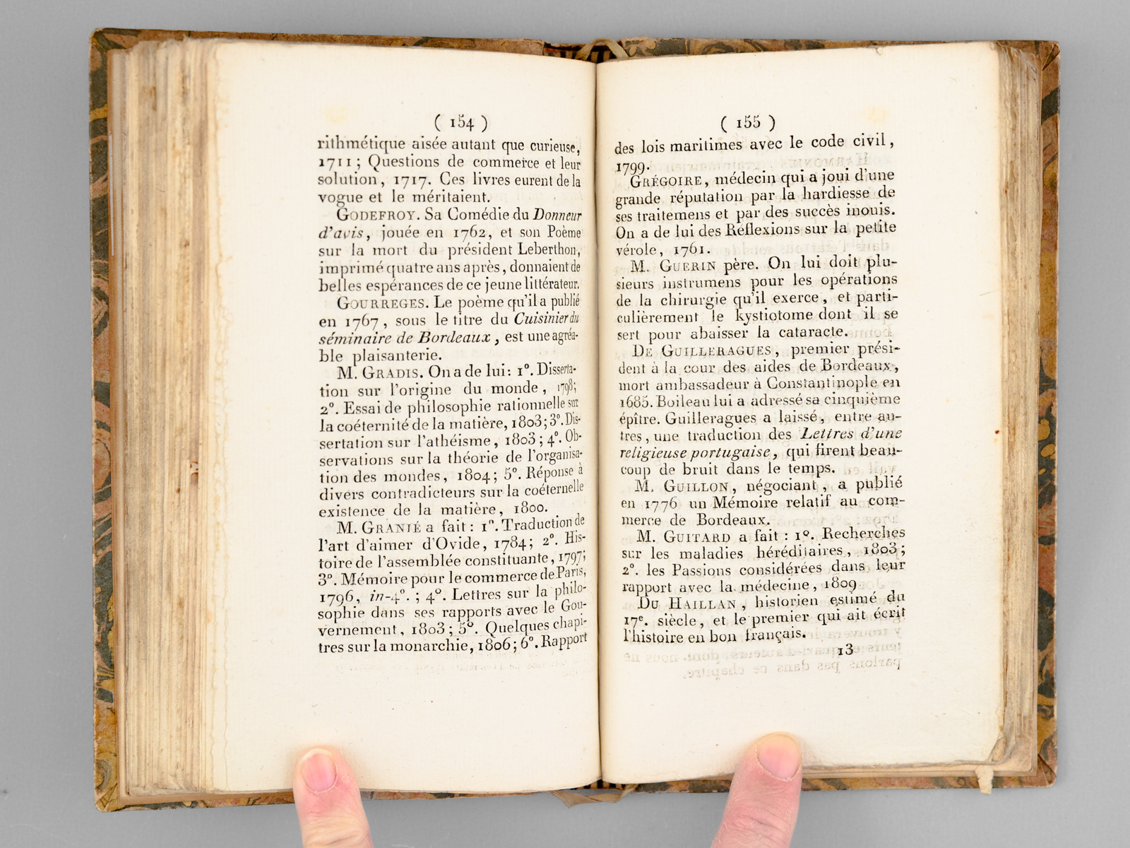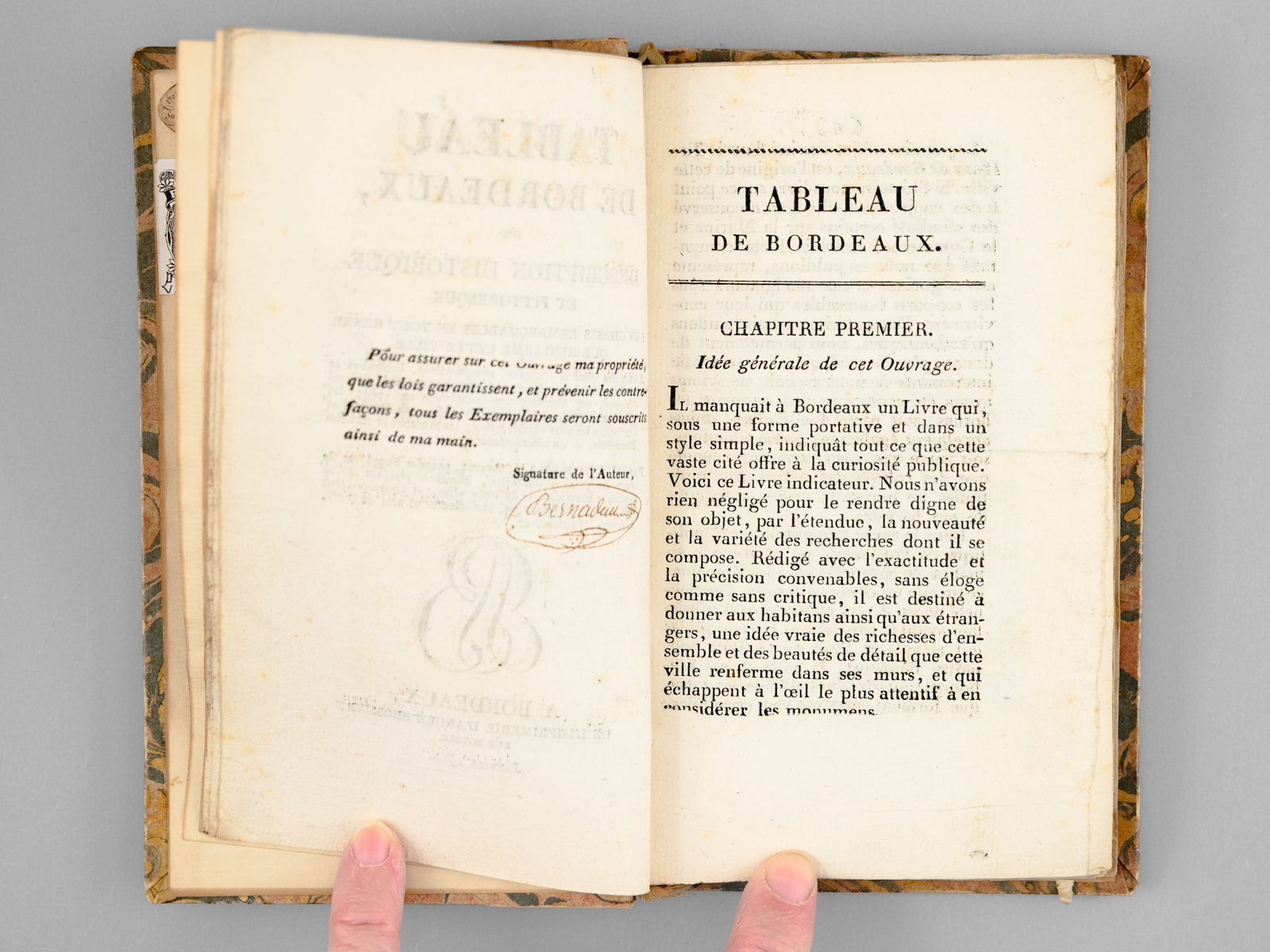 1 vol. in-12 cartonnage bradel postérieur, 3 croissants entrelacés en écoinçoins, couv. conservées, reliure signée de F. Barets, De l'Imprimerie d'André Brossier, Bordeaux, Janvier 1810, 214 pp. Rappel du titre complet : Tableau de Bordeaux, ou Description historique et pittoresque des choses. Avec des notices critiques, comparatives, littéraires et statistiques sur sa Marine et son Commerce à diverses époques, ses Etablissemens subsistans en 1789, les Principaux Evénemen arrivés depuis, ses Edifices et Curiosités les plus considérables, les Auteurs et Artistes Bordelais, et un Montesquiana