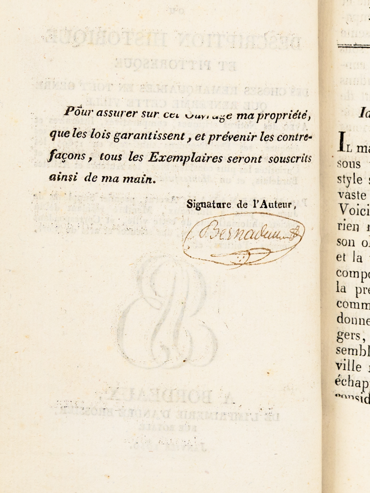 Commentaire : Exemplaire personnel du relieur bordelais F. Barets. Ce 'Tableau de Bordeaux' est une refonte profonde des 'Antiquités bordelaises' publiées par Bernadau en 1797. Bon état (cartonnage frotté mais parfaitement solide, très bon état par ailleurs).