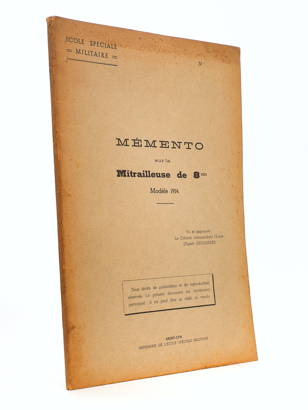 1 vol petit in-4 br., ill. noir et blanc, Imprimerie de l'Ecole Spéciale Militaire, Saint-Cyr, s.d. (1939), 76 pp. Commentaire : Bon état pour ce manuel de formation des élèves officiers français au début de la Seconde Guerre mondiale. Le matériel traité est la mitrailleuse Hotchkiss de 8 mm qui, bien que totalement dépassée en 1940, était toujours en dotation dans l'armée française.