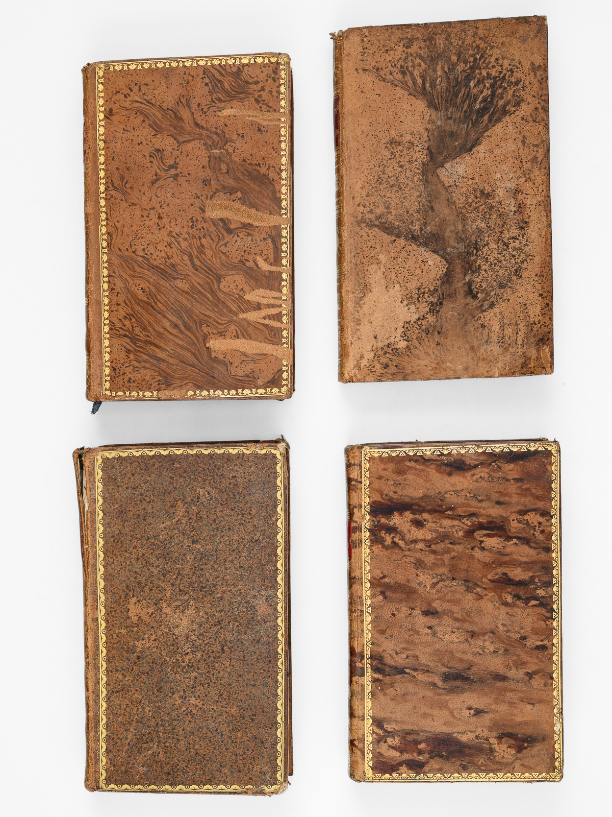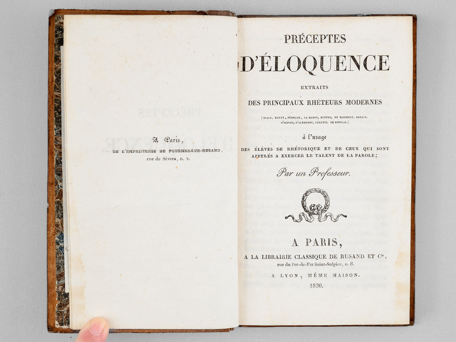 4 volumes à savoir : Fables de Florian: Ornées de 110 figures et d'un portrait, 1 vol. in-12 reliure de l'époque plein veau raciné, dos lisse orné, toutes tranches marbrées, Chez Boiste fils aîné, Libraire, Paris, 1824, avec étiquette de prix en garde (accroc à la zone d'encollage) : Université de France. Académie de Poitiers. Pensionnat de MM. Chevalier. Prix d'écriture décerné à M. Eugène Fromentin A la Rochelle, le 15 7bre [septembre] 1829 - Beautés de Buffon, ou Choix de ses passages les plus remarquables, sous le rapport de la pensée et du style : Par Mme Dufresnoy ; Recueilli et publié pour l'instruction de la Jeunesse. 1 vol. in-12 reliure de l'époque plein veau raciné, dos lisse orné, toutes tranches marbrées, À la Librairie d'Éducation, d'Eug. Balland, et chez A. Eymery, Libraire, Paris, 1826, avec étiquette de prix (décollée, le petit point de cire rouge est encore visible en garde) : COLLEGIUM RUPELLENSE. Arithmeticae Classis. Nos infrà scripti, Collegii Rupellensis Administratores, testamur ingenuum Adolescentem Eugenium Fromentin qui die solemnis habita est premiorum distributio, 2um Compositionis Praemium meritum ac consecutum esse ; in cujus rei fidem, manu propriâ scripsimus. Rupellae, die 20 Augusti, anno 1832, Signatures (dont celle de Callot Aîné) - Préceptes d'éloquence [ Contient : ] Extraits des principaux rhéteurs modernes, À l'usage des élèves de rhétorique et de ceux qui sont appelés à exercer le talent de la parole ; Par un Professeur ; Extraits de (Blair, Maury, Fénelon, La Harpe, Buffon, De Boismont, Rollin, D'olivet, D'alembert, Cérutti, De Besplas), 1 vol. in-12 reliure de l'époque plein veau raciné, dos lisse orné, toutes tranches marbrées, À la Librairie Classique de Rusand et Cie, Paris et Lyon, 1830 avec étiquette de prix (collée en garde): Collège de la Rochelle. Classe de quatrième 2e Prix d'histoire Romaine Décerné à Eugène Fromentin de la Rochelle le 30 Août 1834. Les Membres du Bureau d'Administration, [Signatures : P. Michel, Callot Aîné, Casimir, etc] - Le Petit Plutarque de la jeunesse, ou Abrégé de la vie des grands hommes les plus marquants, tant anciens que modernes dont les exemples peuvent intéresser et instruire tous les lecteurs ; Rédigés d'après Rollin, Fénelon, etc. ; Avec figures, 1 vol. in-12 reliure de l'époque plein veau raciné, dos lisse orné, toutes tranches marbrées, Thériot, Libraire, Paris, 1827, étiquette de prix (décollée) : « Collège de la Rochelle. Classe de quatrième 1er Prix d'Excellence Décerné à Eugène Fromentin de la Rochelle le 30 Août 1834. Les Membres du Bureau d'Administration, [Signatures : P. Michel, Callot Aîné, etc...]