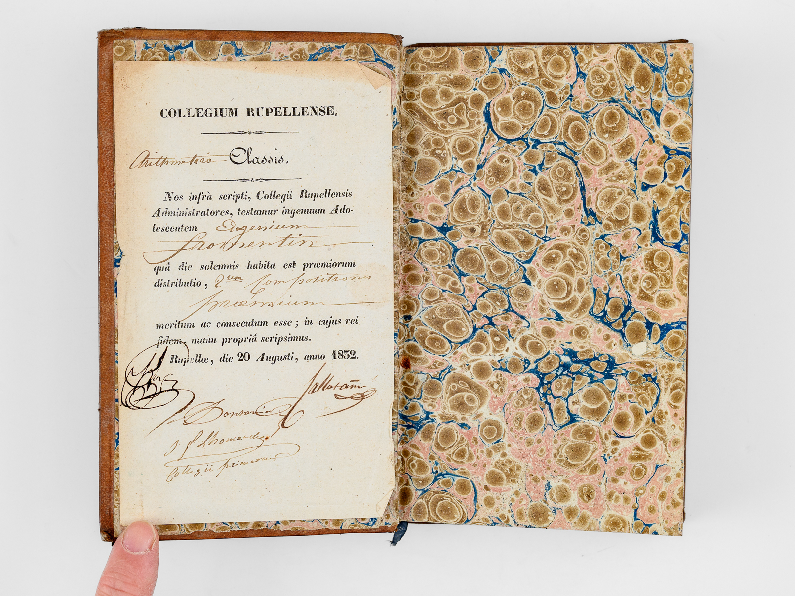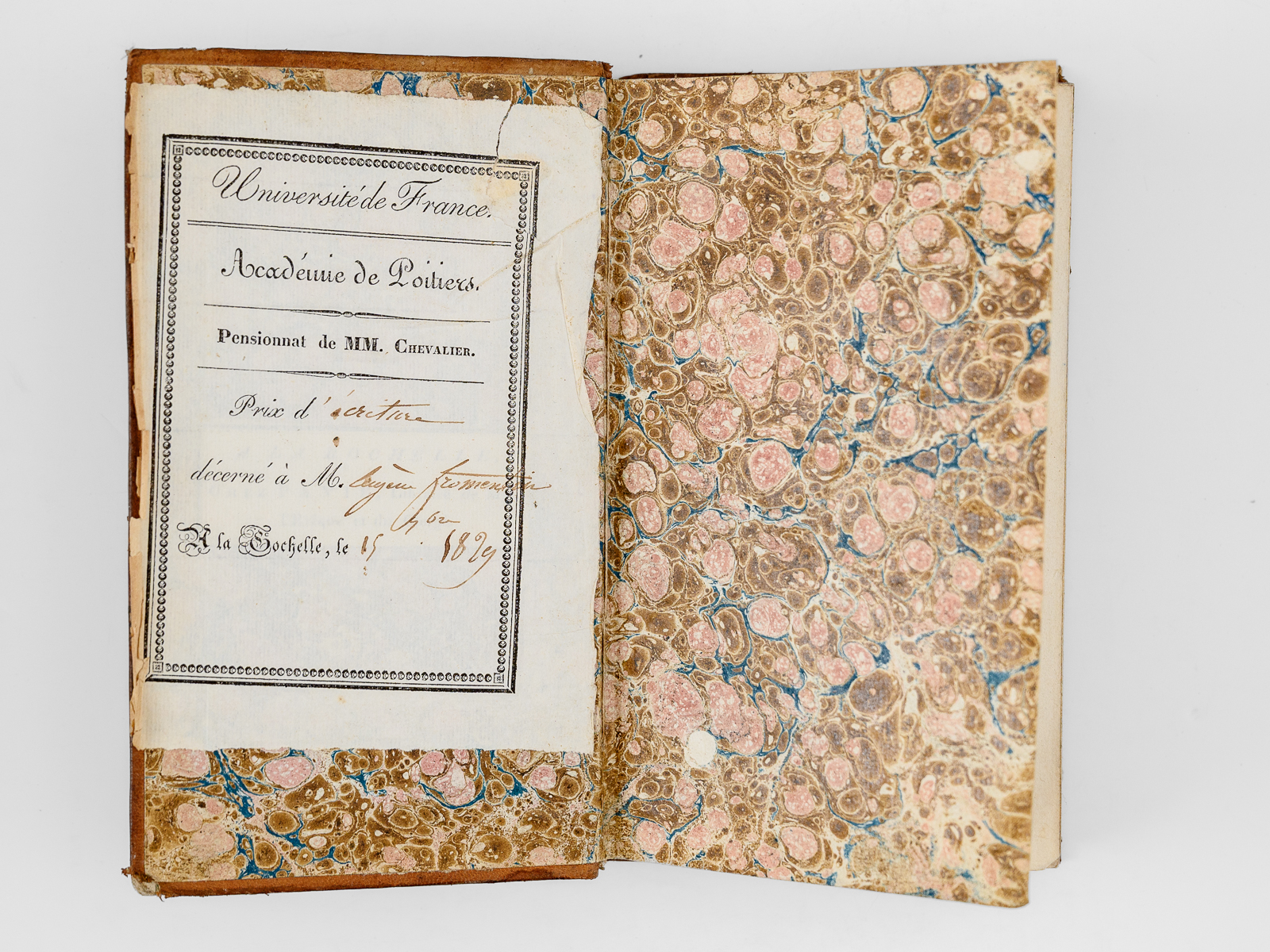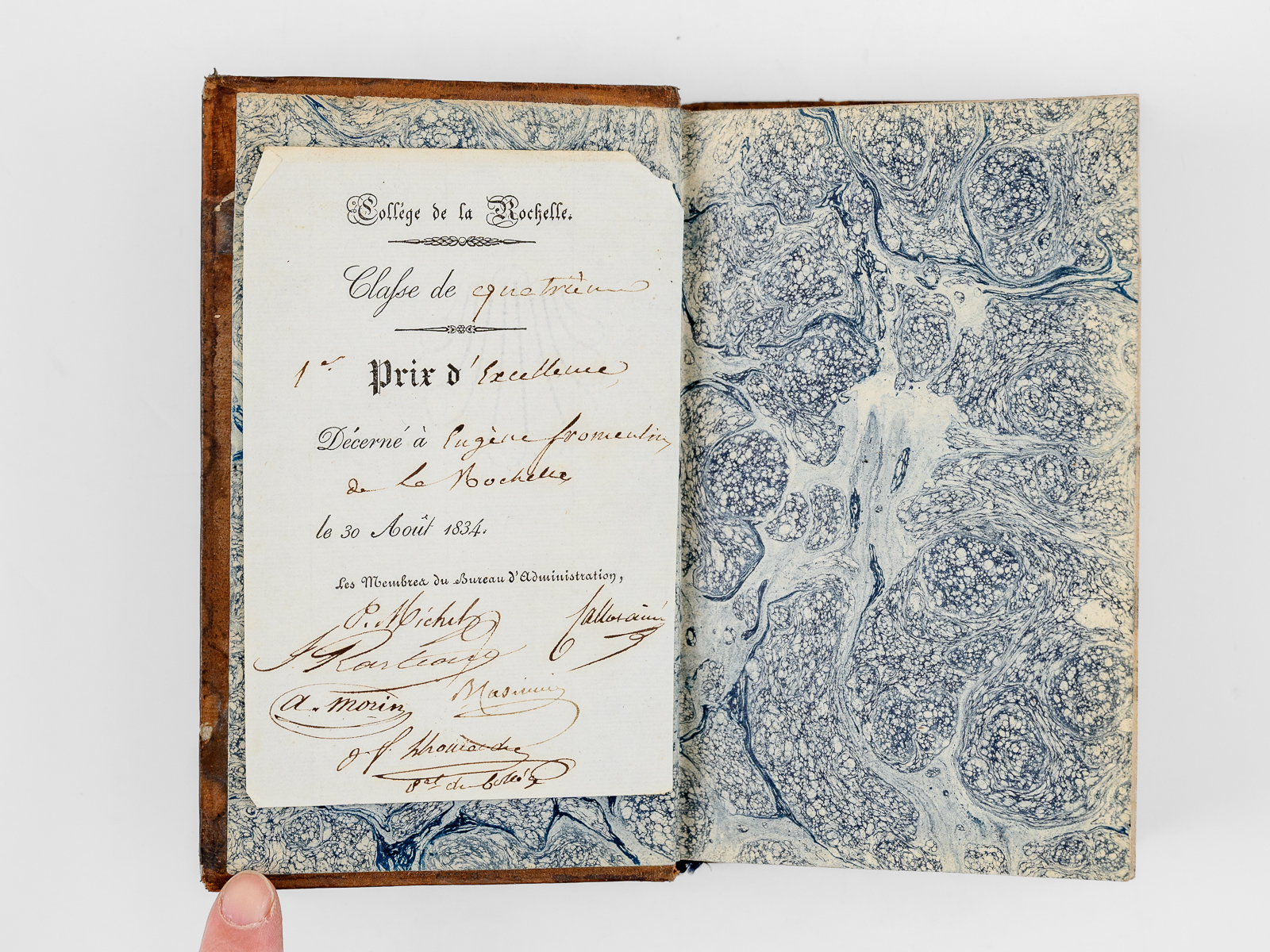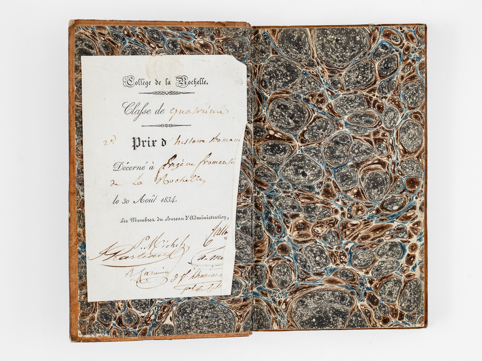 Commentaire : Très rare ensemble réunissant 4 ouvrages offerts en prix scolaire à La Rochelle, en 1829, 1832 et 1834, au futur peintre et écrivain Eugène Fromentin (1820-1876). Le premier volume provient du pensionnant de MM. Chevalier, les autres du collège de la Rochelle. Brillant élève, Eugène Fromentin est ici récompensé des prix d'écriture, d'arithmétique, d'histoire romaine, et du 1er prix d'Excellence pour la classe de quatrième. Les étiquettes de prix sont signées par plusieurs notabilités locales, dont 'Callot aîné maire' (Pierre Simon Callot, maire de La Rochelle de 1830 à 1834). Etat satisfaisant (usures diverses avec manques en coiffes, usures en coins, fente partielle en mors aux « Fables de Florian). Prix du lot, non séparable.