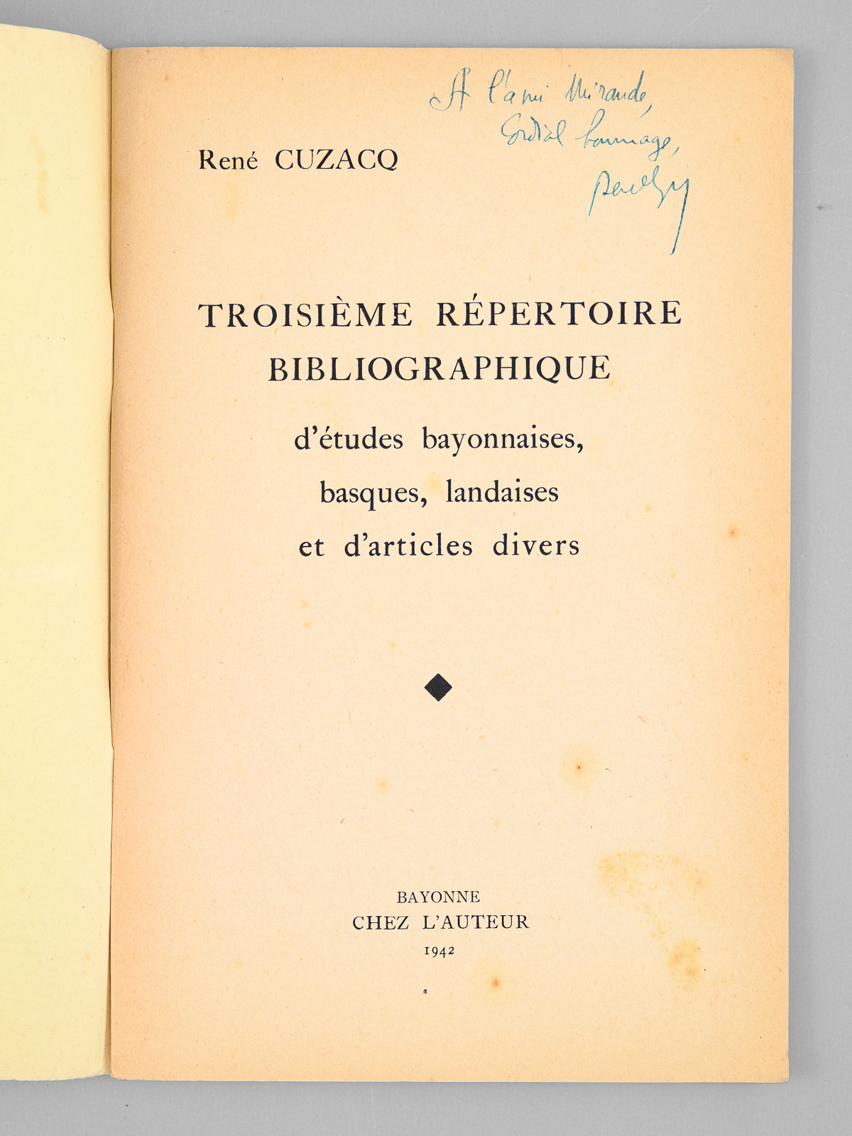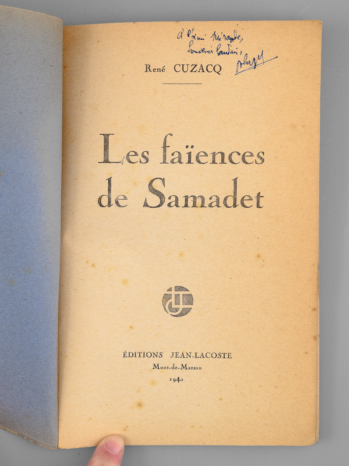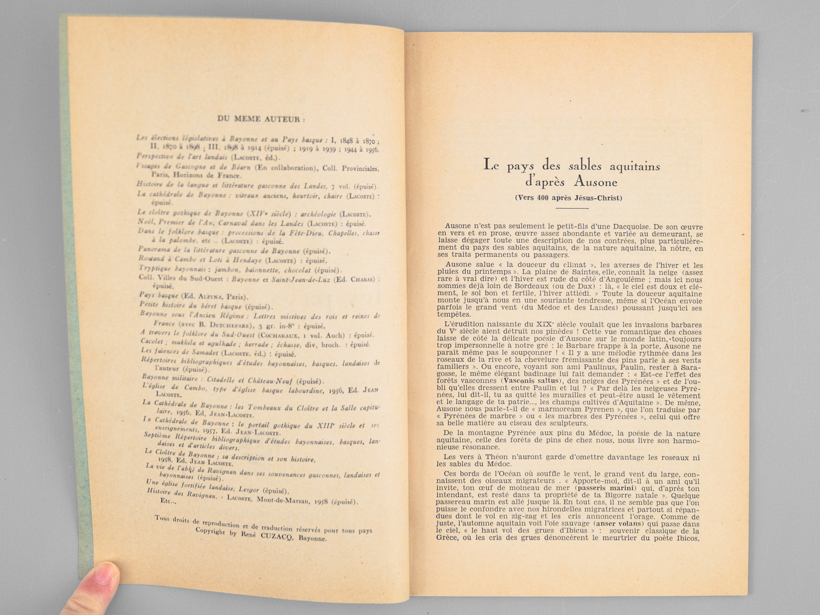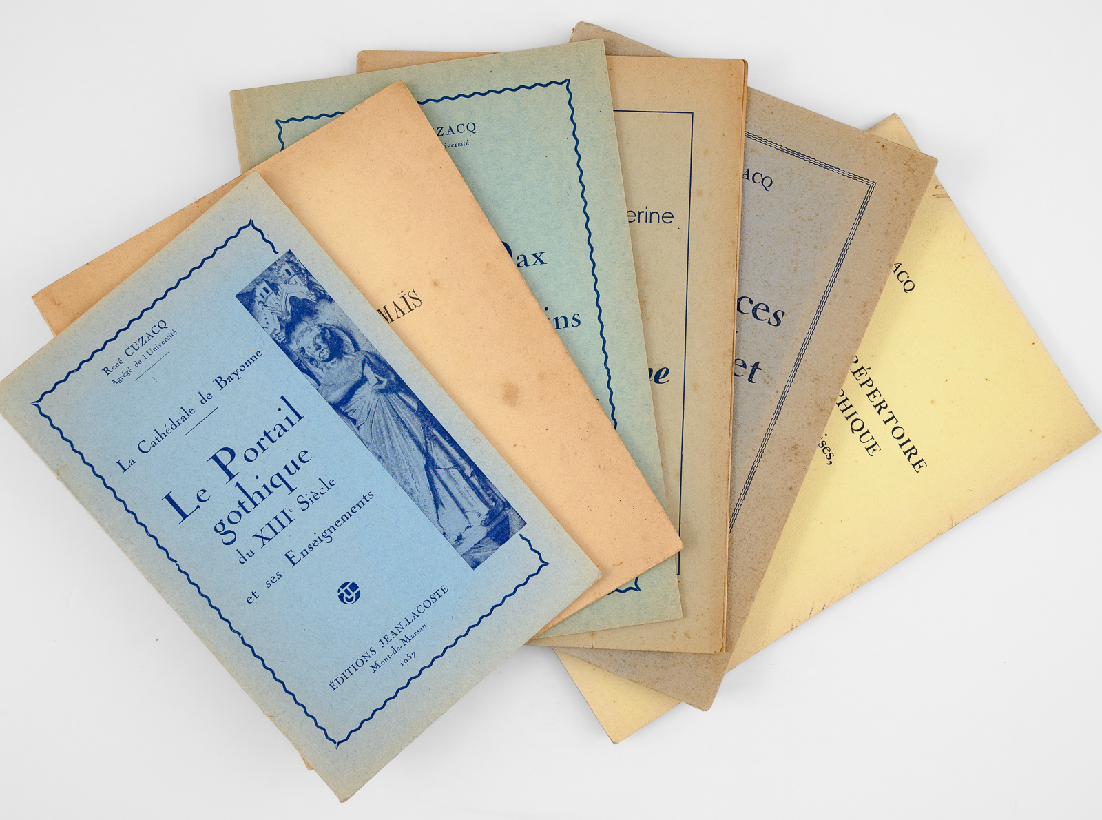 6 brochures in-12 et in-, Les faïences de Samadet, Editions Jean Lacoste, 1940, 73 pp. [ On joint : ] Origines de la Culture du Maïs en Gascogne, Imprimerie F. Cocharaux, Auch, 1952, 38 pp. [ On joint : ] Le Père Cloche (1628-1720) Une Gloire Saint-Séverine méconnue, tiré-à-part de la Société de Borda [ On joint : ] Ausone,Dax et les pays aquitains. Les origines dacquoises du rhéteur Arborius, Editions Jean Lacoste, 1960 [ On joint : ] Troisième Répertoire bibliographique d'études bayonnaises, basques, landaises et d'articles divers, Chez l'Auteur, Bayonne, 1942, 37 pp. [ On joint : ] La Cathédrale de Bayonne. Le portail gothique du XIIIe Siècle et ses Enseignements, Editions Jean Lacoste, 1957, 67 pp.