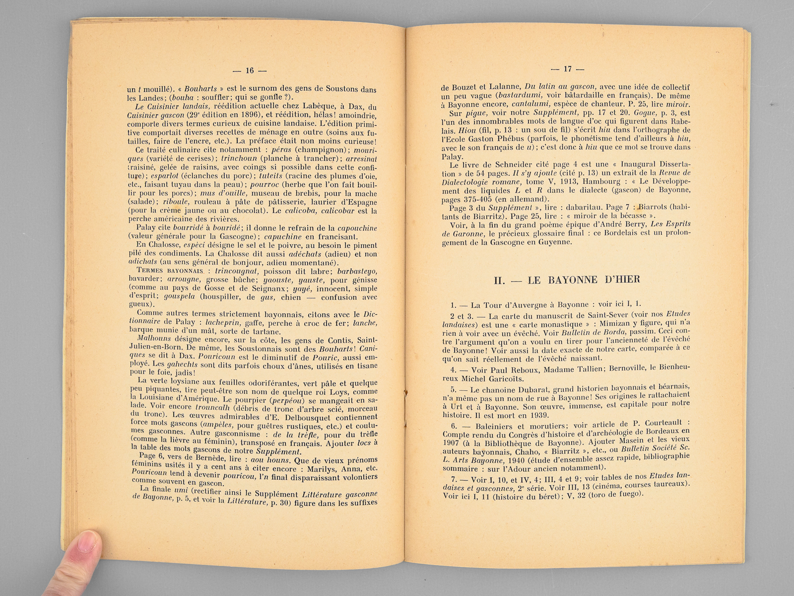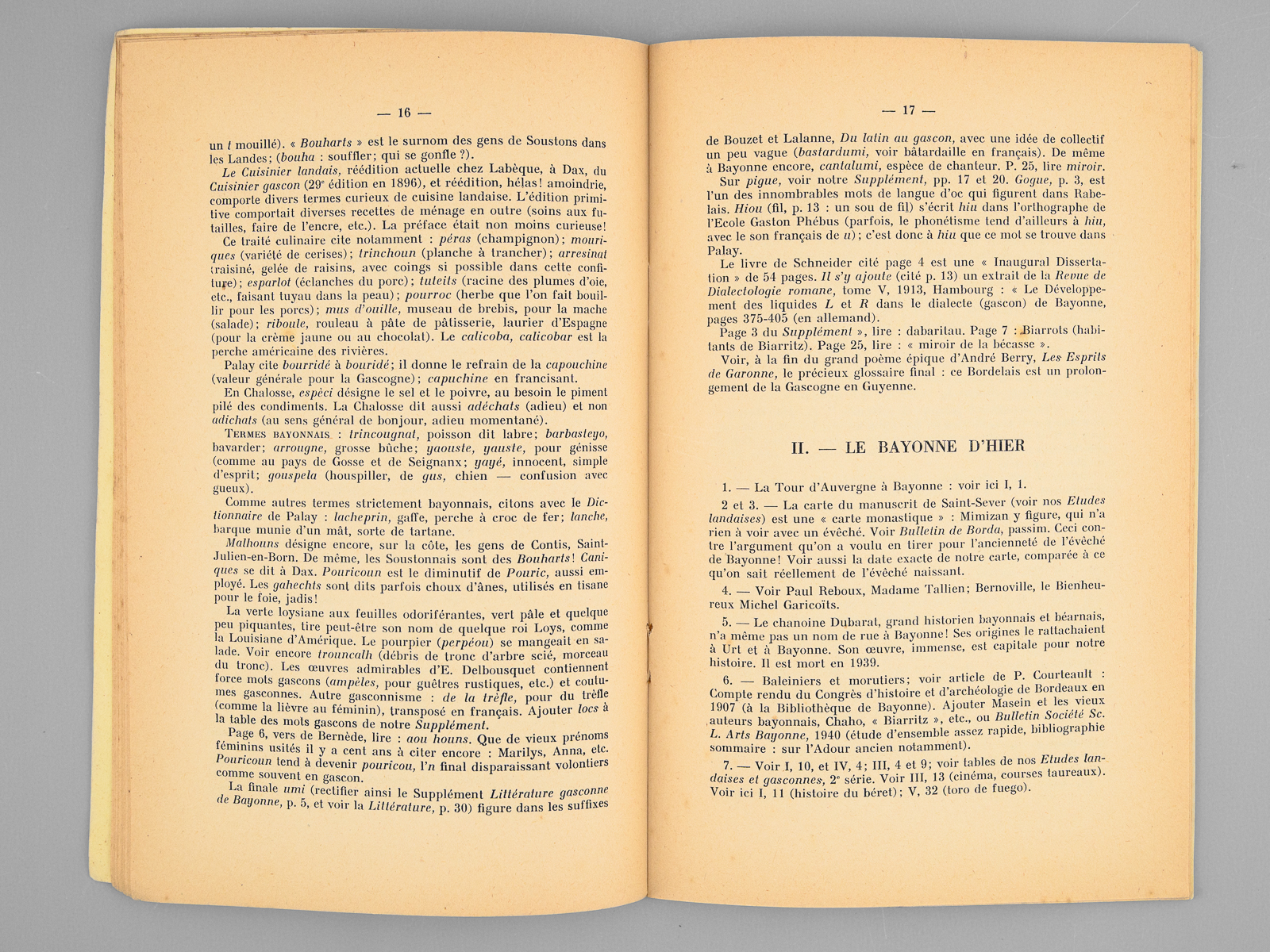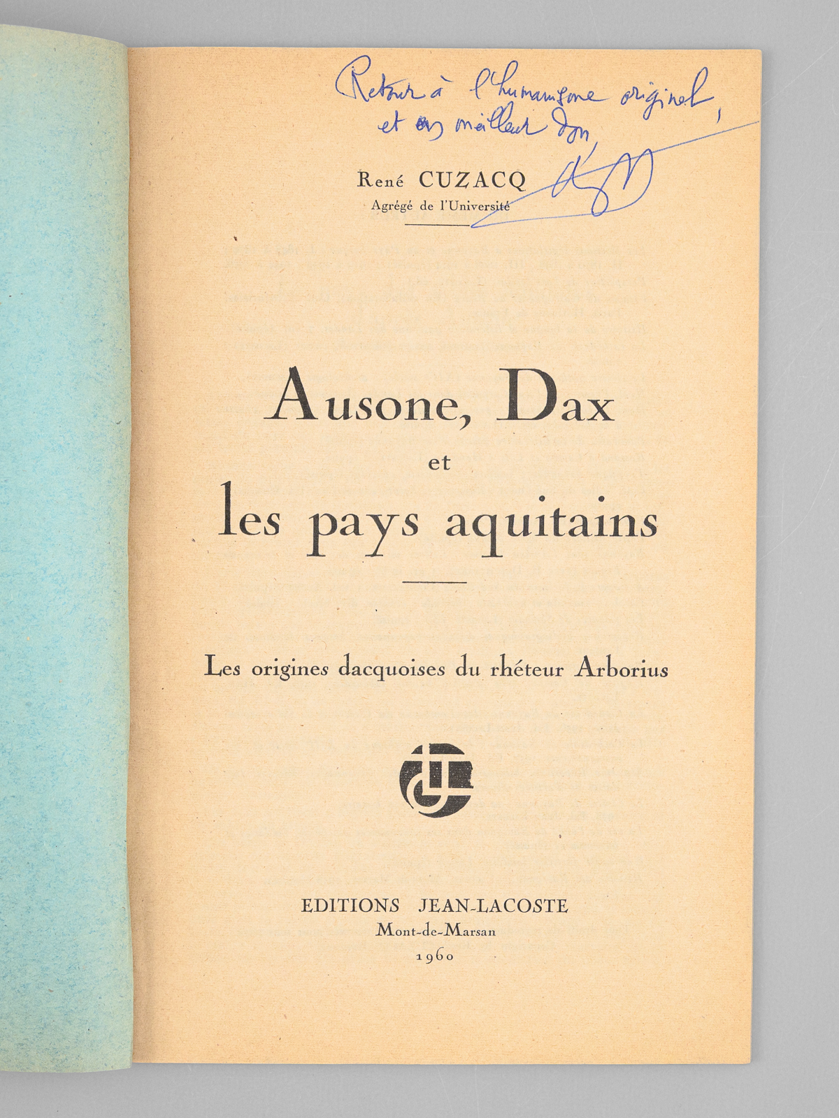 6 brochures in-12 et in-, Les faïences de Samadet, Editions Jean Lacoste, 1940, 73 pp. [ On joint : ] Origines de la Culture du Maïs en Gascogne, Imprimerie F. Cocharaux, Auch, 1952, 38 pp. [ On joint : ] Le Père Cloche (1628-1720) Une Gloire Saint-Séverine méconnue, tiré-à-part de la Société de Borda [ On joint : ] Ausone,Dax et les pays aquitains. Les origines dacquoises du rhéteur Arborius, Editions Jean Lacoste, 1960 [ On joint : ] Troisième Répertoire bibliographique d'études bayonnaises, basques, landaises et d'articles divers, Chez l'Auteur, Bayonne, 1942, 37 pp. [ On joint : ] La Cathédrale de Bayonne. Le portail gothique du XIIIe Siècle et ses Enseignements, Editions Jean Lacoste, 1957, 67 pp.